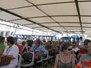 I woke up at 6:30AM. Renée woke up when At 6:45AM the loudest noise yet occurred, which I guess were the anchors dropping. Then a few minutes later I guess anchors dropped at the back of the ship too. Oh well only a few minutes to go to the alarm. Eventually we got up and headed off to breakfast at 7:35AM. Afterwards we nipped up to Deck 15 to look around. What a view! We were parked in the caldera inside a ring of islands (the biggest being Thera with the iconic town of Fira with its white buildings perched on top of the cliff), with a big lump of jagged lava for the central islands of Nea Kameni and Palea Kameni. By 8:20AM we had grabbed our stuff and gone to the Equinox Theater to await the Volcano Hiking & Swimming In Hot Springs Tour.