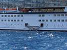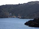Thrusters firing up underneath Deck 15 Fwd as we prepare to depart. | Sailing away from Fira. | A view of the main port at Athinios, to the South of Fira. | A silhouetted Nea Kameni looks even more dark and imposing than before. | A sheltered cove on the South side of Nea Kameni. | Looking West along the South coast of Nea Kameni, with Aspronisi lying beyond. |