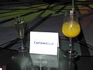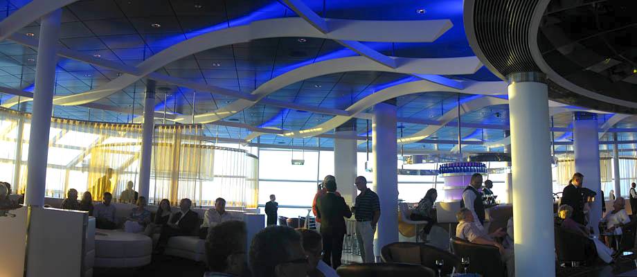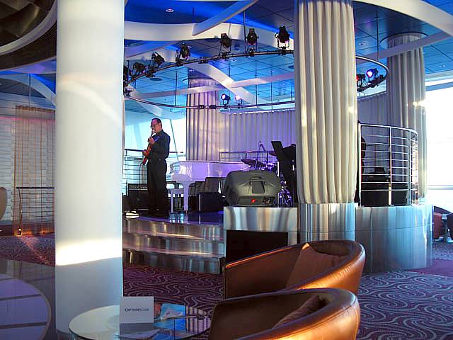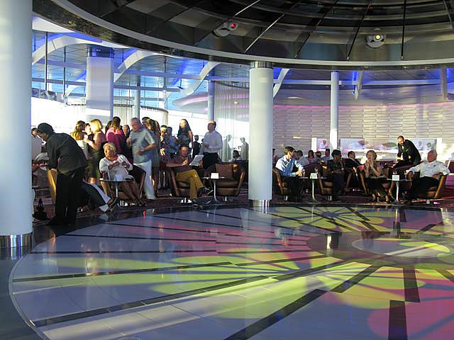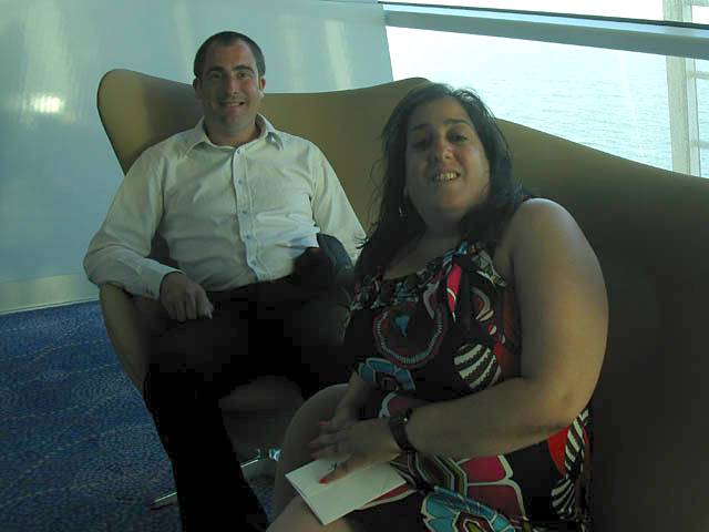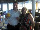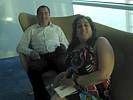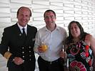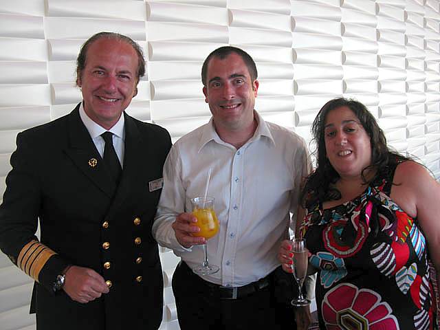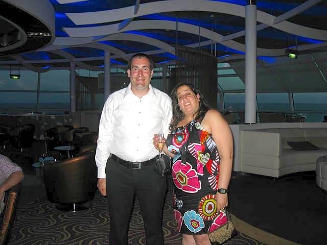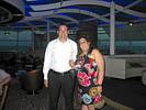Waiting in some funky chairs for the Sky Lounge to open up. | Mike and Renée with drinks at the cocktail party. | The Captain, Michael Karatzas, kindly lets us take a picture with him. | Looking around the Sky Lounge as the party gets busier. |