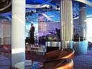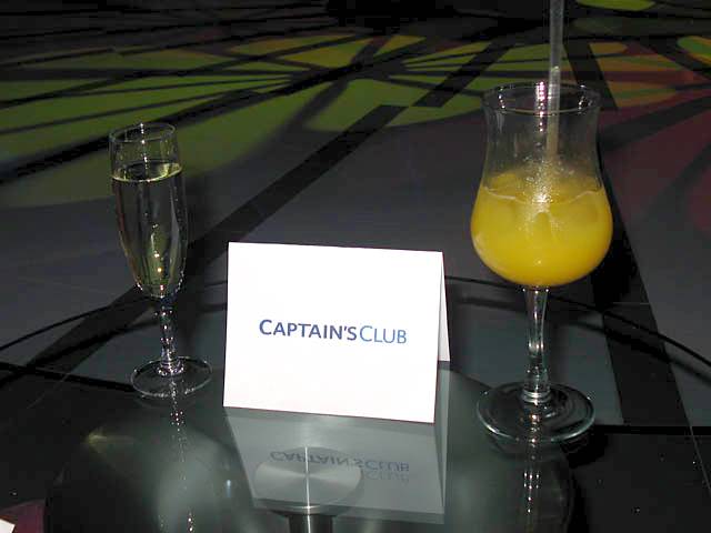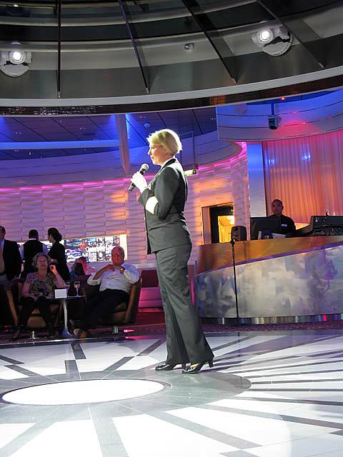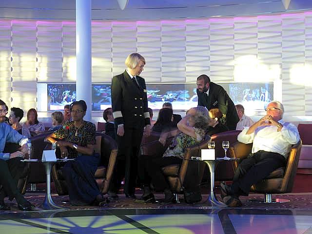 Senior crew members mingling with guests. | The moody lighting and design of the Sky Lounge is rather nice, especially with the added glow of an approaching sunset . | A speech by a senior crew member. | Captain's Club drinks. | Sunset. |