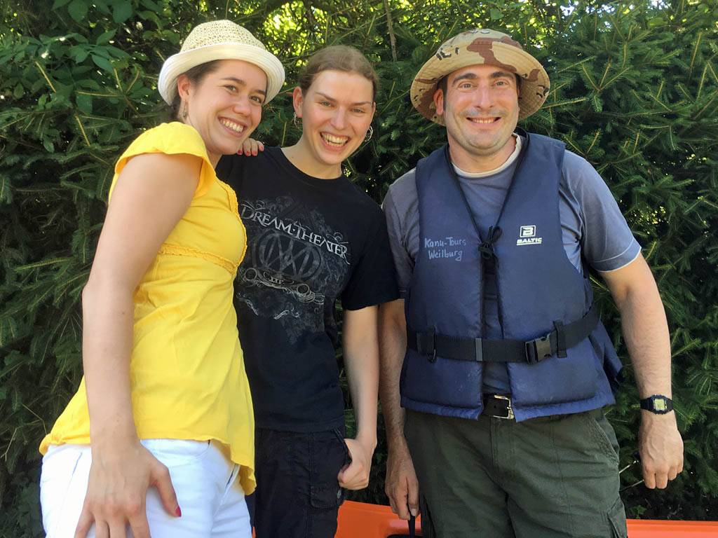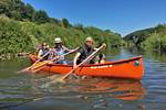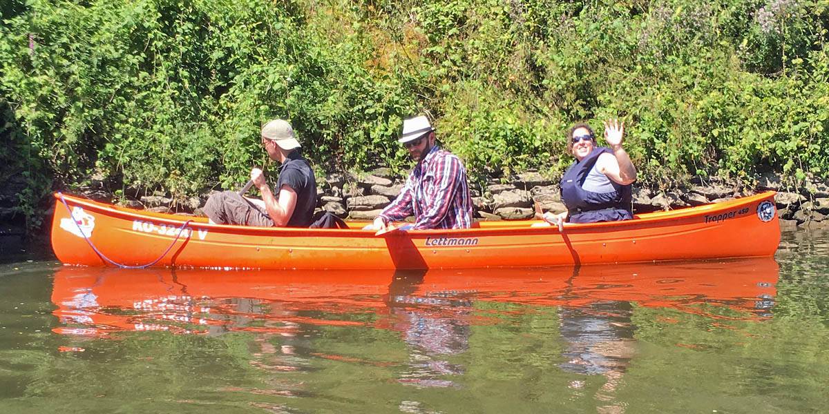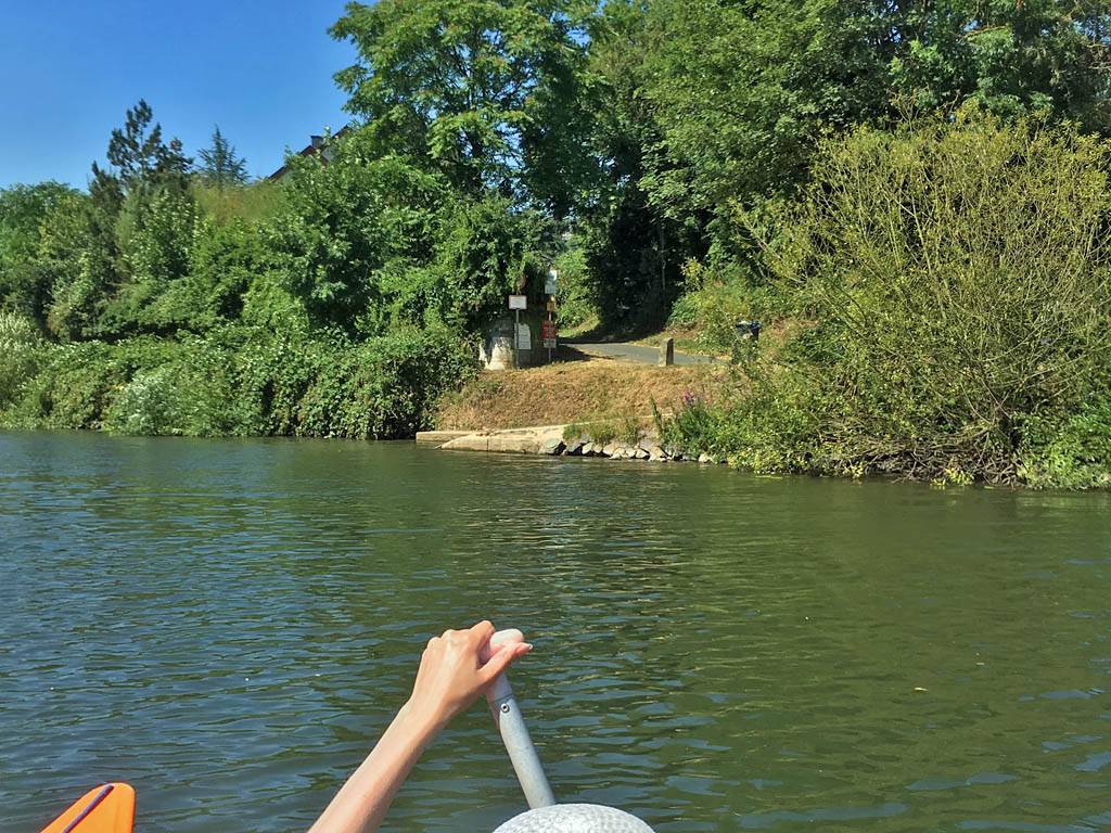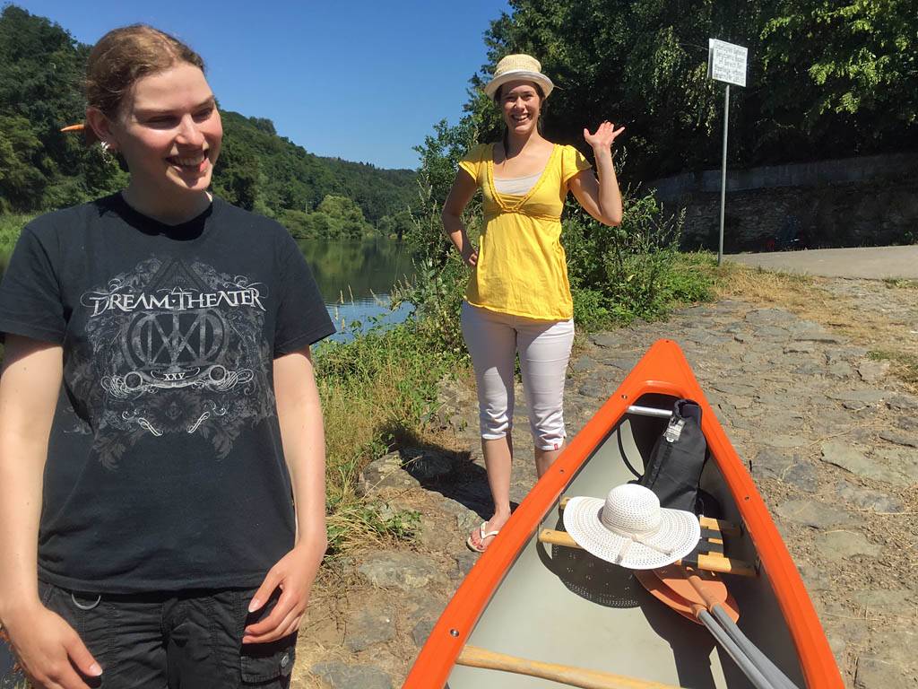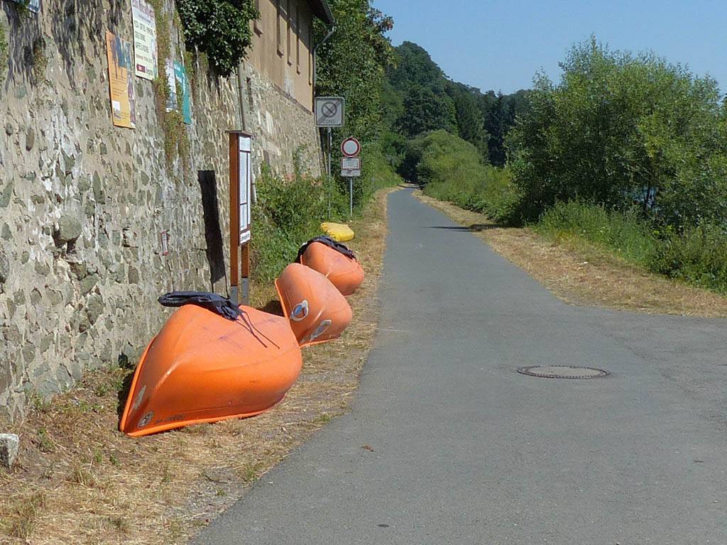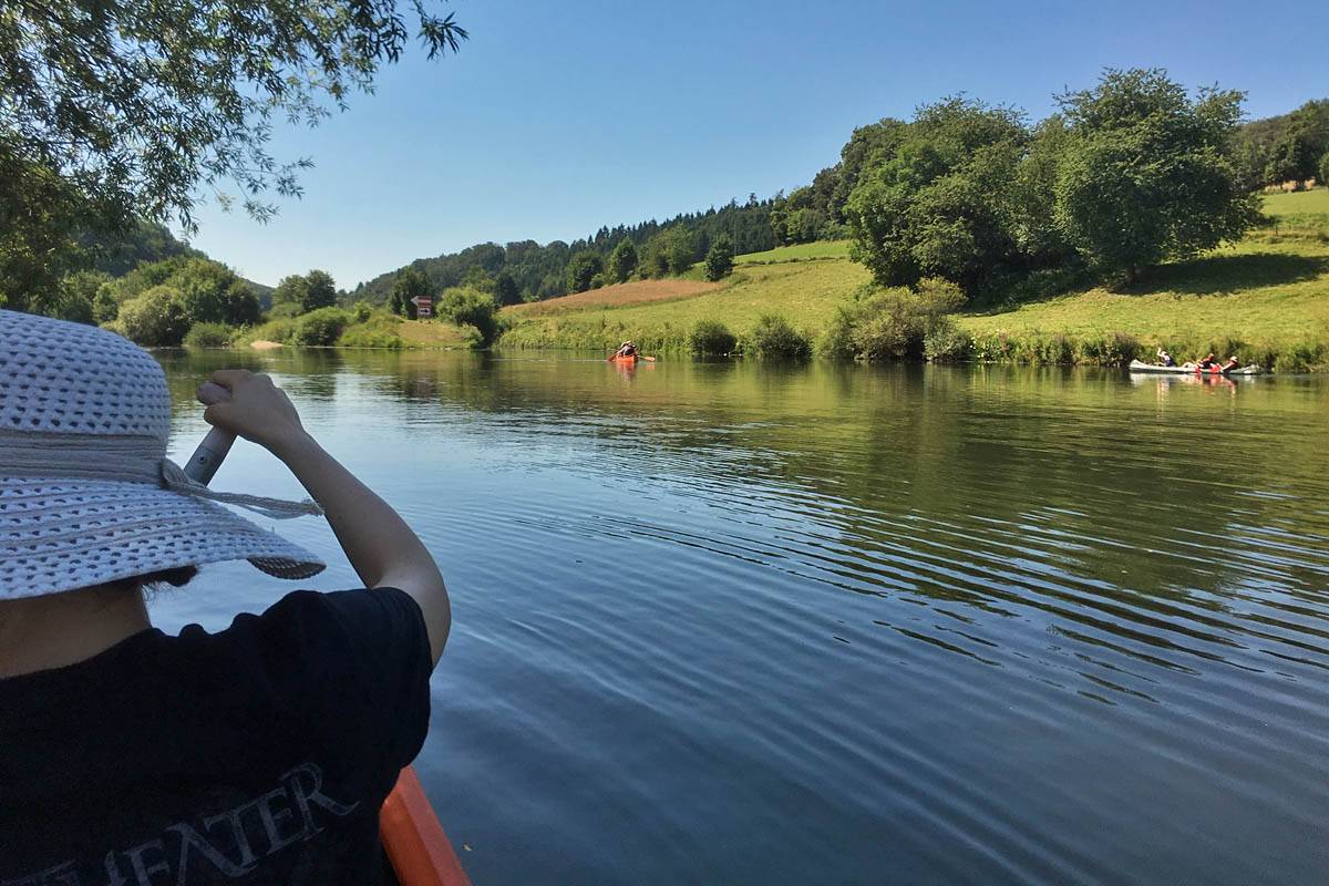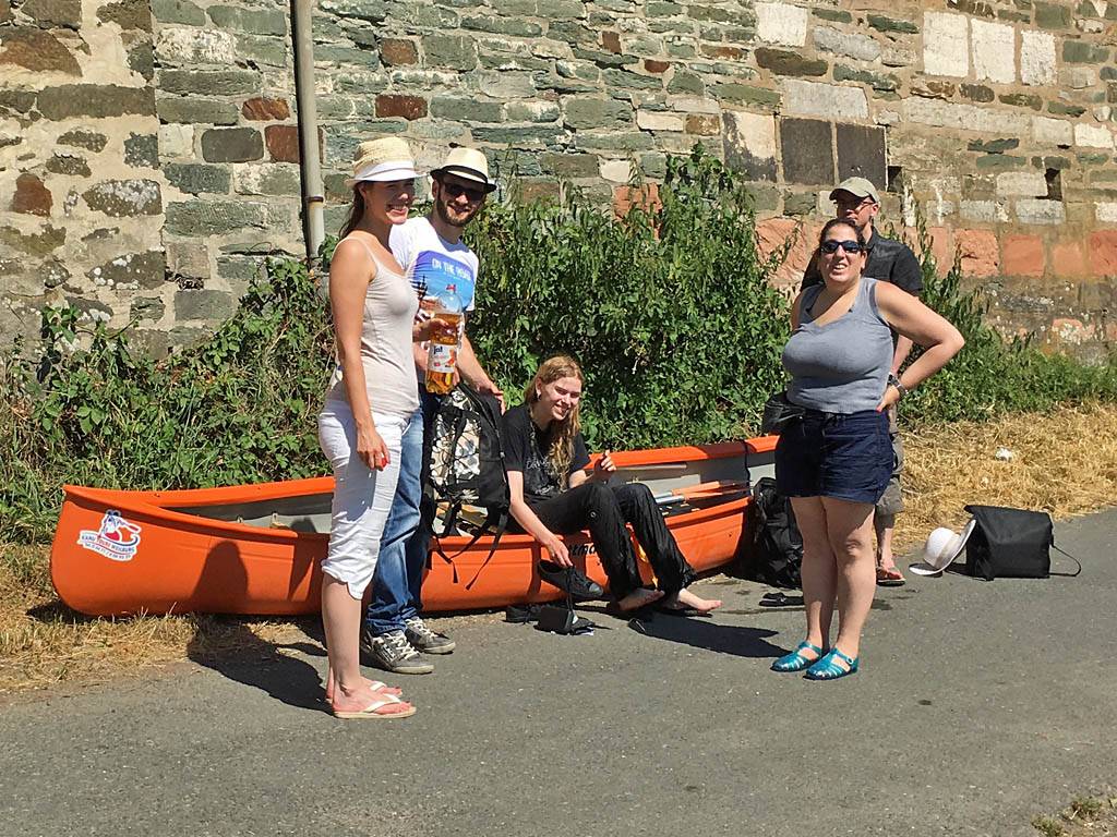 I woke up around 7AM after a good night's sleep. I updated my diary on a nearby lounger while I waited for everyone else to wake up. Soon after 9AM people were up and we were ready by 10:30AM. Soon afterwards Mathis, Silvia and Artem arrived and we set off at 10:50AM. It was already very hot outside and forecast to be around 33C, so it was a good day to be on the water. After a half hour drive on nice country roads past fields, rolling hills and a wood, we arrived at the canoe start point in a village called Furfurt. We parked up, put suntan lotion on and walked down through the village to the canoes on the shore of the river Lahn. We had an 11:30AM booking but nobody seemed to be present at the office. Dagmar phoned the company to find that the contact was actually to be found by the river. So we crossed the railway line to find him, and found the canoes ready to go.