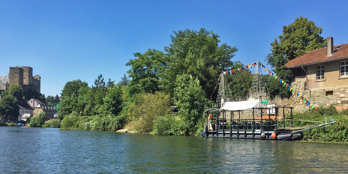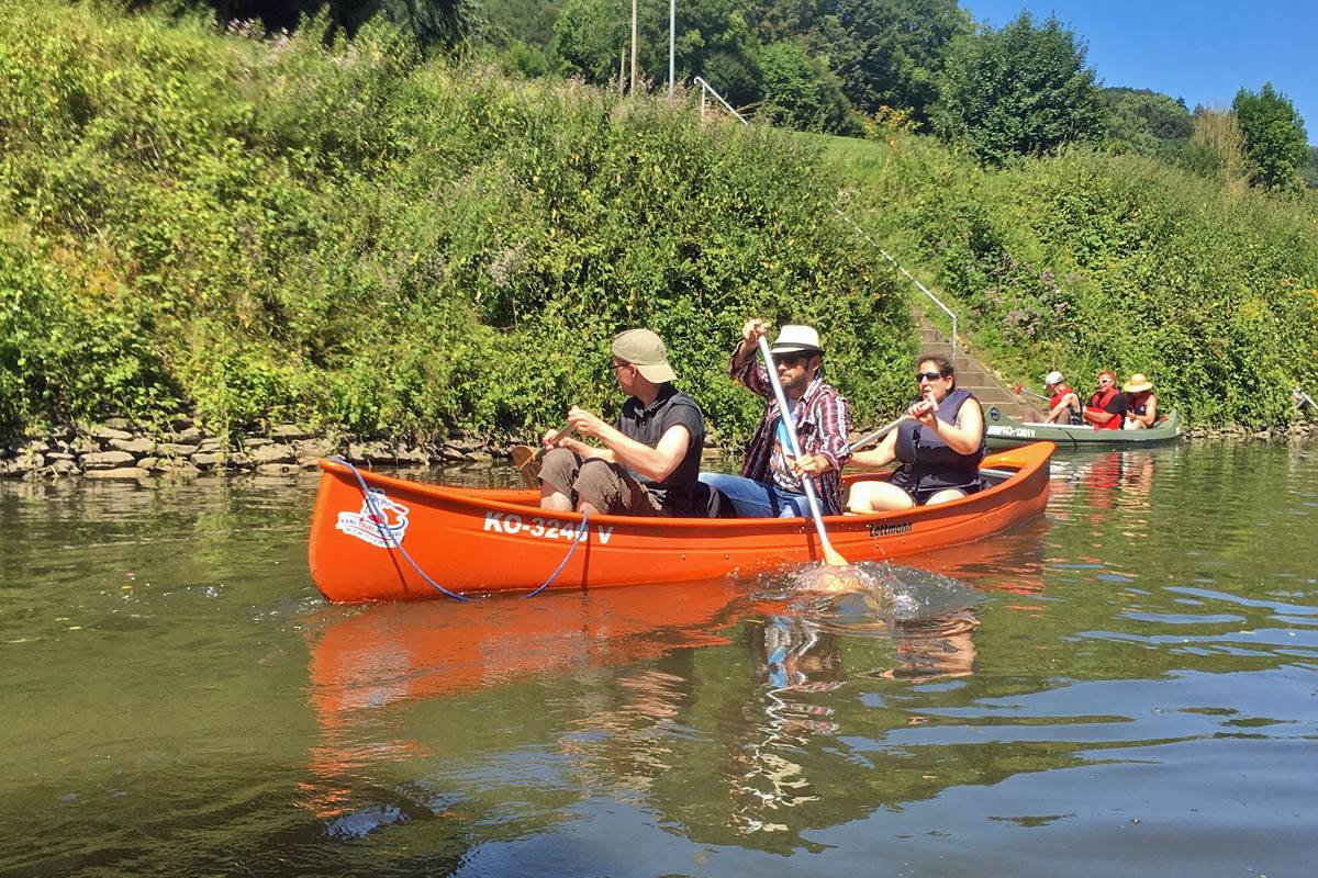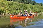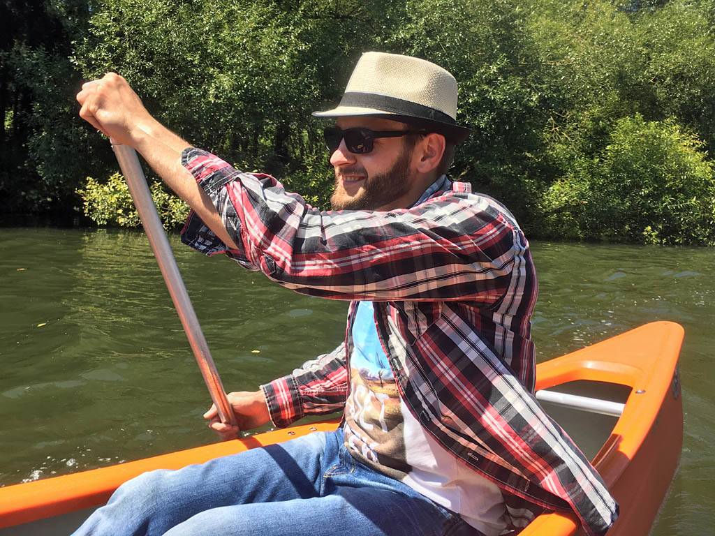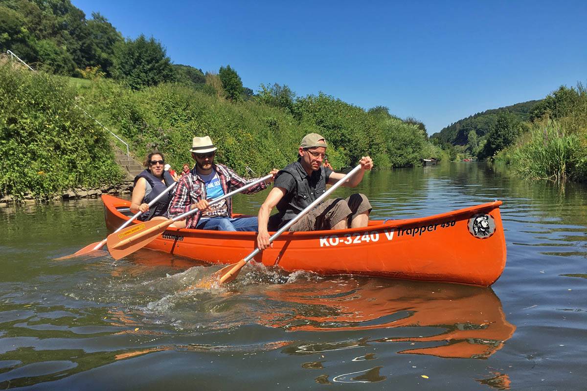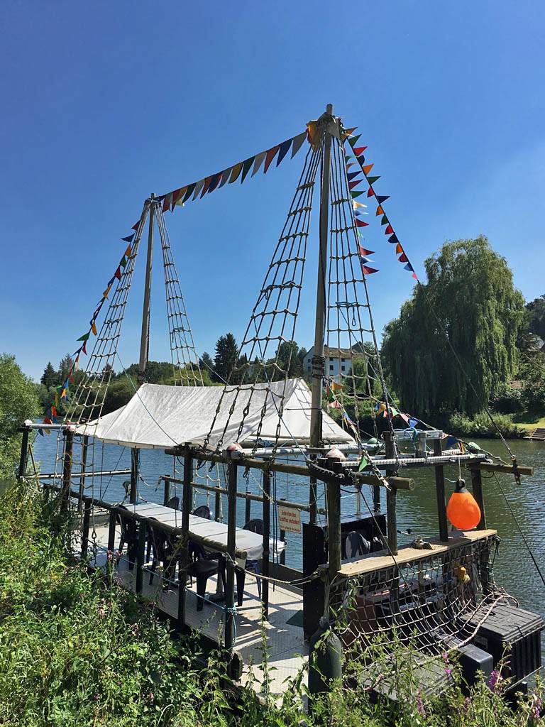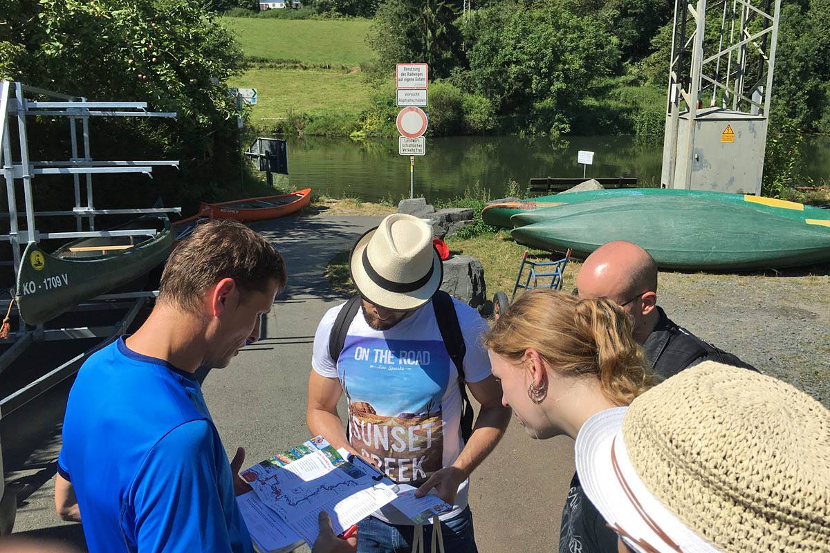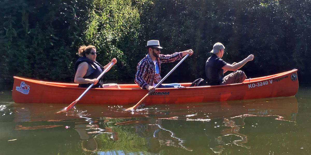 I woke up around 7AM after a good night's sleep. I updated my diary on a nearby lounger while I waited for everyone else to wake up. Soon after 9AM people were up and we were ready by 10:30AM. Soon afterwards Mathis, Silvia and Artem arrived and we set off at 10:50AM. It was already very hot outside and forecast to be around 33C, so it was a good day to be on the water. After a half hour drive on nice country roads past fields, rolling hills and a wood, we arrived at the canoe start point in a village called Furfurt. We parked up, put suntan lotion on and walked down through the village to the canoes on the shore of the river Lahn. We had an 11:30AM booking but nobody seemed to be present at the office. Dagmar phoned the company to find that the contact was actually to be found by the river. So we crossed the railway line to find him, and found the canoes ready to go.
