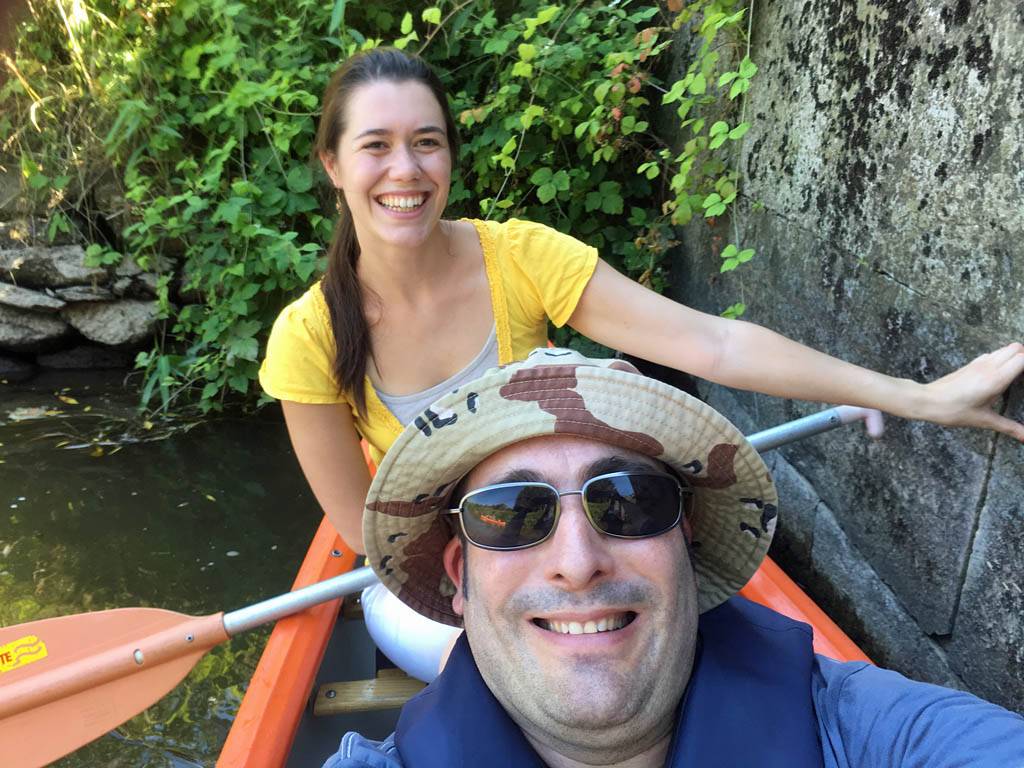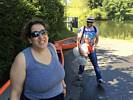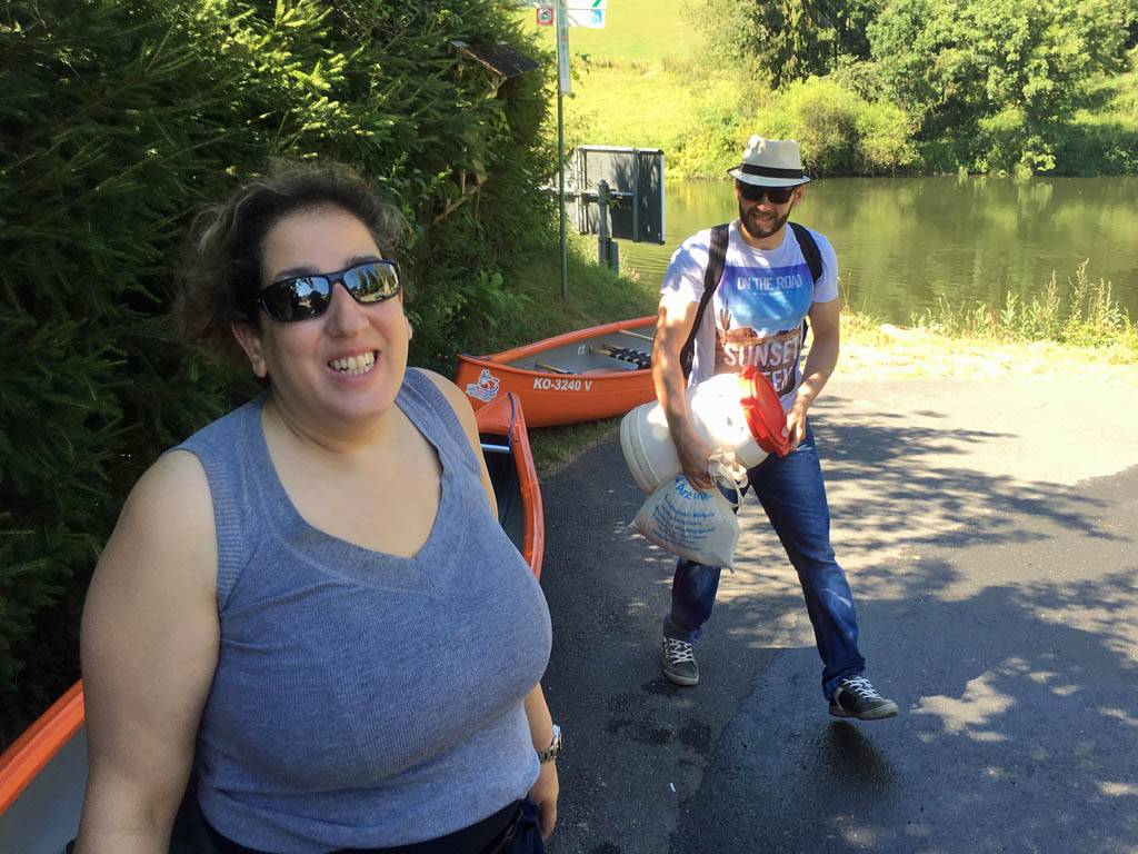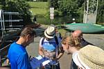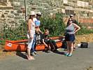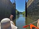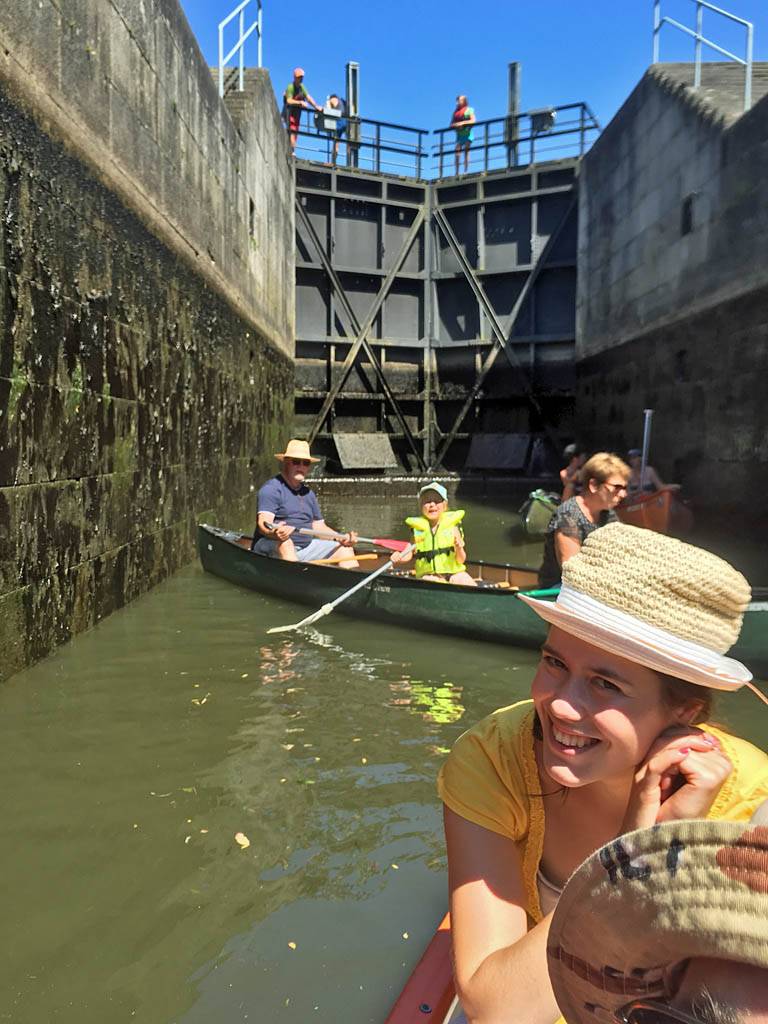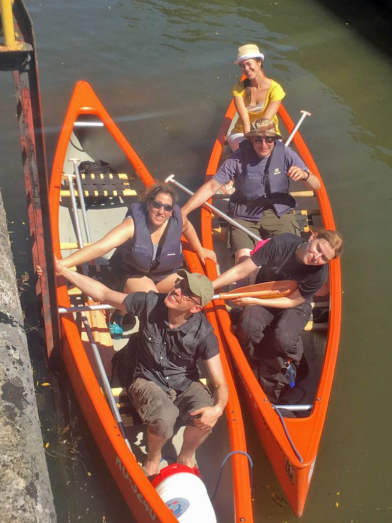Dagmar, Silvia and I getting the 2nd boat ready. | And away we go! | Shots of Mathis (front), Artem and Renée (back) as they paddle their canoe. | Dagmar (front), Mike and Silvia (back) waiting for the lock to open. |