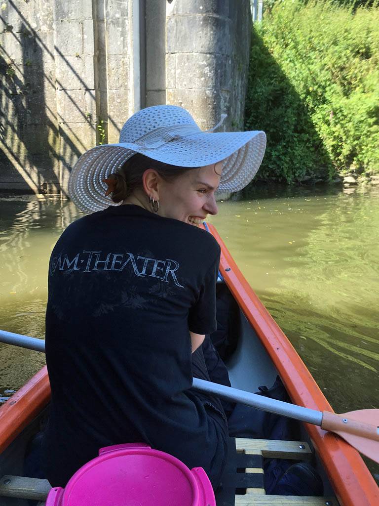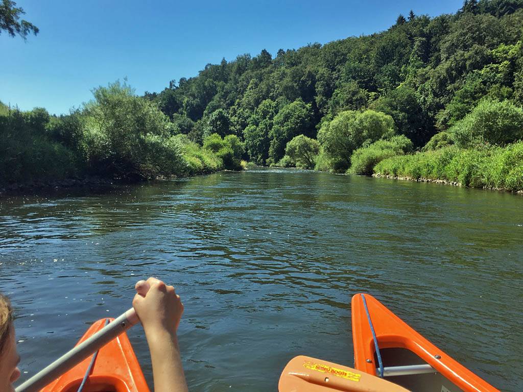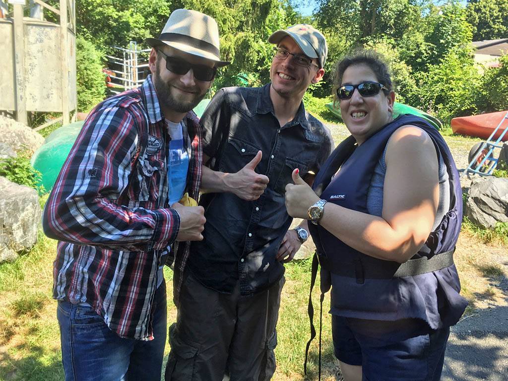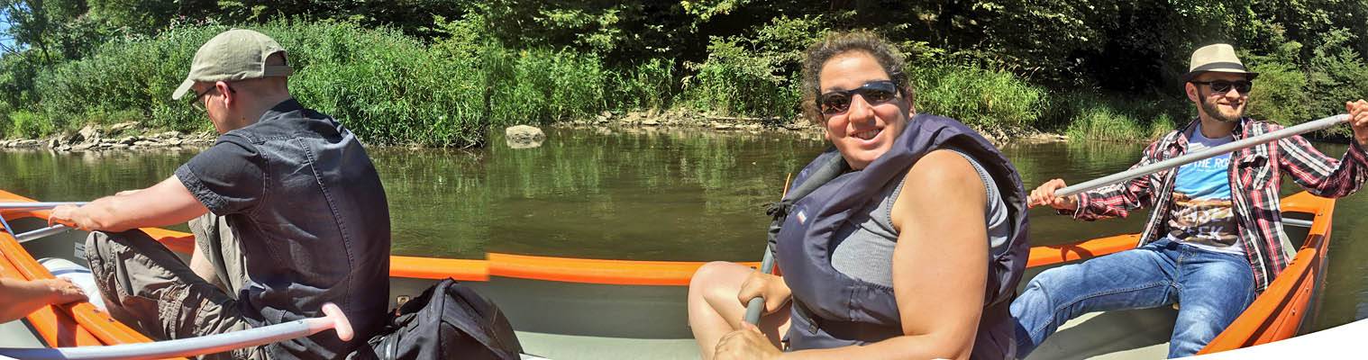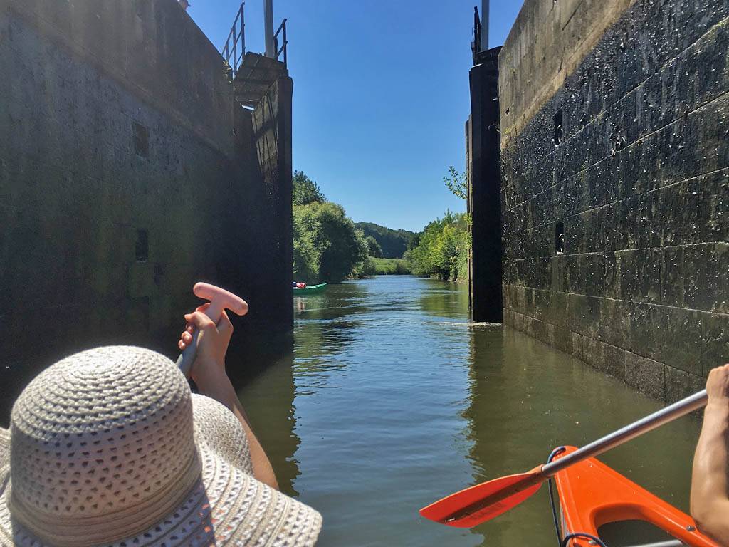 Dagmar, Artem and Renée keeping the boats by the ladder as we wait for the lock to open. | The downstream lock doors open as we prepare to go. | Mathis, Renée and Artem as we hold the boats and paddle downstream together. | Looking over Dagmar's head at our first set of rapids. | Renée enjoying the rapids. | Calmer waters ahead in the lush and pretty German countryside. |