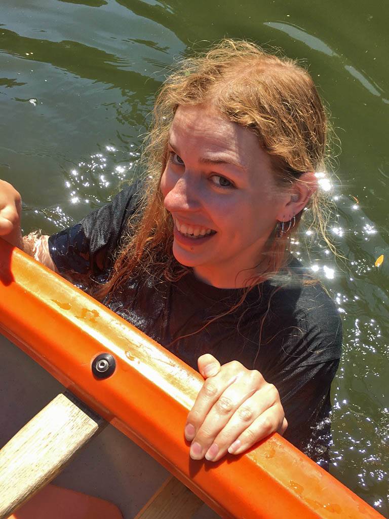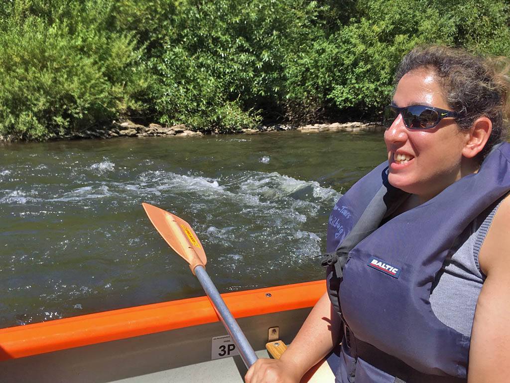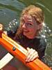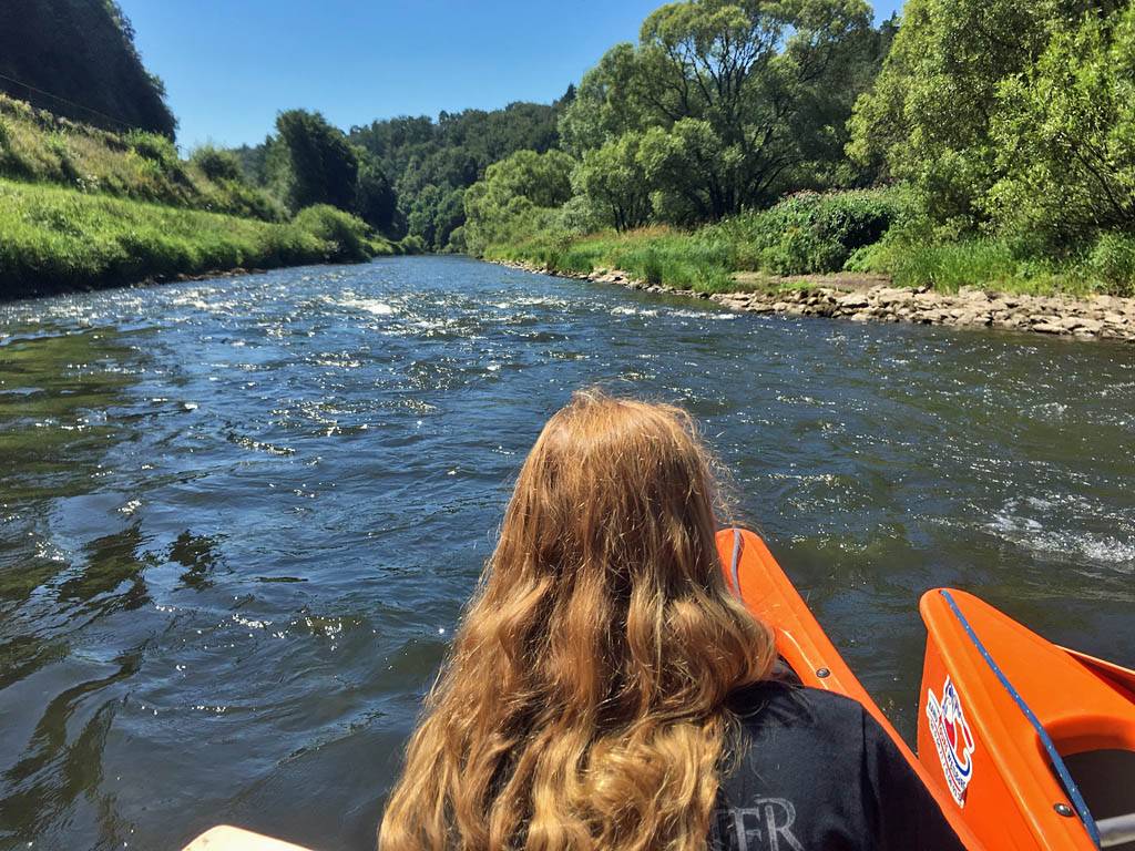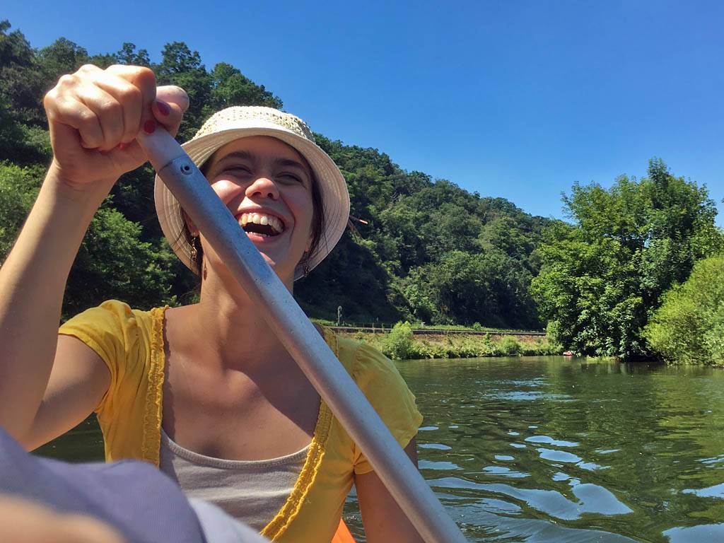 Dagmar, Artem and Renée keeping the boats by the ladder as we wait for the lock to open. | The downstream lock doors open as we prepare to go. | Mathis, Renée and Artem as we hold the boats and paddle downstream together. | Looking over Dagmar's head at our first set of rapids. | Renée enjoying the rapids. | Calmer waters ahead in the lush and pretty German countryside. |