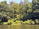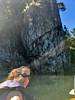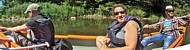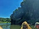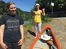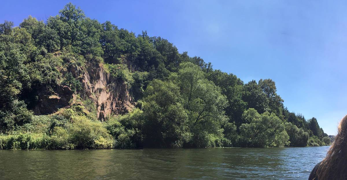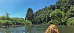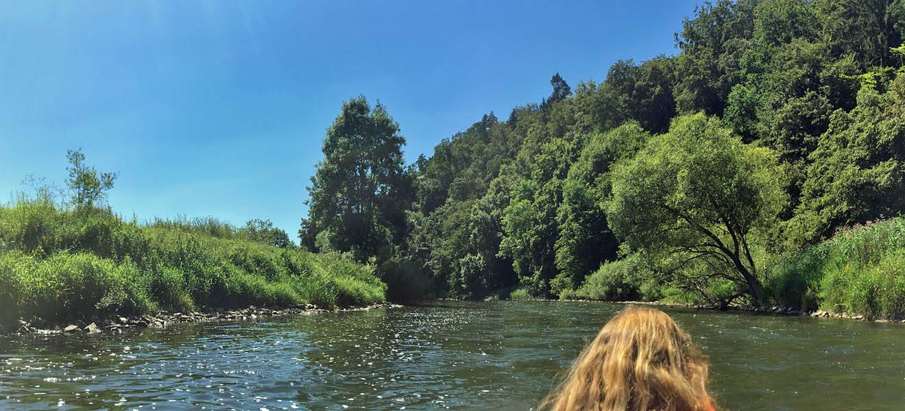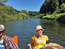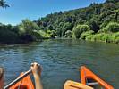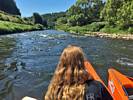 Artem and Silvia soaking in the hot sunshine. | Another view forwards. | At this point Dagmar jumped in the water with the idea of pushing the boats along from behind. But the river bed was deeper than she realised and she ended up in up to her neck. But nice and cool after the 33C heat. | Passing some large rocks. The iPhone in its waterproof case struggling with direct sunshine. | Silvia enjoying herself. You can see the railway running alongside the river. That will be our way back. | A quaint hut in the woods. |