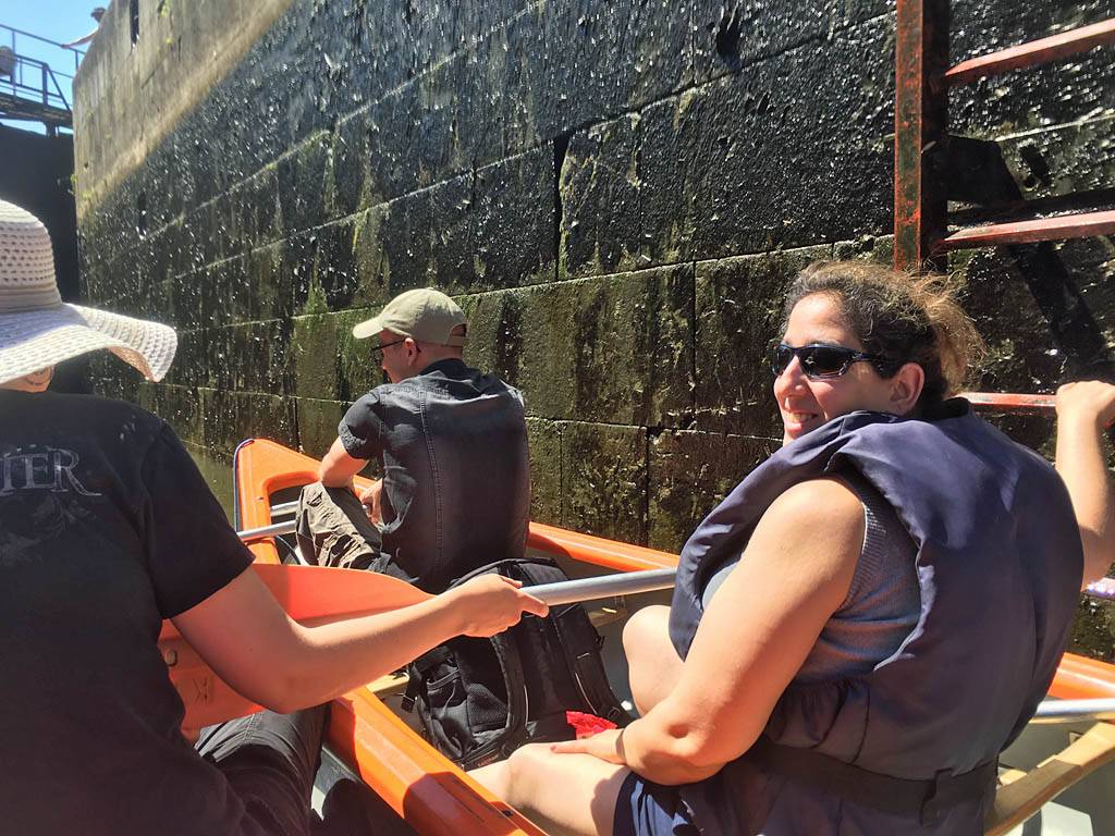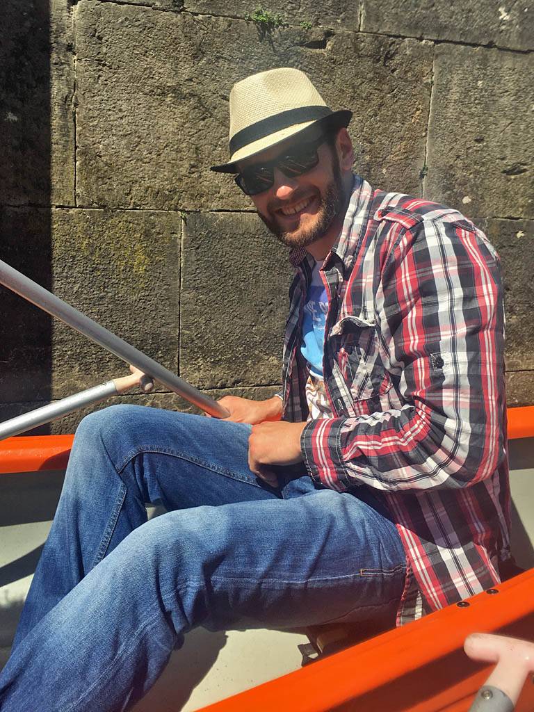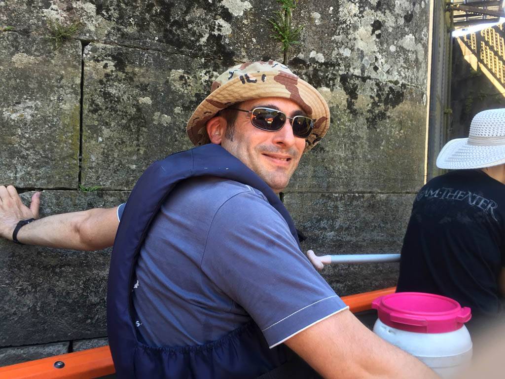 More views of Mathis, Artem and Renée manouvring to the lock. | Mike relaxing for a moment. | Artem shot up the ladder with my iPhone and took this great picture of the two boats inside the lock. Renée and Mathis on the left (Artem switching to the back seat), Silvia, Mike and Dagmar on the right. | Artem back in the boat, taking the back seat. | Looking back past Silvia as the lock closes and we sink down to the next level. |