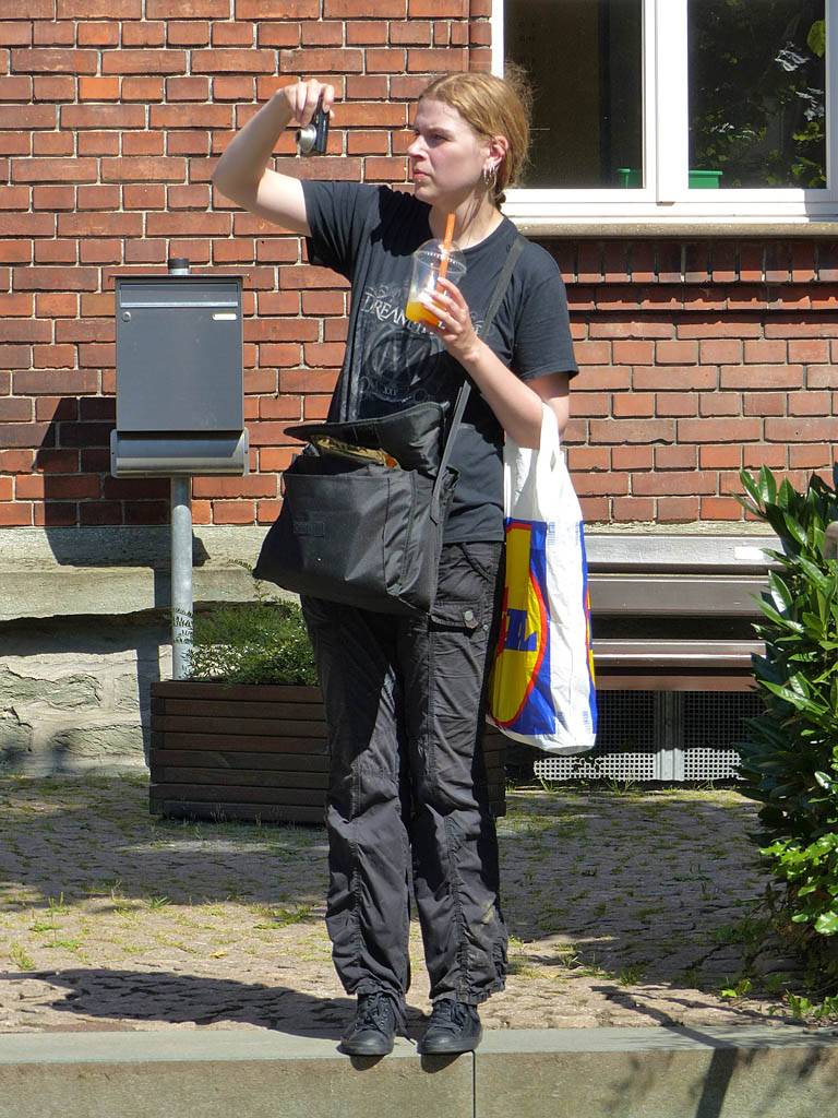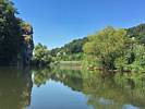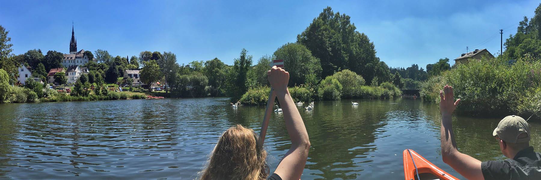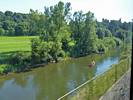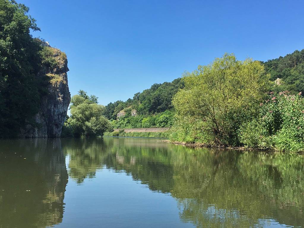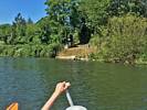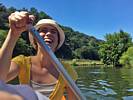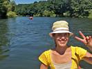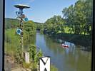 The man gave us an intro briefing that included a lesson on some 'road signs'. We also put our stuff into waterproof caskets. I put my iPhone into a waterproof pouch that I bought online so I could take pictures from the canoe. Then we carried the canoes into the river Lahn by midday, boarded and set off downstream. Renée was in one boat with Mathis and Artem while I was with Dagmar and Silvia. Soon after we started we entered a lock. Artem went up a ladder with my iPhone and took a nice shot of the canoes as we waited for the water level to drop in the lock. Once he was back aboard and the gates opened we were on our way. We had fun trying to row straight and hit the bank a few times. But we got the hang of it eventually. After a while we kept the two canoes together. Renée held the boats while the rest of us paddled, Artem and I doing the most work. A few shallow sections had rapids. Then further downstream the river widened and deepened, and got very slack. One other lock bypassed a weir. After a while I was getting very sore and the heat was phenomenal. Dagmar and I wet our hats which helped, as did having a good splash too! At one point Dagmar jumped in and wanted to push the canoes but it was too deep. She eventually got back on board. At Villmar we passed under an echoey large bridge while a duckling chased after us. A pause under the bridge was a nice respite from the sun. It was nice to say hallo to other canoeists and bathers on the water too.