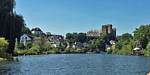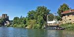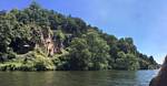 The Villmar duckling that chased us. | At Villmar we needed to keep right to stay away from a weir. The right hand route led to another lock. | More rocky views on the Villmar stretch of the river. | At last we pass milestone 46 and approach Runkle with the castle prominent in the view. |