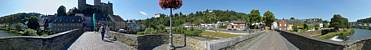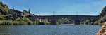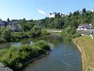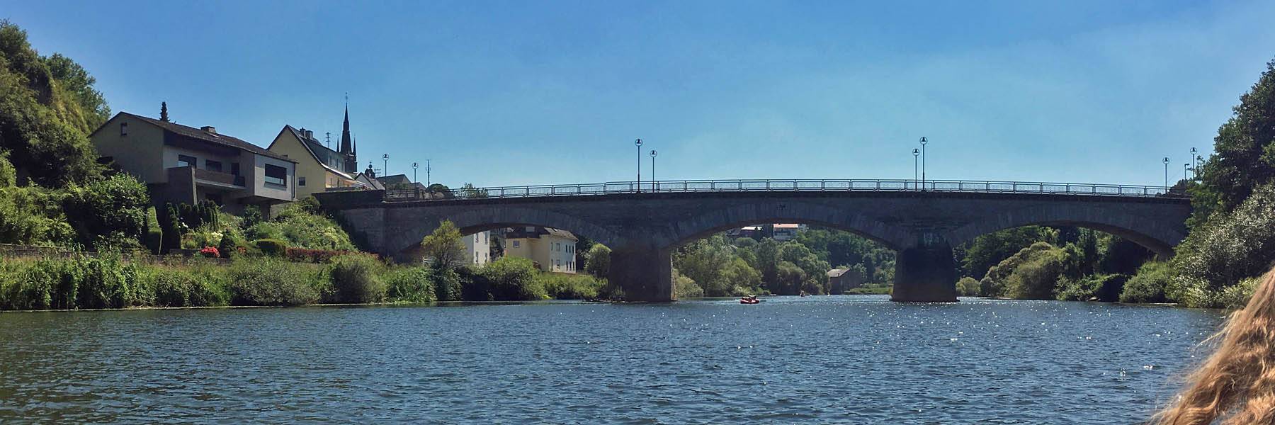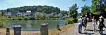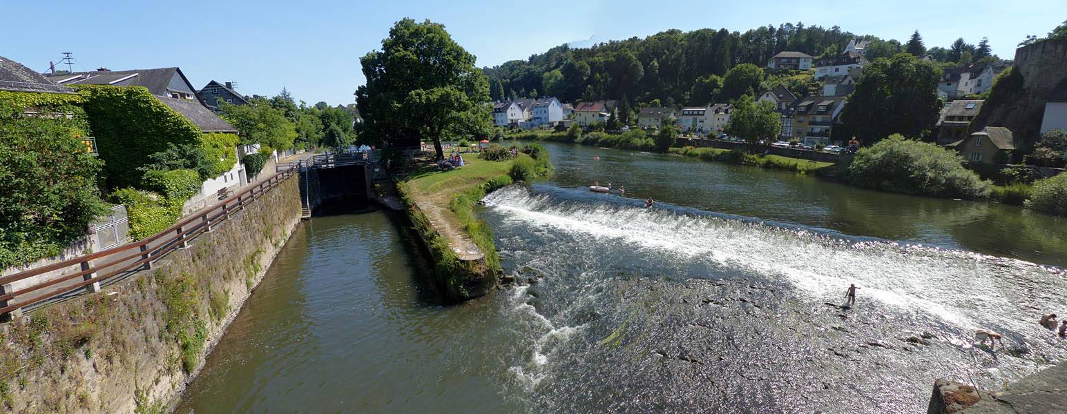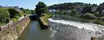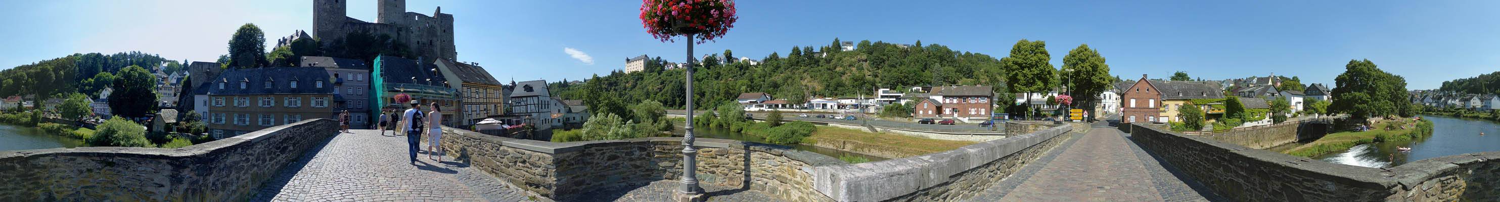 The weir and lock on the North side of the bridge. | Renée and Silvia on the bridge. | 360 degree panorama from Bahnhofstrasse bridge. | Looking West from the bridge to Runkel Castle. |