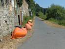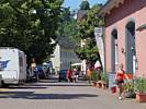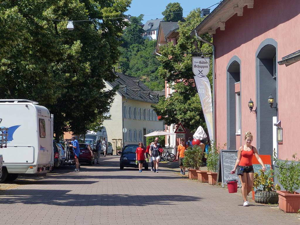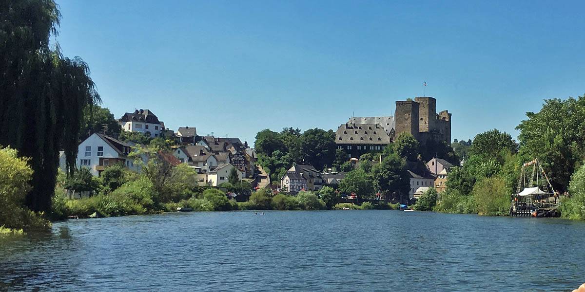 Setting off from the landing area. Walking into Runkel. | Behind us the boats are left overturned ready for the company to collect them. | The bottom end of Runkel. | Stopping for chips and a rest. | Looking Northwest from the Bahnhofstrasse bridge along the River Lahn to Schloss Schadeck, a castle on the North side of Runkel up on a hill. |