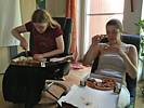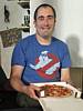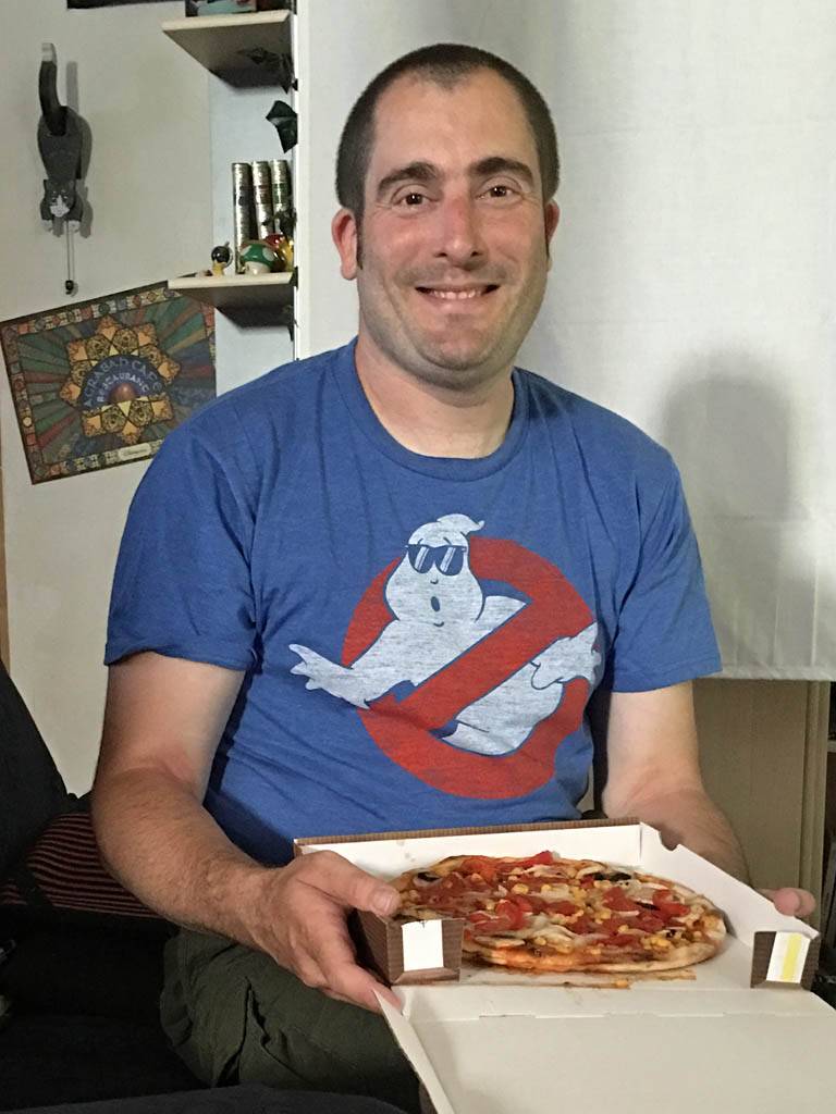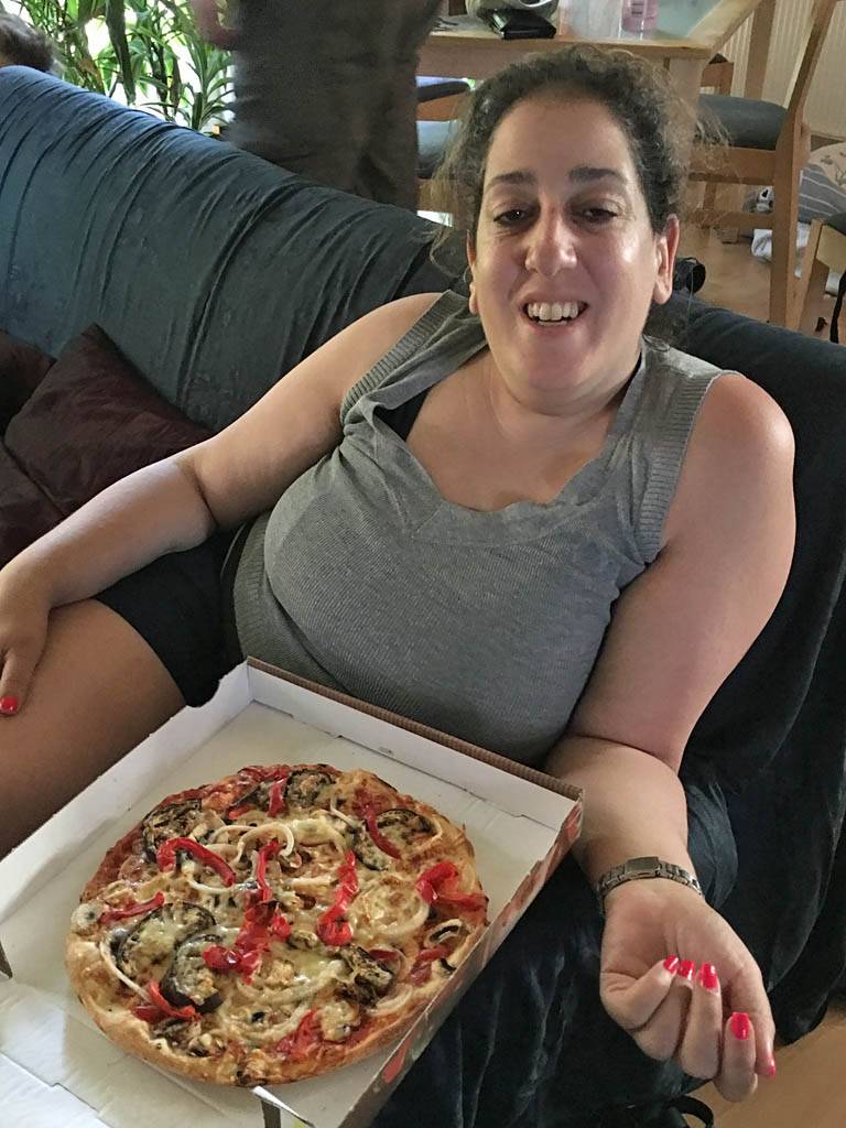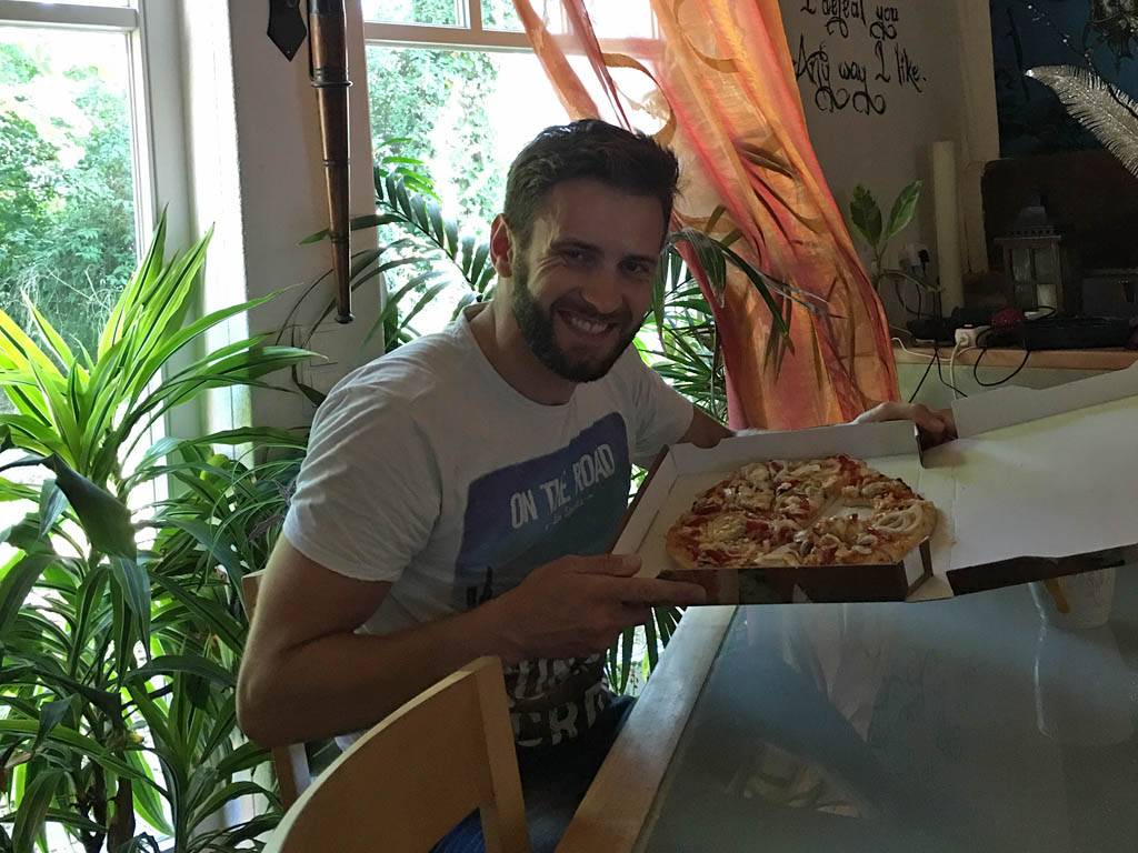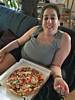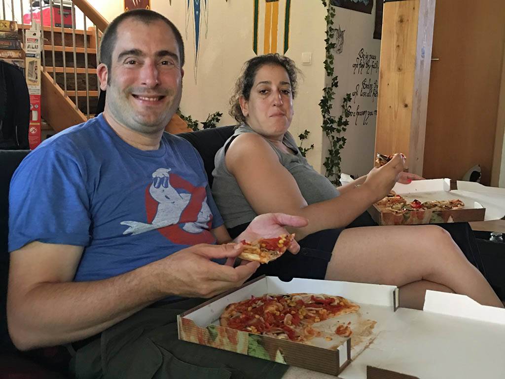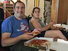 Renée, Mike and Mathis with pizza. | Mike and Renée with pizza. | Dagmar and Silvia with pizza. | Artem with pizza. |