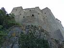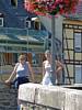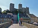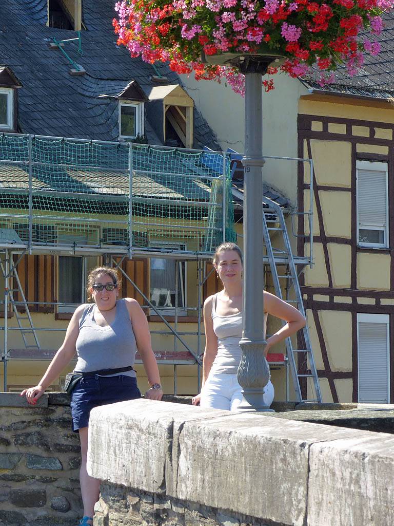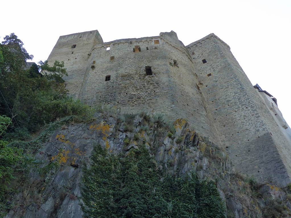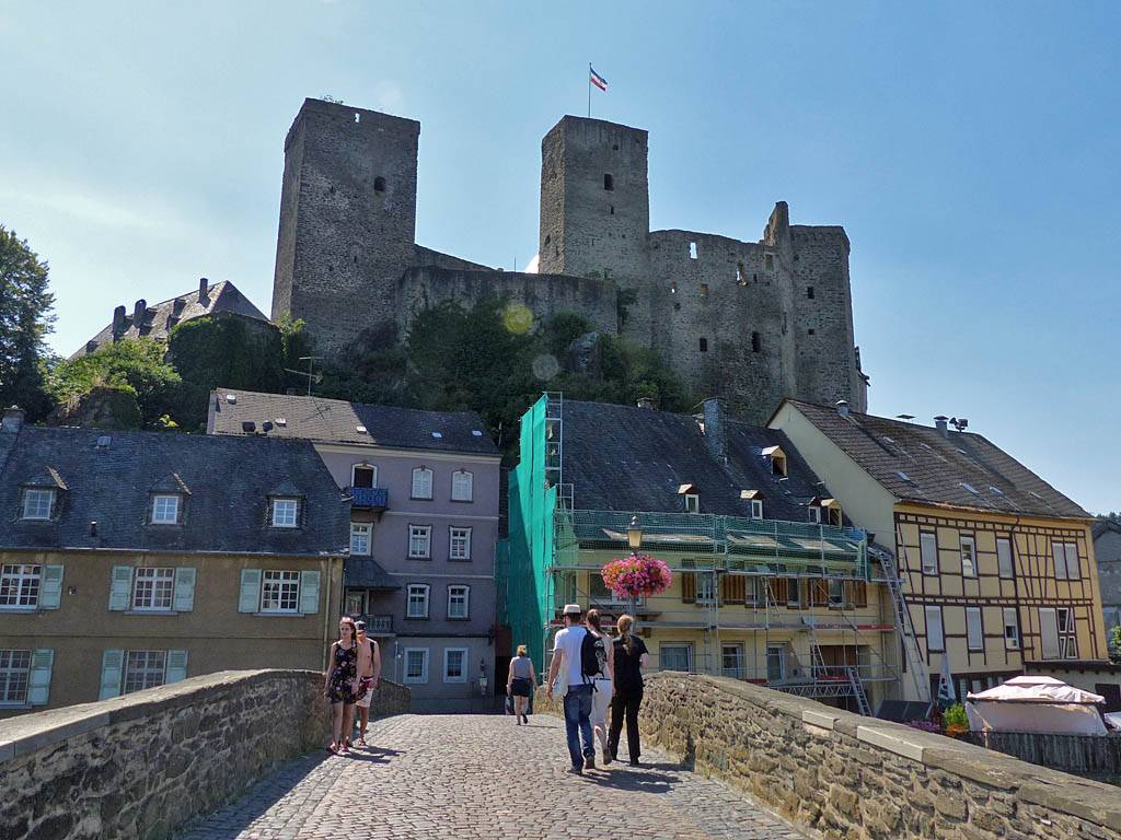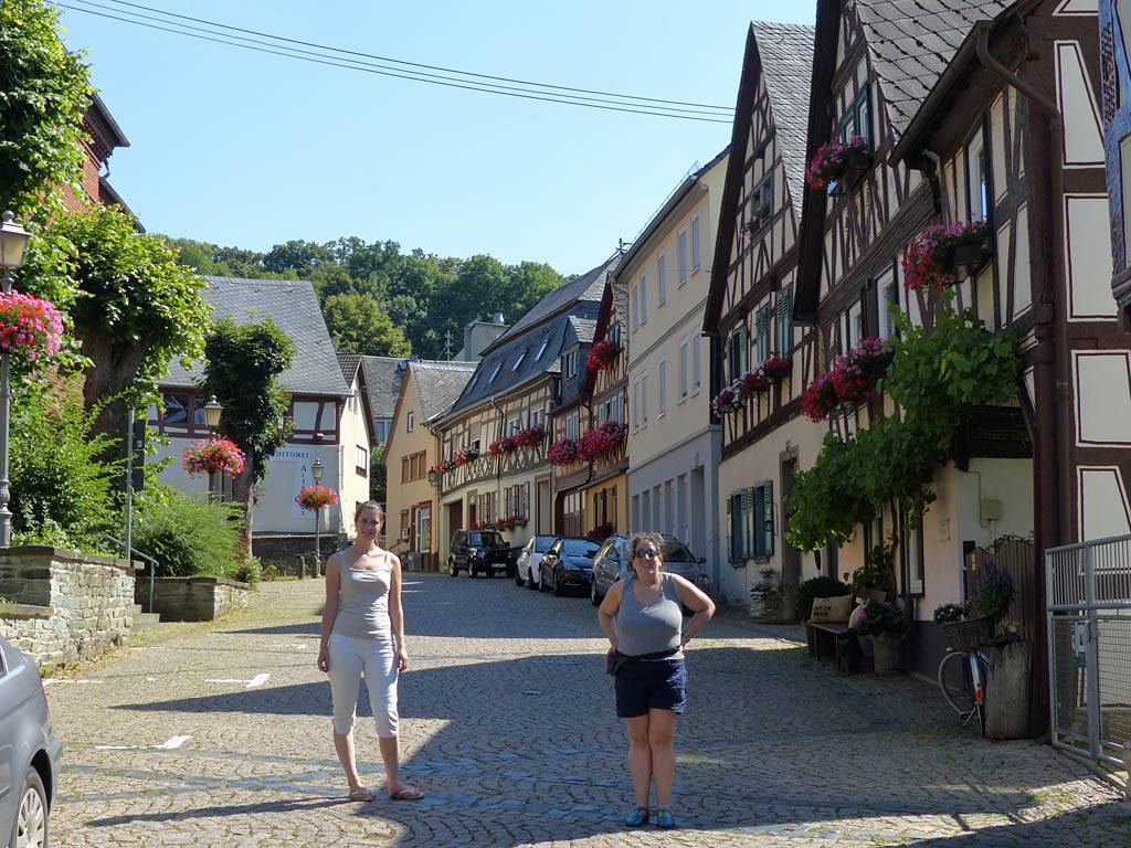 Runkel Castle from underneath. | Walking up the roads surrounding the castle. | Looking at the Runkel architecture. I like the way the tiles curve round to the windows sticking out of the roof. | Silvia and Renée on a Runkel street. |