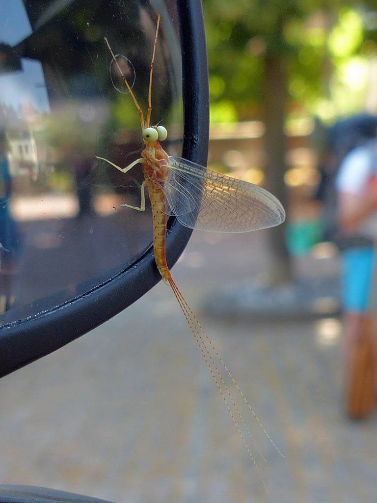 An insect that settled on Artem's glasses. It looks like a May Fly. But it is July. TODO: Identify insect. | Here comes the train to take us back to Furfurt. |