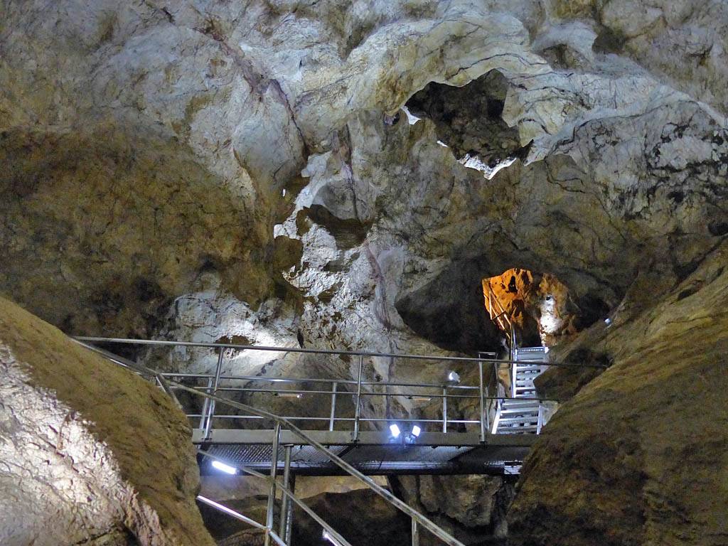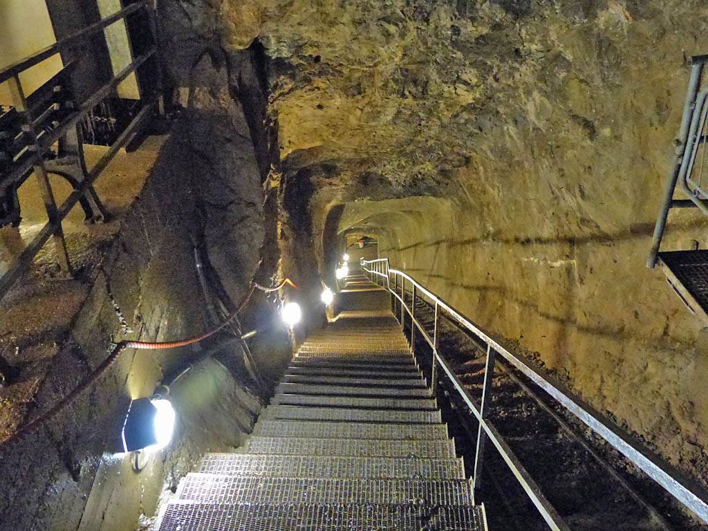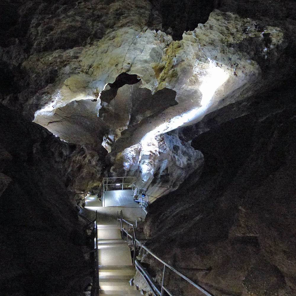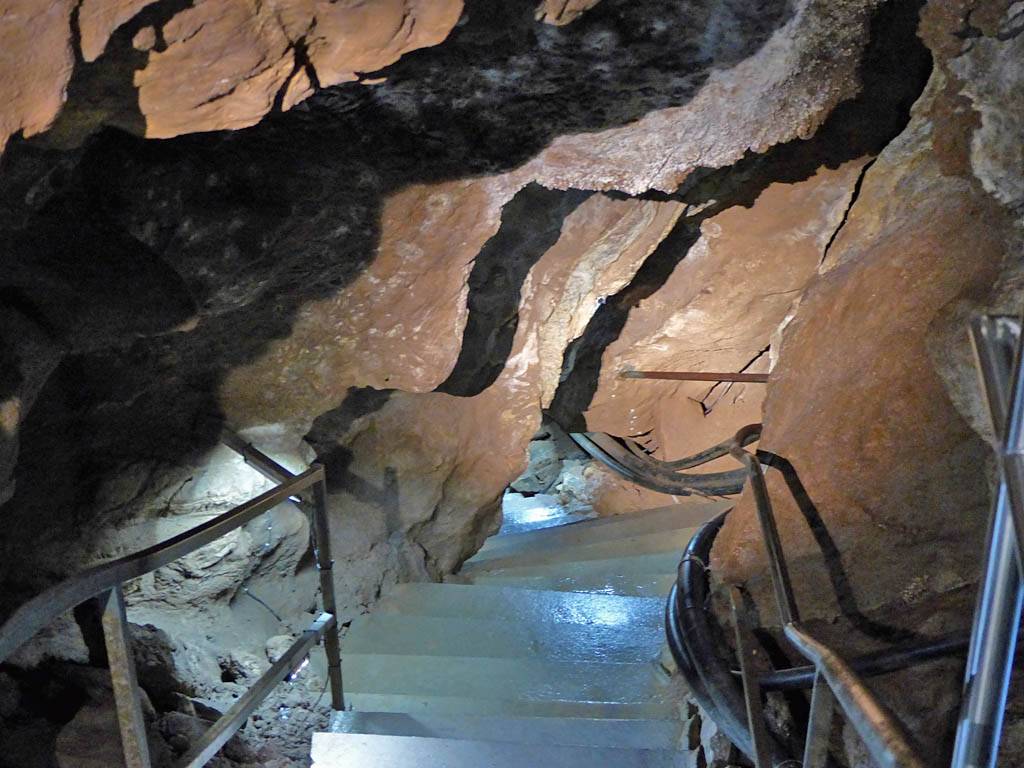 Looking back at the stairs from the bottom cavern. The zoom shot showing where Renée is gives a sense of scale in the full size shot. | The bottom of the bottom cavern. Apparently there was a pool here. But it got drained and excavation work is going on as there may be a further cavern beyond this point. | Ascending the steep stairs to return to the entrance. | A view of the lion statue and the visitor centre buildings as we leave in the car. |