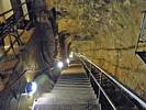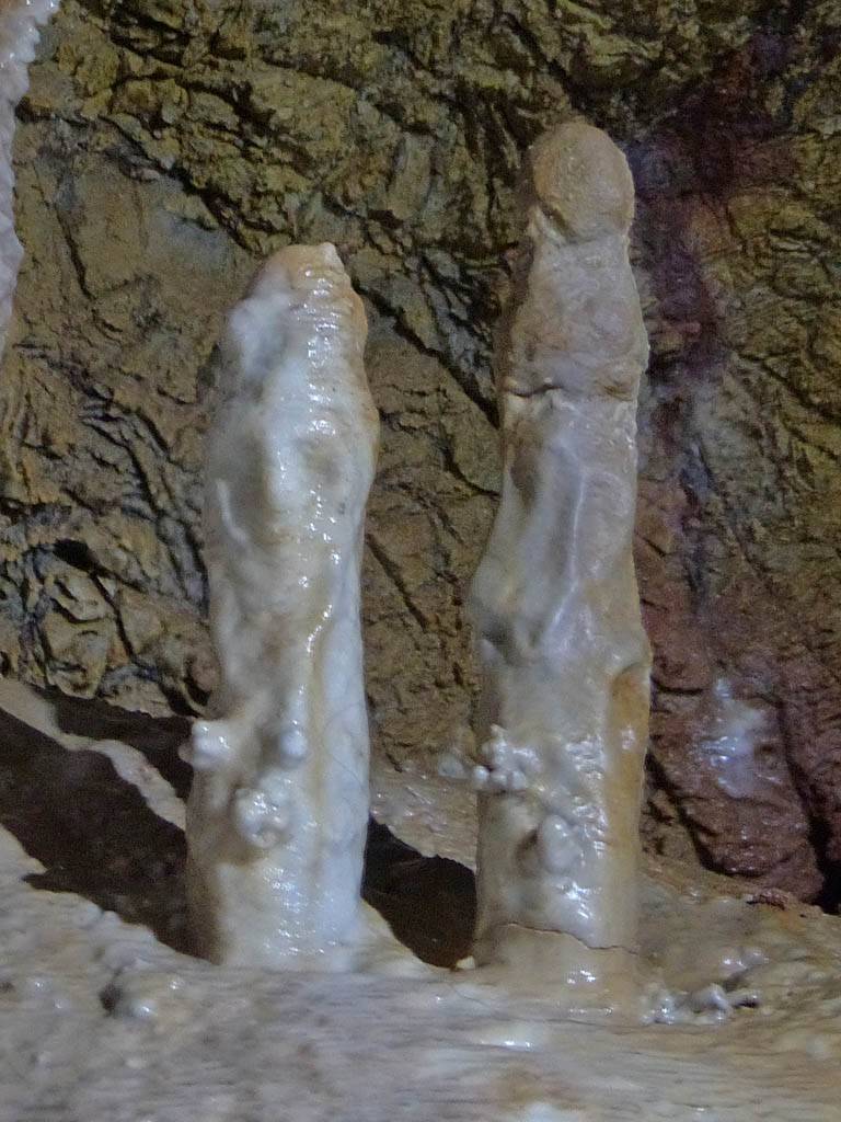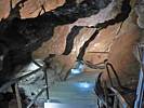 Close up of some phallic stalagmites. | More crystals and calcite. | The stairs through a narrow tunnel to the bottom cavern. Crystals and other formations line the walls and ceiling on the way down. |