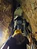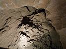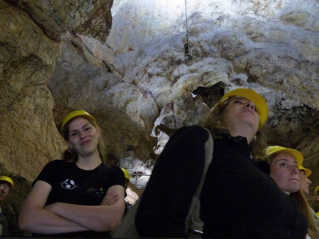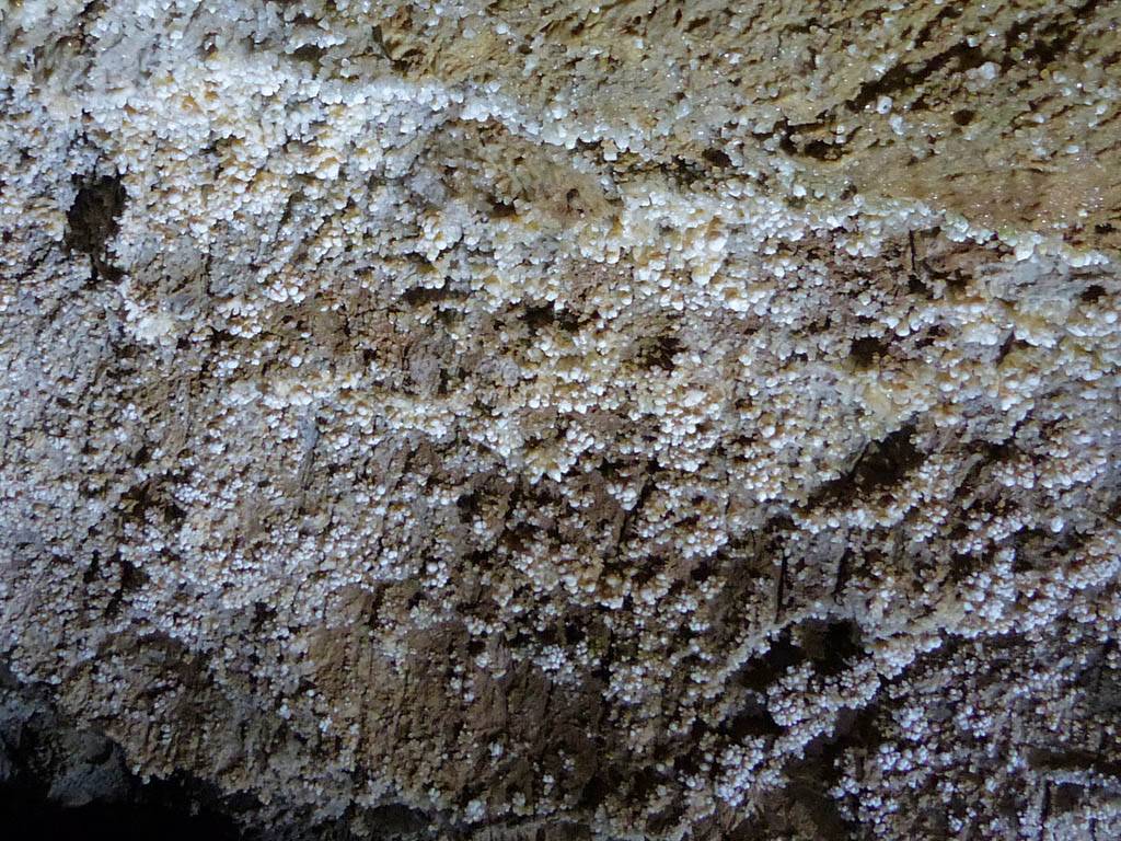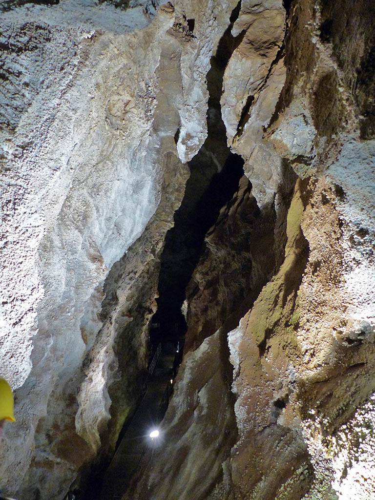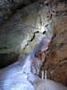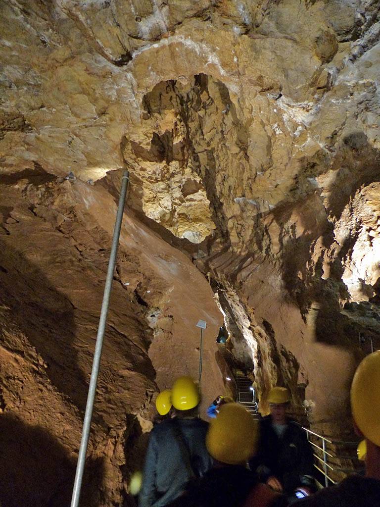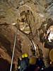 Looking through a hole in the top cavern. | Renée looking like a miner. (Sorry Dagmar you were just off shot.) | The access tunnel below the hole will be our way out. | Down that staircase, a pretty pool is found. | The small crystals that give the cave its name. | The ceiling of the cavern just past the pool is quite high. |
