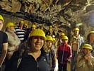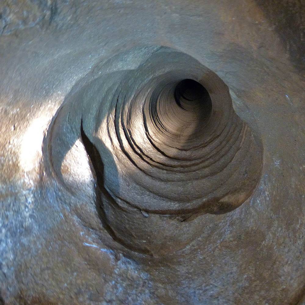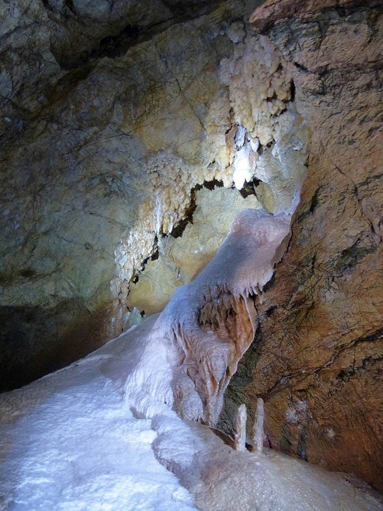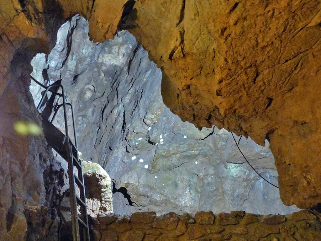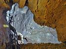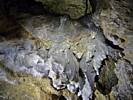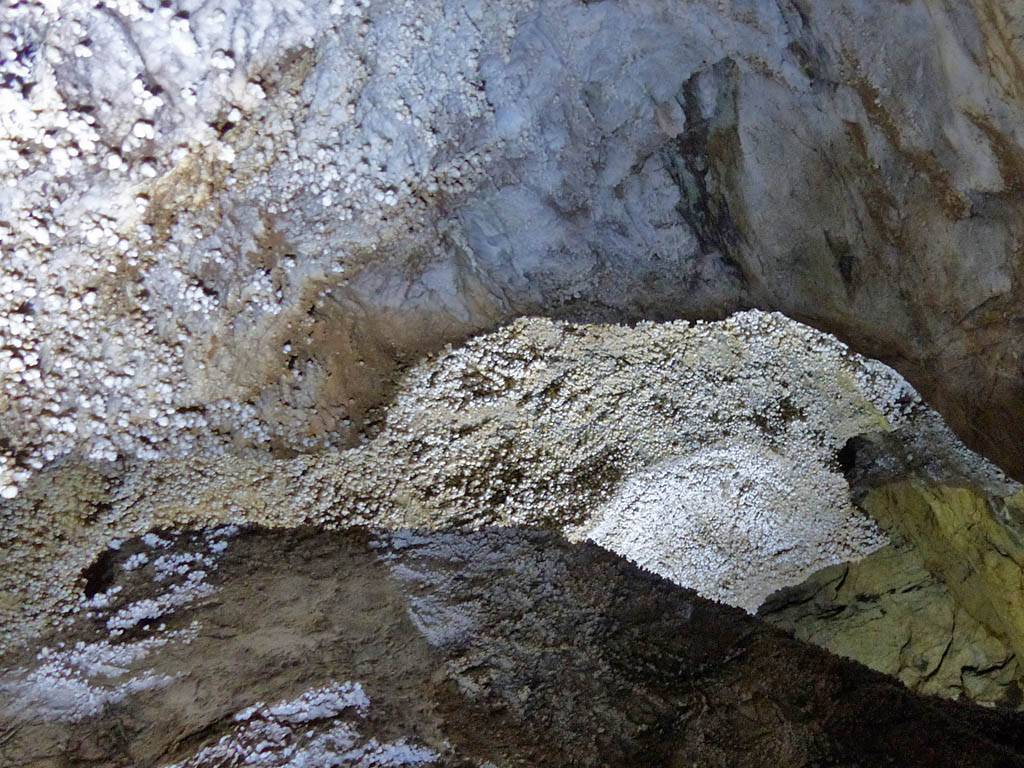 Looking through a hole in the top cavern. | Renée looking like a miner. (Sorry Dagmar you were just off shot.) | The access tunnel below the hole will be our way out. | Down that staircase, a pretty pool is found. | The small crystals that give the cave its name. | The ceiling of the cavern just past the pool is quite high. |
