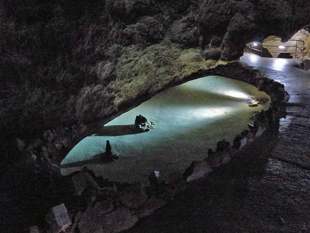 The cave tour got underway at 1:30PM. We donned yellow hard hats and had a briefing. Then we descended lots of steps down a diagonal access shaft. The drop in temperature (15-17C inside) was lovely as it was hot outside. Soon we arrived at the first caverns with a nice pool and small crystals on the walls and ceiling. The ground had been laid with a concrete path and metal steps and railings. The next cavern had the original small camera shaft that was how they discovered these caves, and a larger shaft that the first person to enter the system came through. We descended to a couple of other caverns below through some entertainingly tight corridors. The bottom cavern had excavation work going on as more caverns were being discovered beyond through other small openings. Then we ascended via a steep staircase from the camera cavern back to the top cavern and back up the access shaft. The heat from outside soon hit us again as we emerged at the surface at 2:20PM.