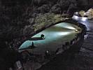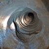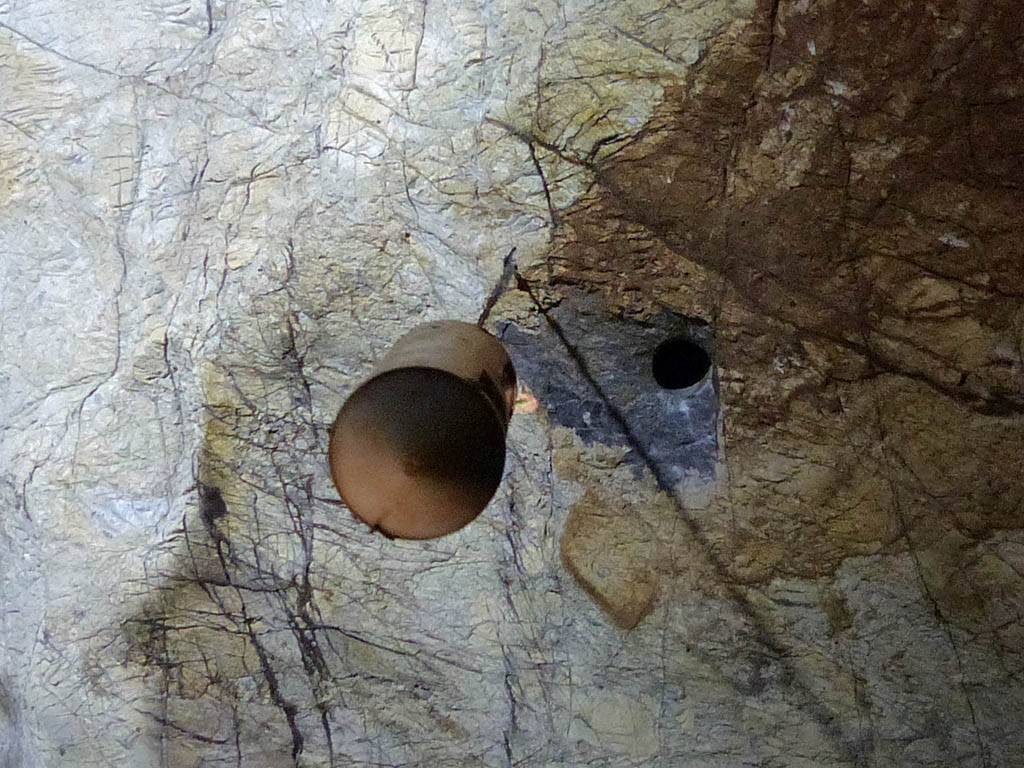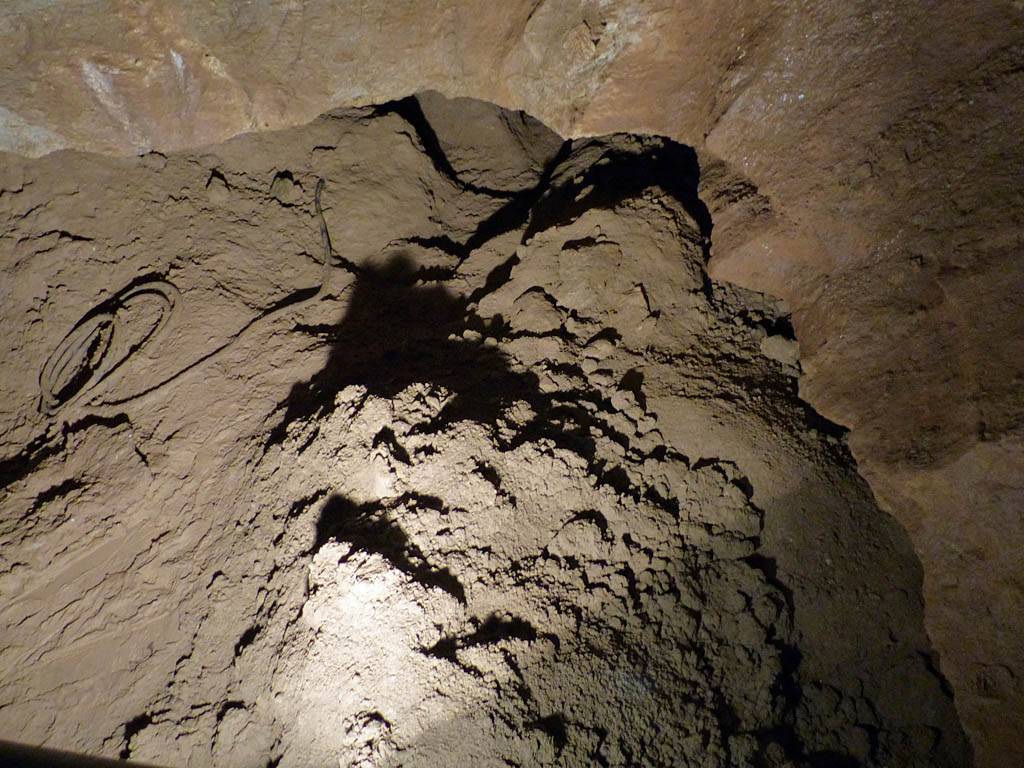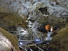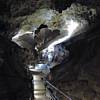 Looking to the other side of the cavern where our exit stairs are. | A lower cavern. The lighting resembles a giant question mark. | The camera and the hole it was sent through to discover this cavern. | The shaft dug to get the first explorer into the cavern. | Some drip stone calcite formations. | Dagmar and Renée looking around the cavern. |