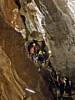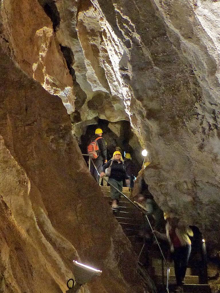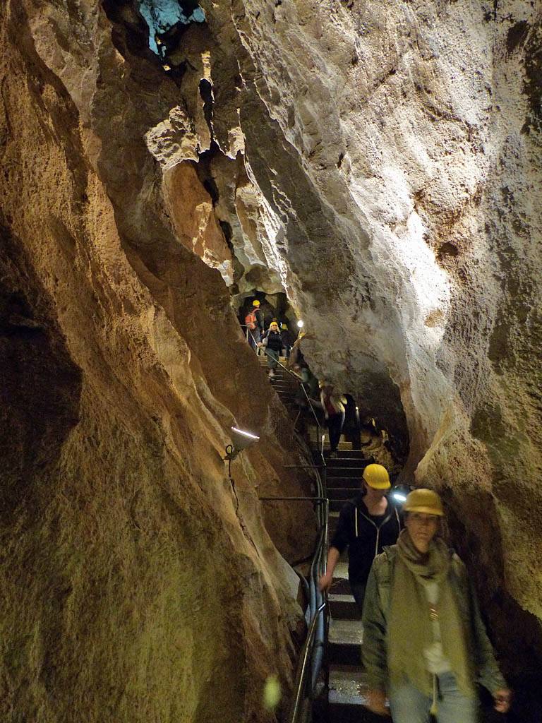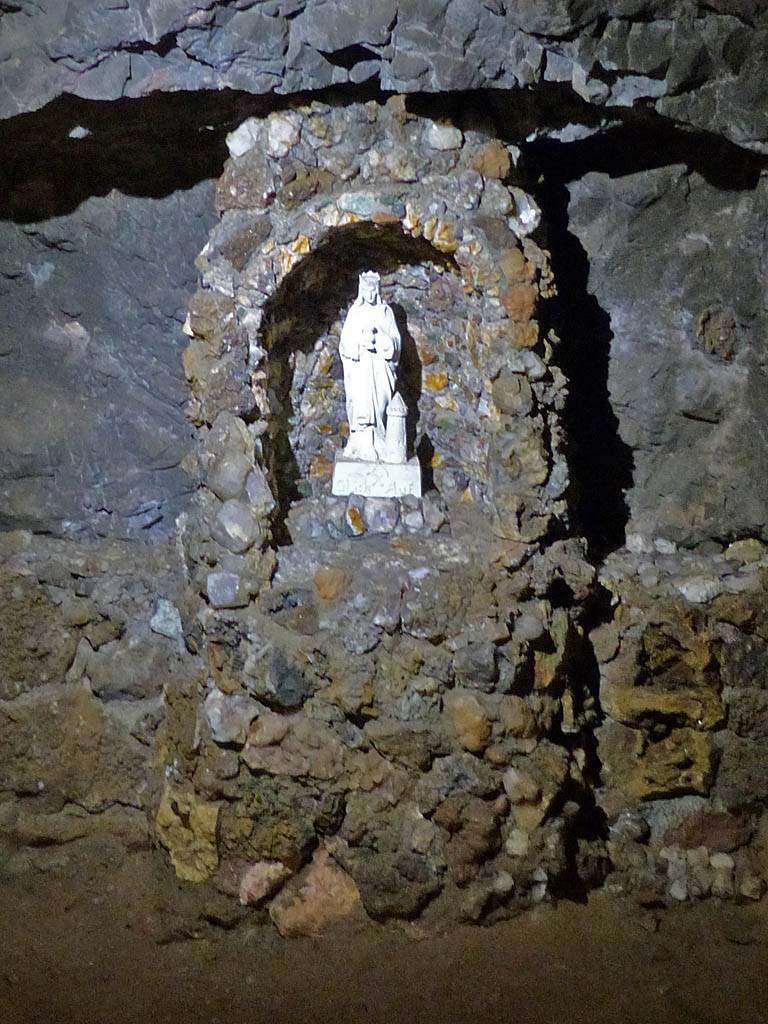 Donning the hard hats. Renée, Renée and Mike, Dagmar. | Many caves I understand have a statue like this to protect those going inside. | A steep staircase between the top two caverns. |
