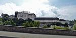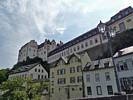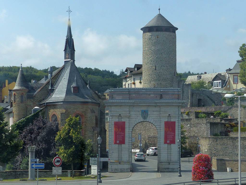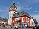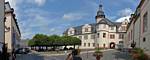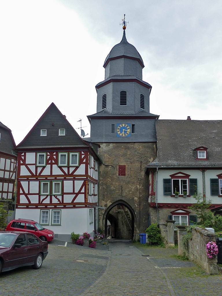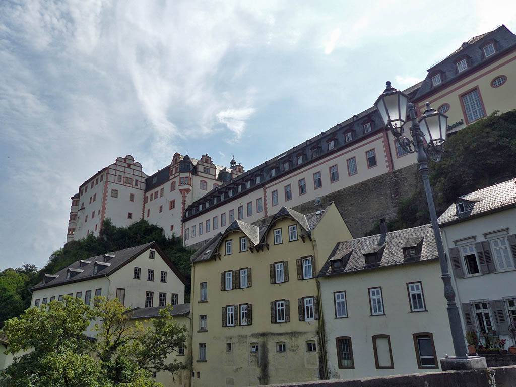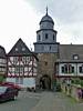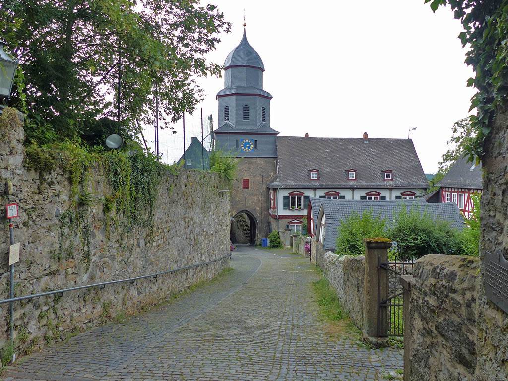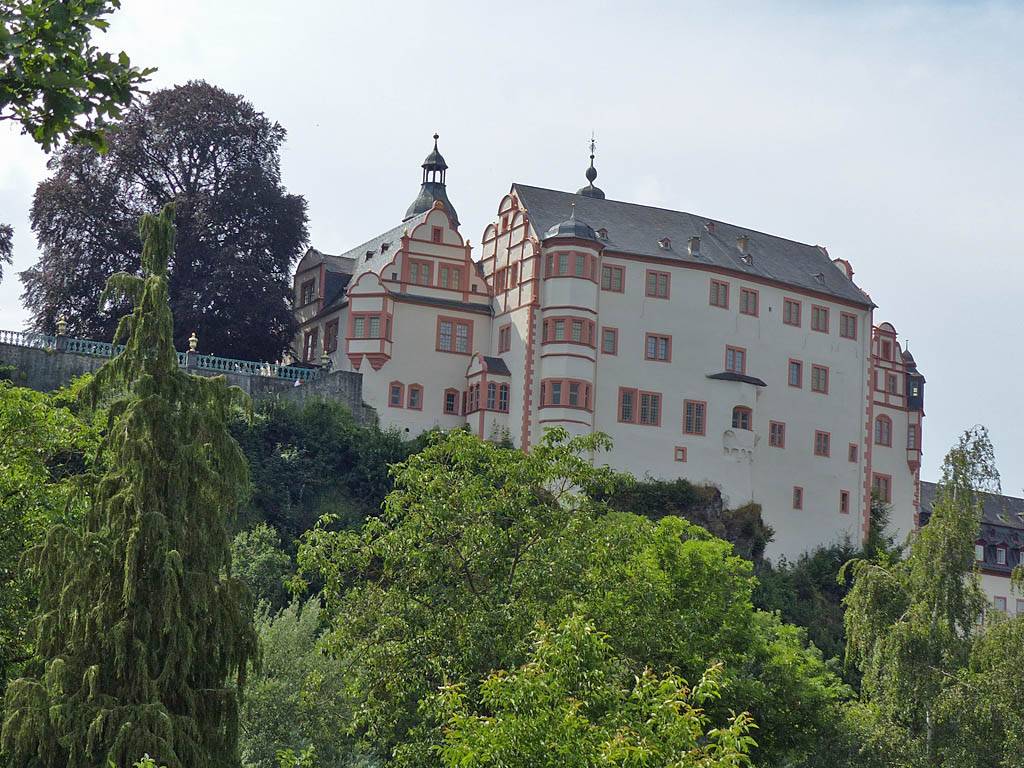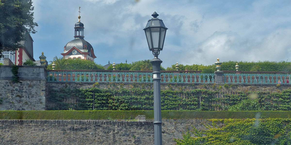 Driving down into Weilburg. | An arch way leading to Weilburg Castle. | Looking up at the Baroque style Garden from underneath (see later for view from above). | Nice 180 degree panoramic view from the car park. | Nice Weilburg architecture. | A large evangelical church close to the castle. |