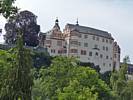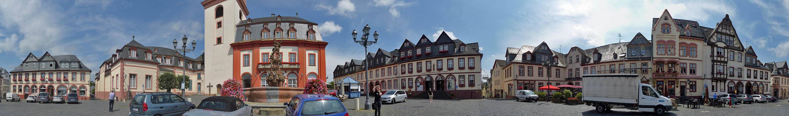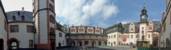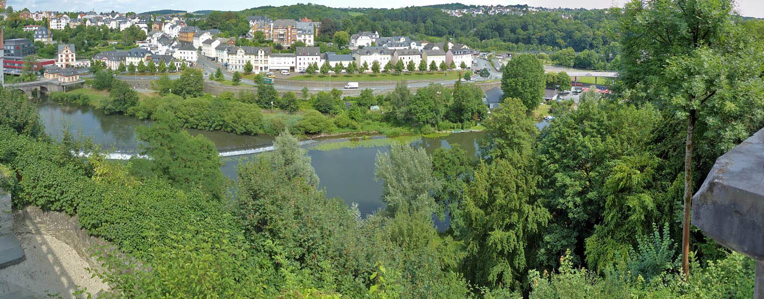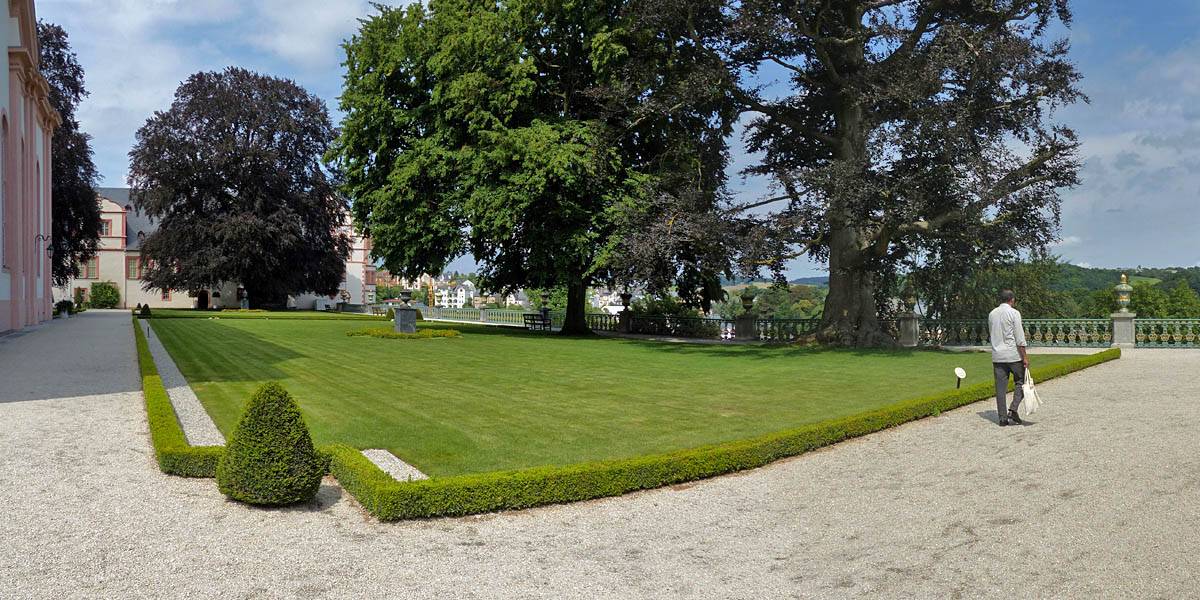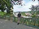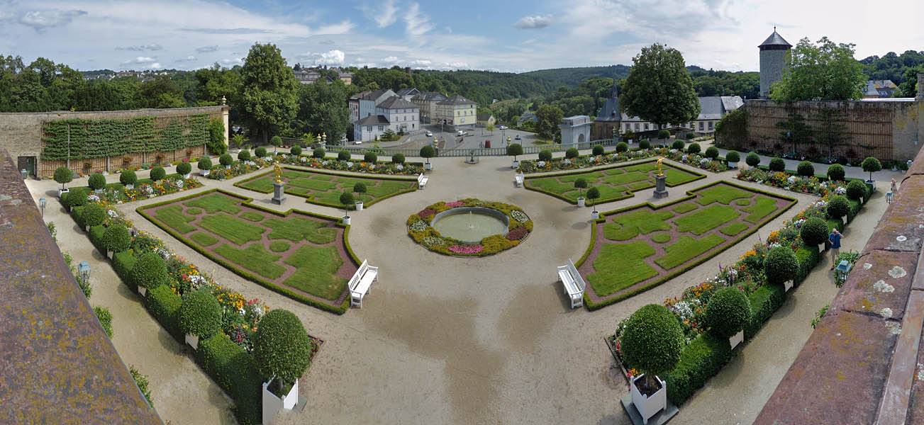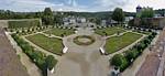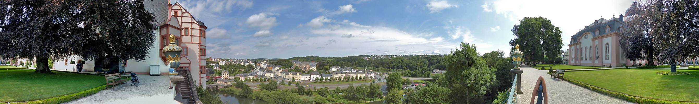 The castle gardens. | I think the castle owner's dog once jumped down over the edge into the water below and swam to its owner to join him on a hunting expedition. (TODO: Check this.) | Looking over the railings onto Weilburg below the rock wall in both panoramas and also around the gardens in the 360 degree panorama. Admittedly it made Renée look all arms! |