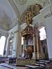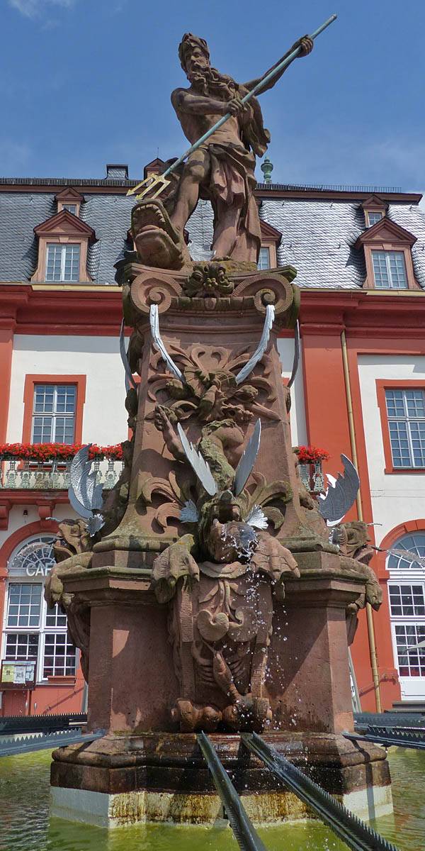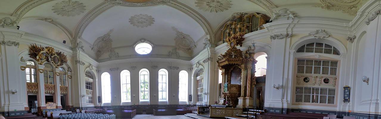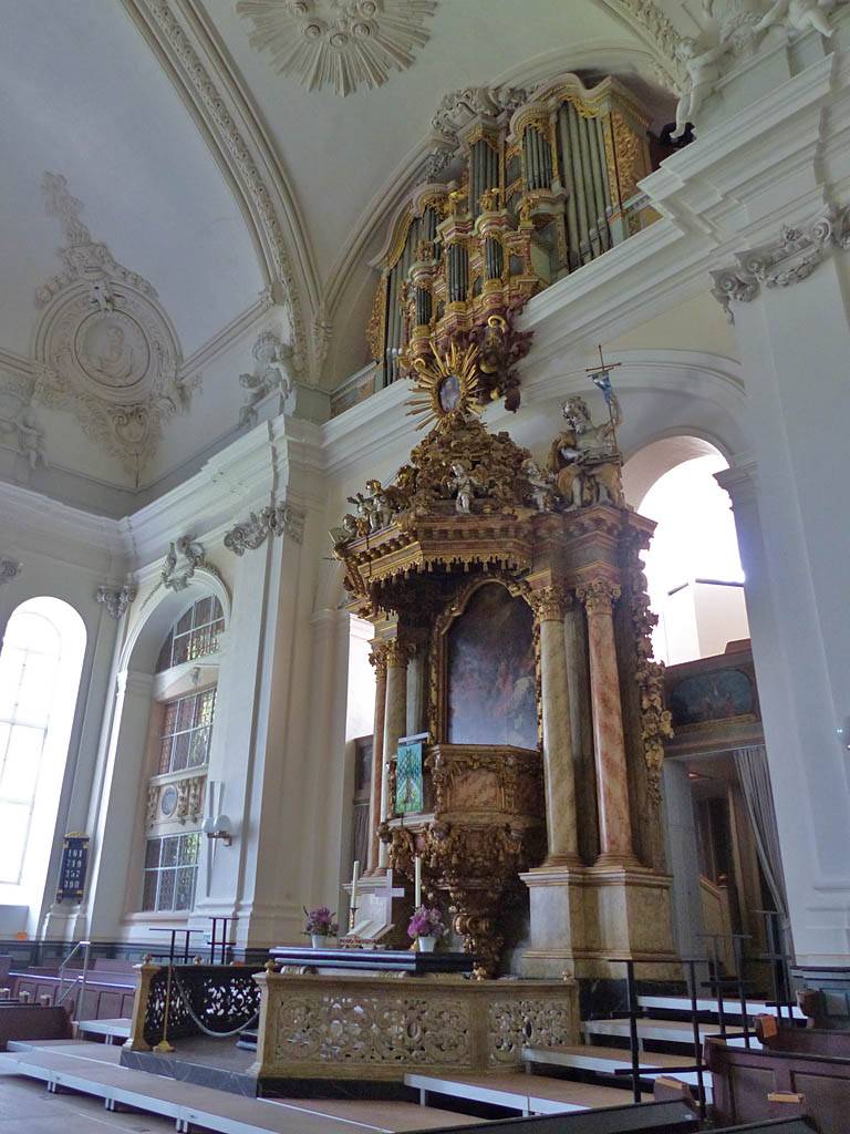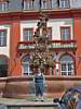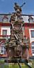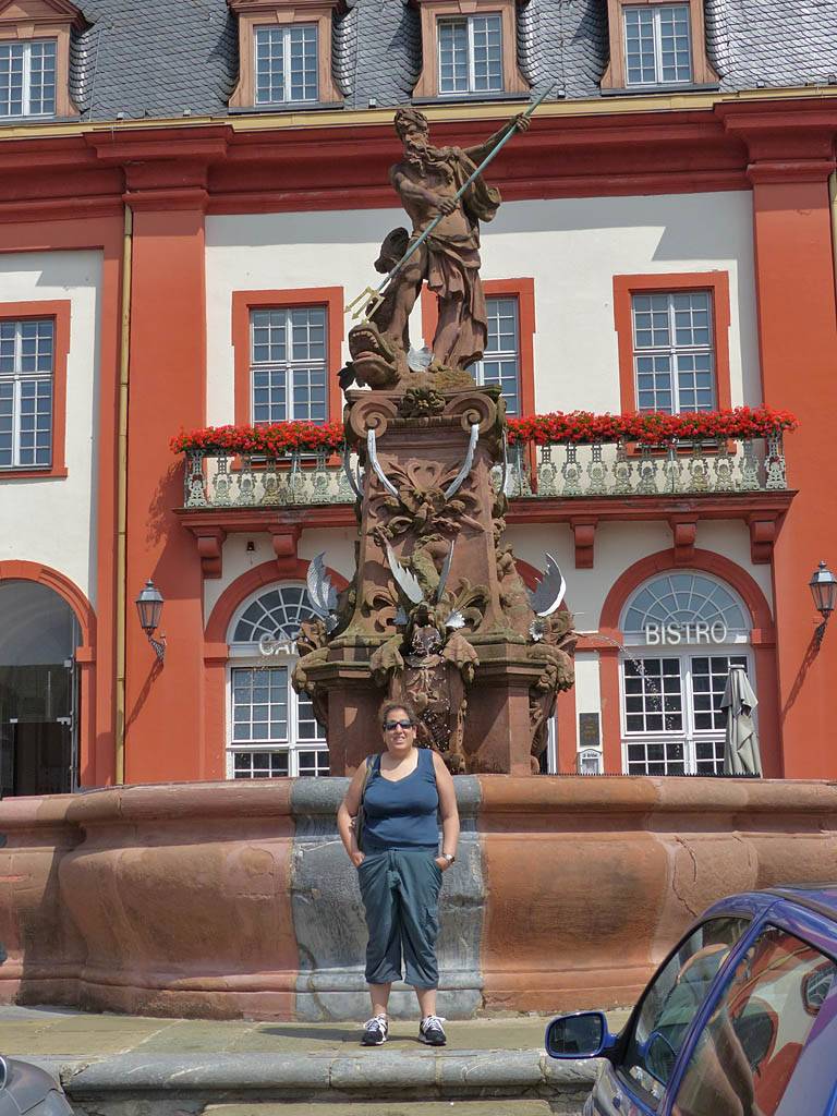 360 degree panorama of the market place square outside the church and castle. | Renée outside the church and in front of the Poseidon themed fountain. | A closer look at the fountain. | The organ inside the church. |
