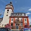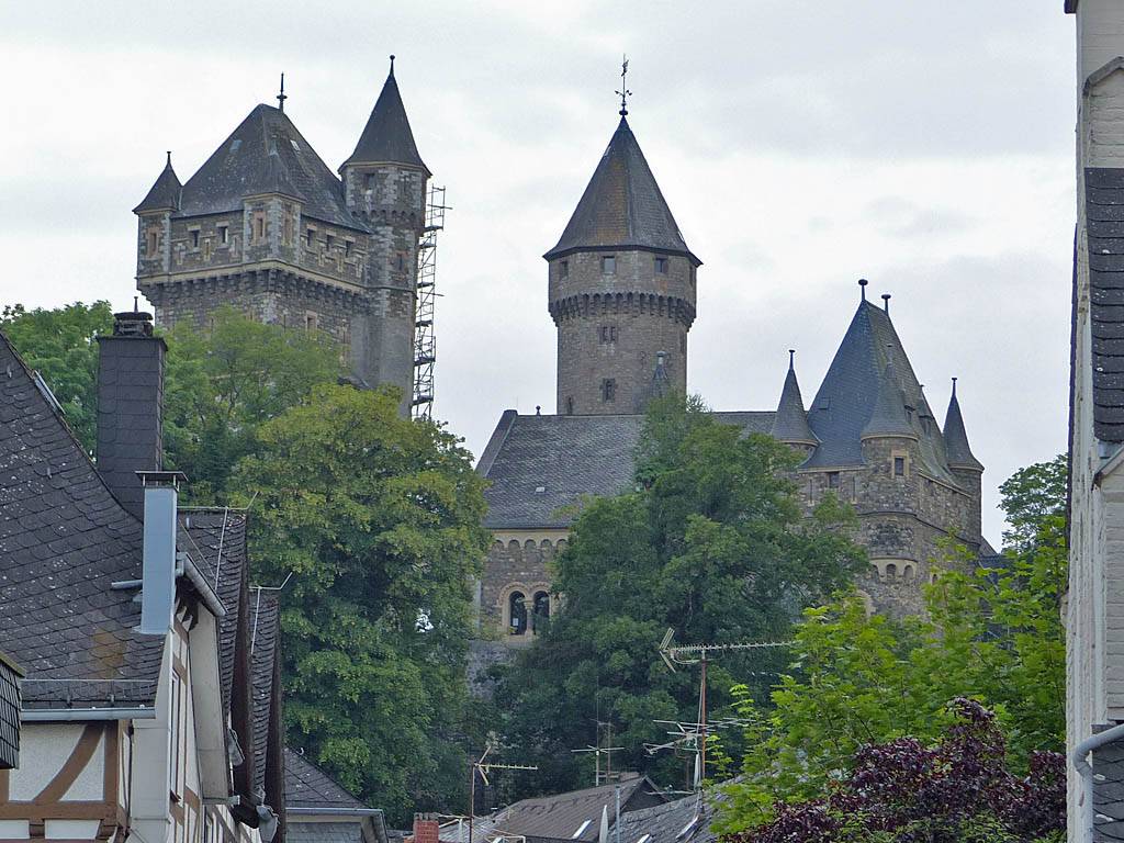 At 3:15PM we drove off and headed back via Rewe supermarket where we bought more groceries, and bread and nosh. We got home at 4PM where a nice tea break was enjoyed before we headed out again at 4:45PM to meet Silvia at Braunfels castle. Thunderstorm activity had thrown a veil of high cloud over us which was nice as the temperature was more pleasant now. We parked up at 5PM and had a short walk up the hill to a spectacular gothic fairytale castle. We met up with Silvia who took us on a private tour. The central courtyard was lovely with chequerboard cobbles and a lion in the centre like a big mosaic. Silvia then took us inside and up to the top of the gothic tower. The view from the top, albeit through dirty windows, was spectacular. Most tours don't access this tower so we felt rather priveleged. Then we had a tour of the main rooms on display. Two Israelis joined us as their main tour was German only and they spoke English just like us. The rooms were full of big paintings, tapestries, big furniture and so on. The hunting room was full of antlers. Once the room tour finished we headed outside to some cannons and ramparts before heading round past a garage of very old cars into a church. Then we exited through a gorgeous market square at 6:15PM.