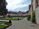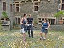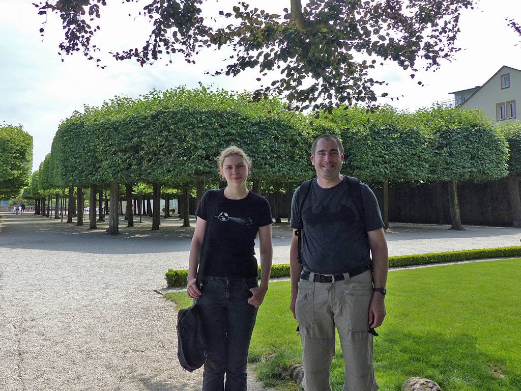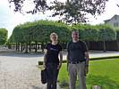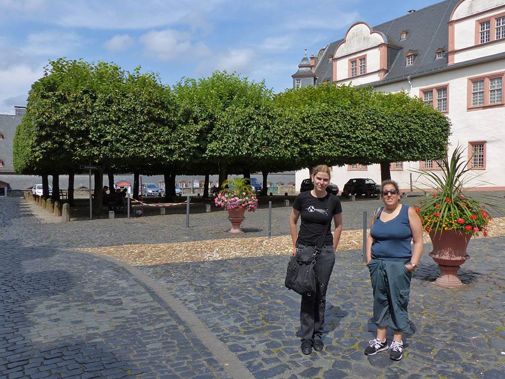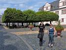 Dagmar and Renée by the stand of trees just outside the castle entrance. | Looking West along Neugasse from the castle entrance. | The courtyard inside the caste set up for a concert. | Looking up at the towers and walls inside the courtyard. | Exploring the baroque style geometrical gardens of the castle. |