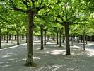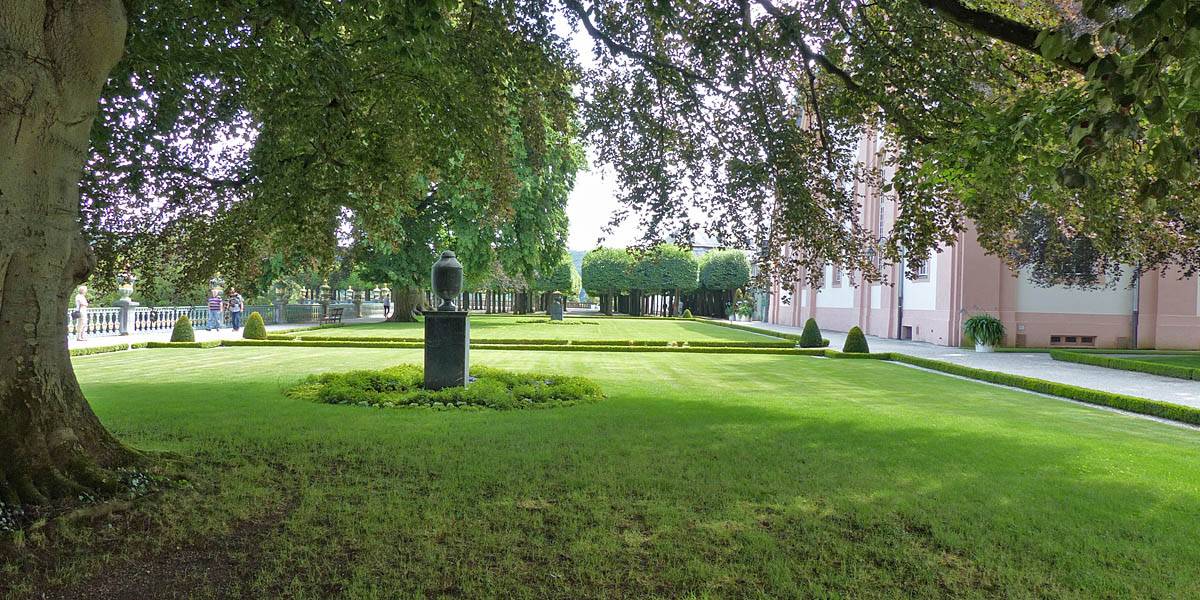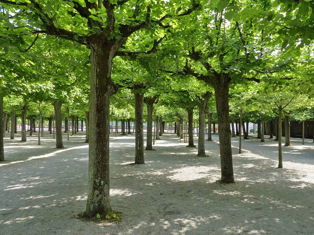Mike enjoying the gardens and the view. | Dagmar and Mike in front of a stand of trees in the garden. | Walking under the stand of trees. | The baroque style garden from above that we saw from below as we arrived in the car. | Looking back across the garden that we just walked through. |