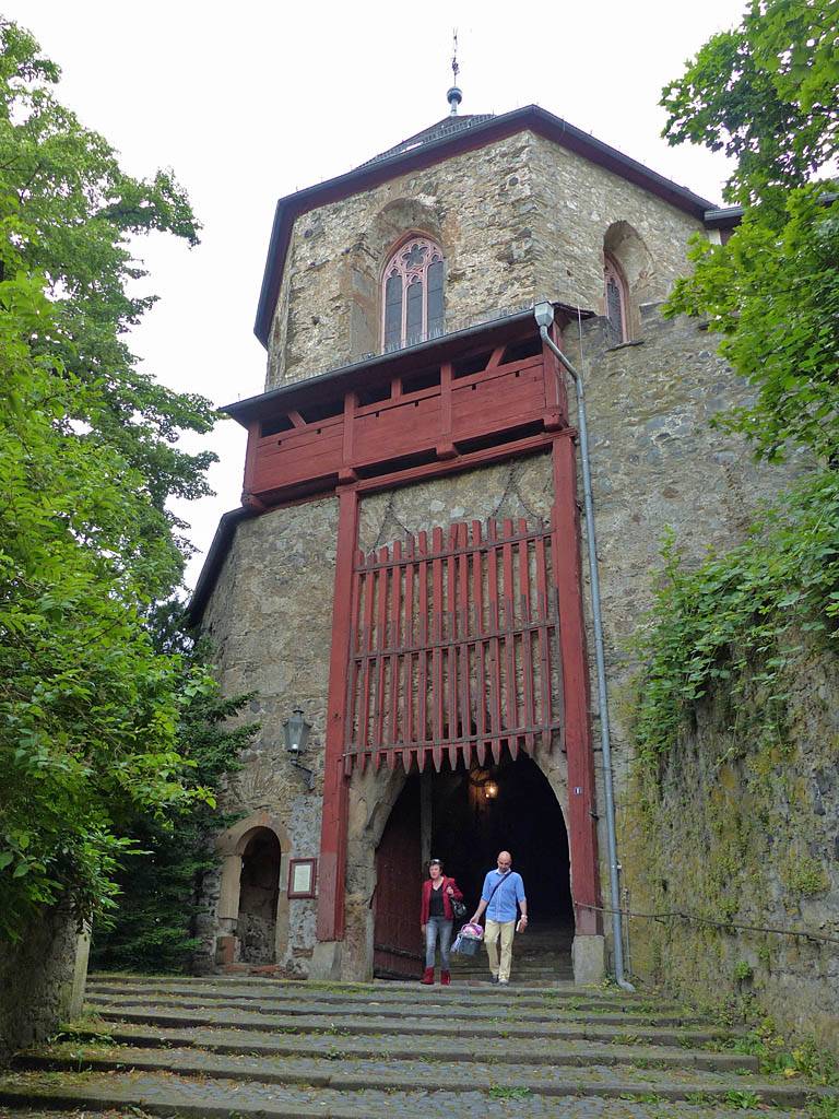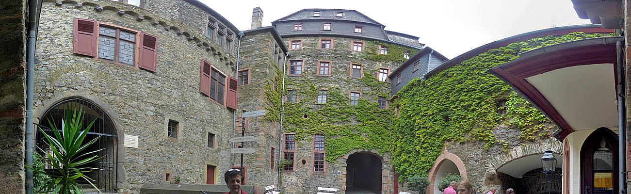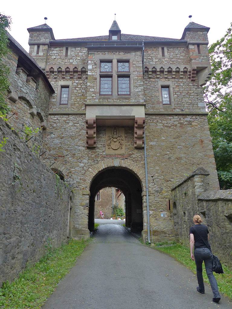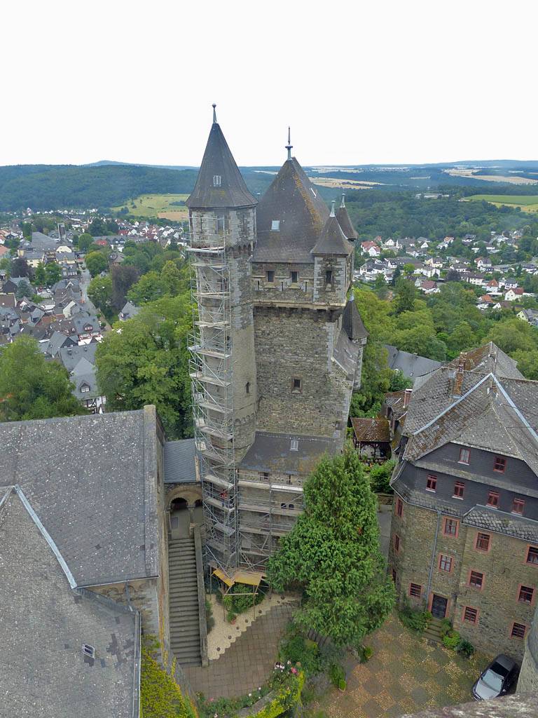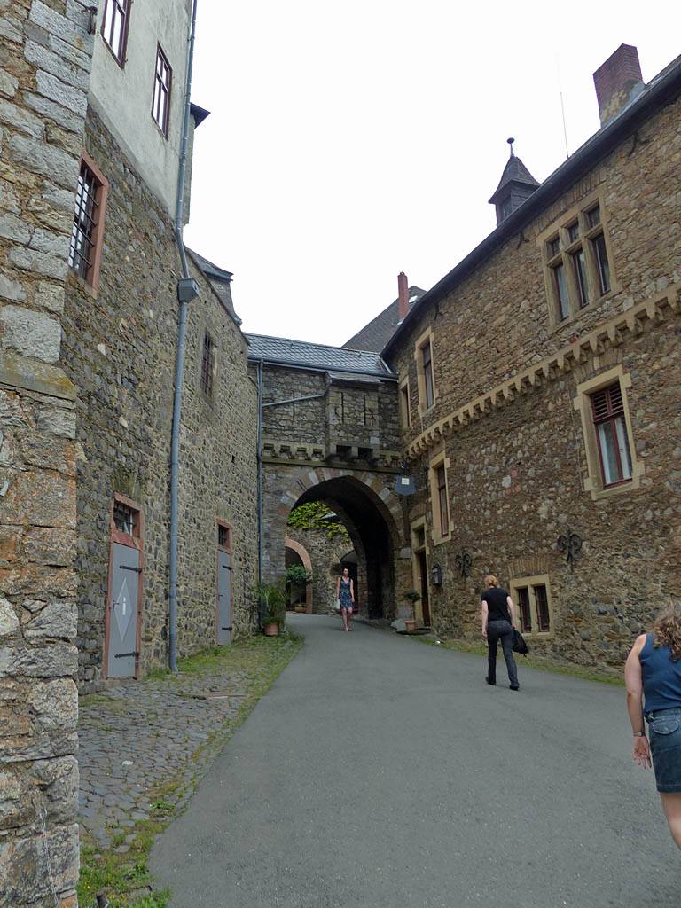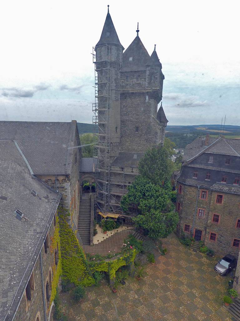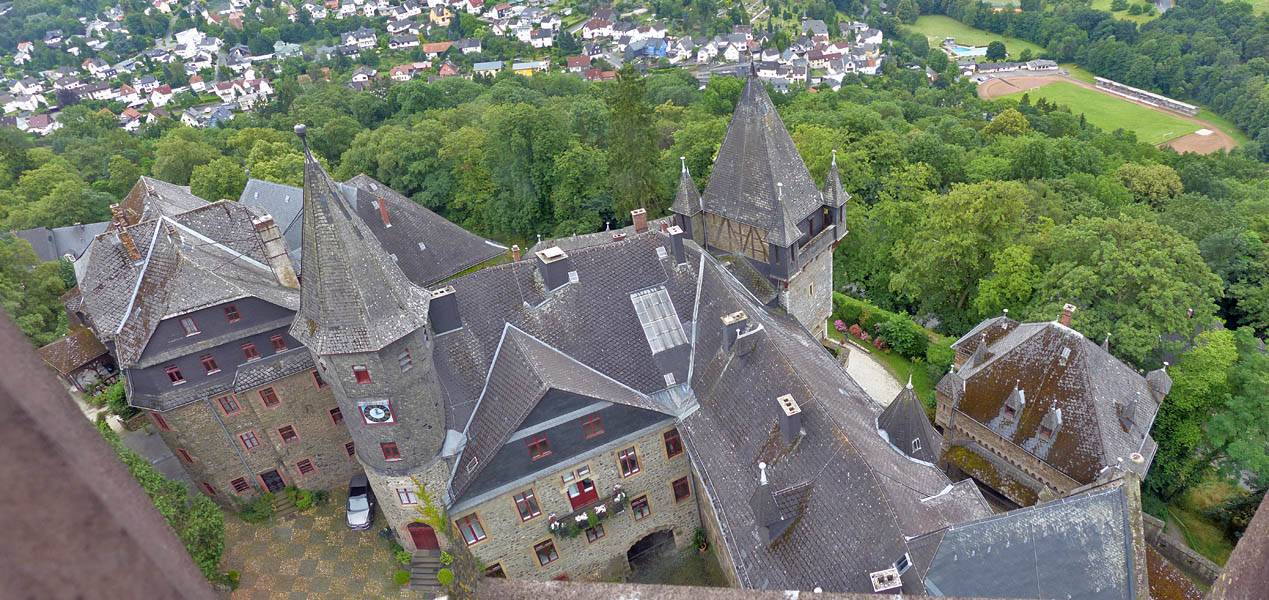 Looking down at other parts of the castle from the top of the gothic tower. | Philippstein to the South has its own castle. | Time to go back down the stairs. | After the tour of the inside rooms (no pictures), looking back at the exit we came out of. |
