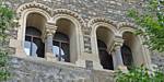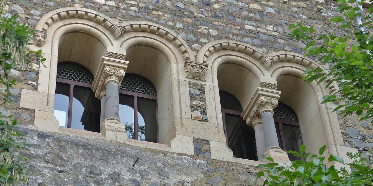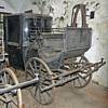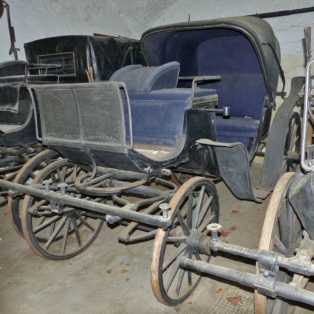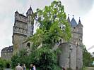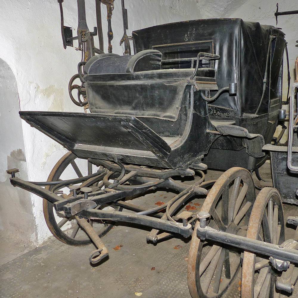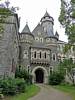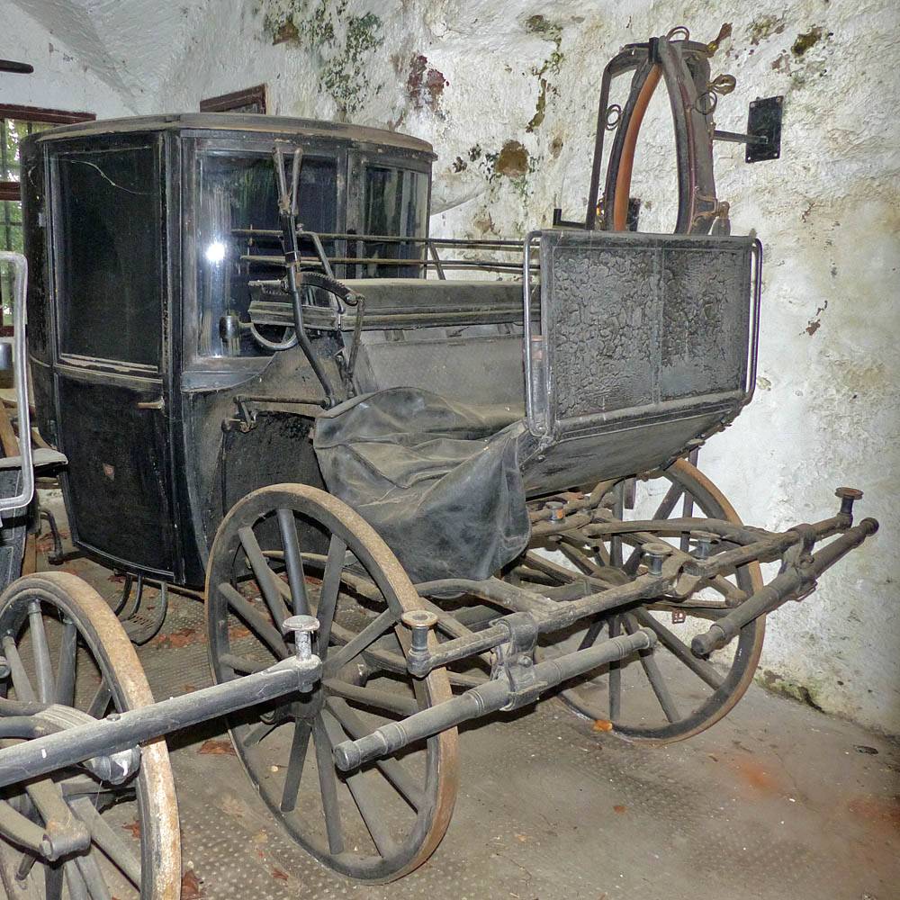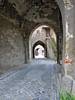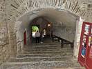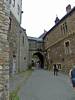 Three very old cars in the garage. | Looking up at the castle from the car garage. | Nice gothic castle windows. | Exiting towards the market square. |