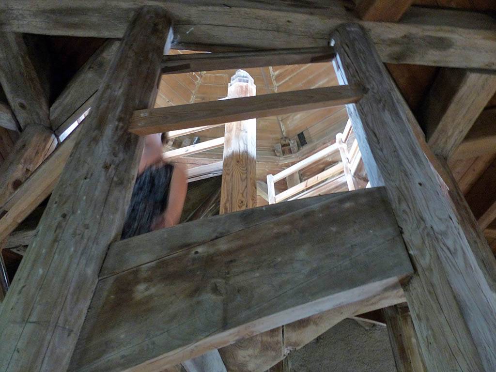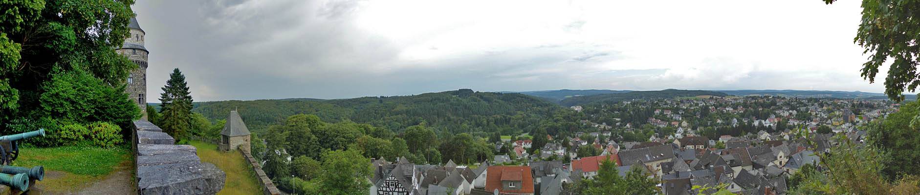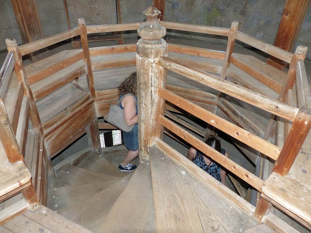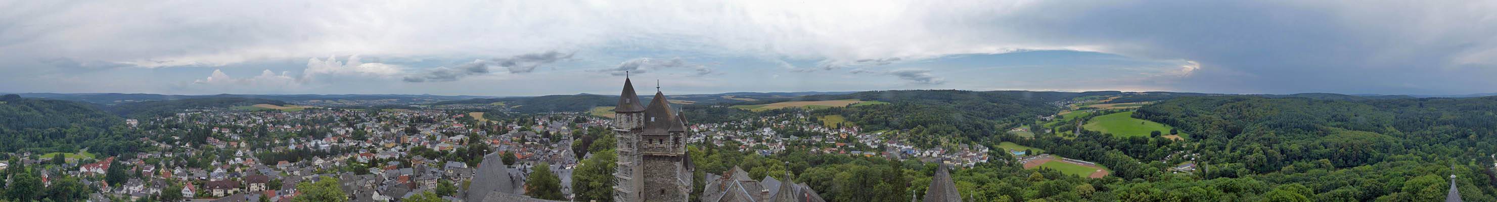 Half way up the gothic tower. | Dagmar, Silvia and Renée half way up the gothic tower. | A wooden spiral staircase takes us to the top. | 360 degree panorama from the top of the gothic tower. The whole of Braunfels and the surrounding countryside are laid out before us. |