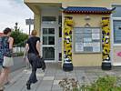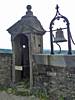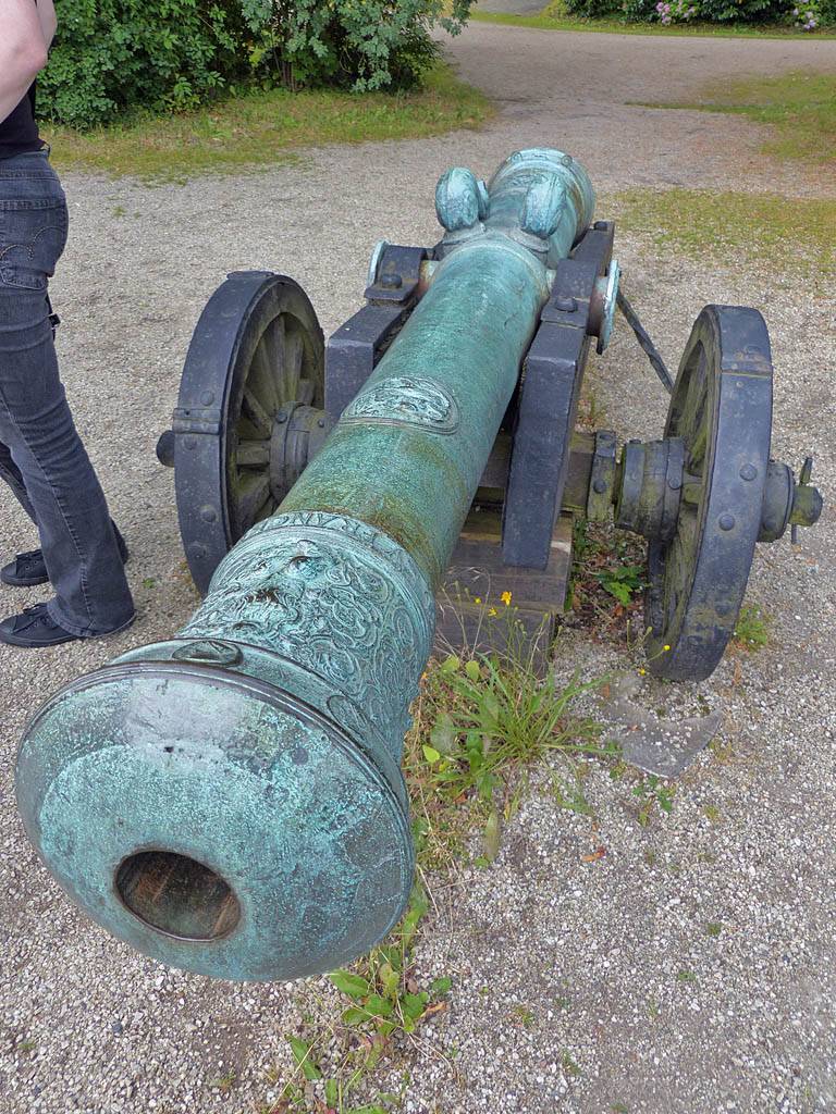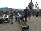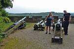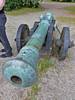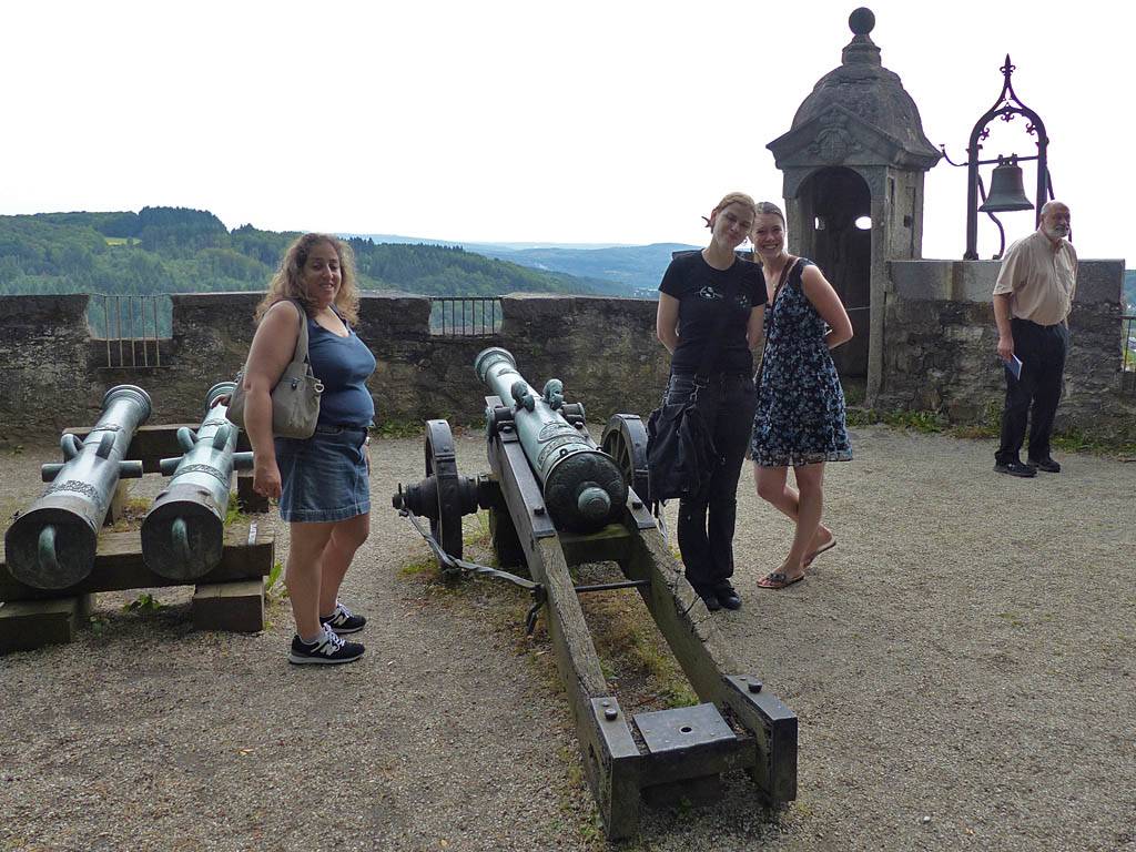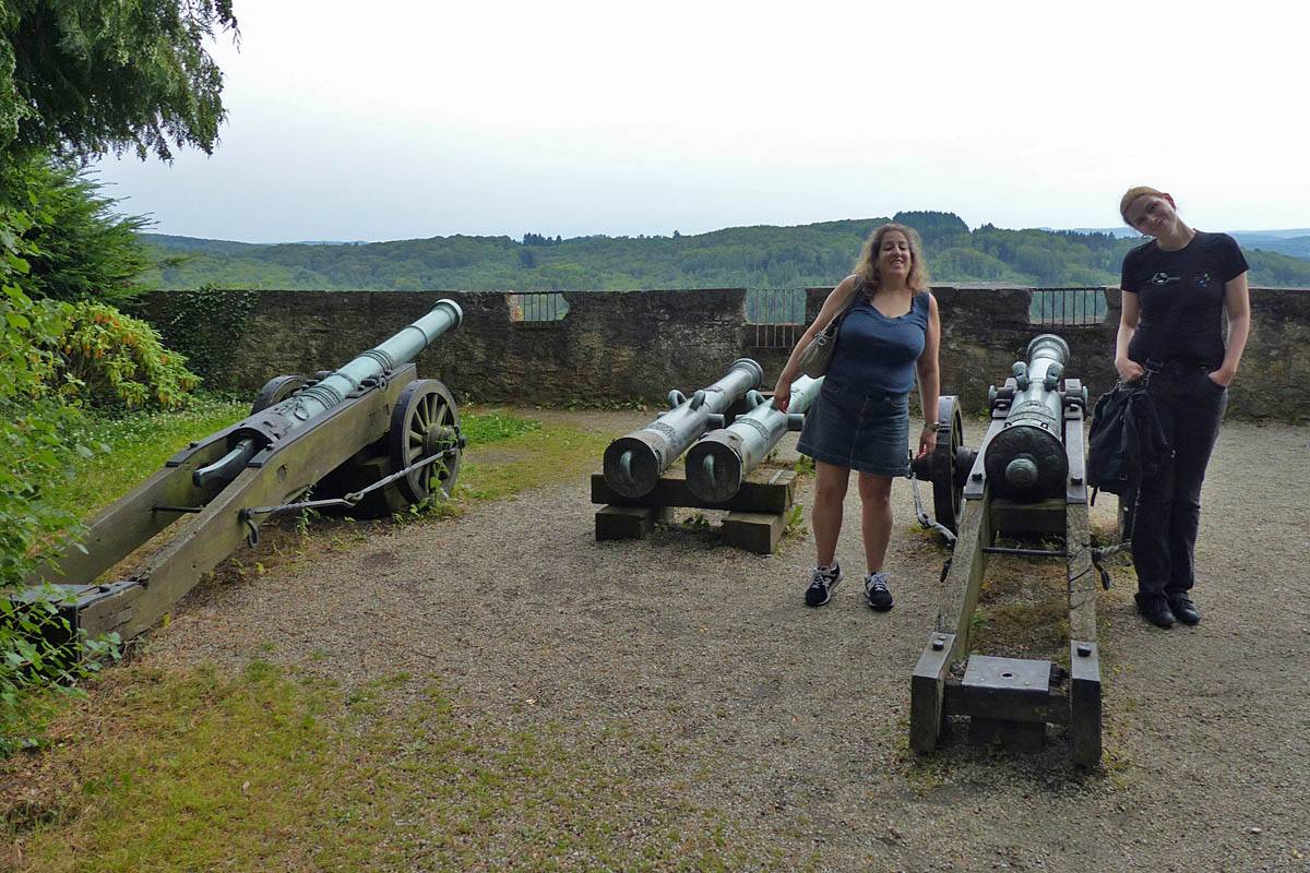Renée, Dagmar and Silvia at the cannons. | The view from the gun emplacement. | A hut and a bell at the gun emplacement. | Closeup of one of the cannons. | Walking on towards the car garage. |
