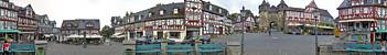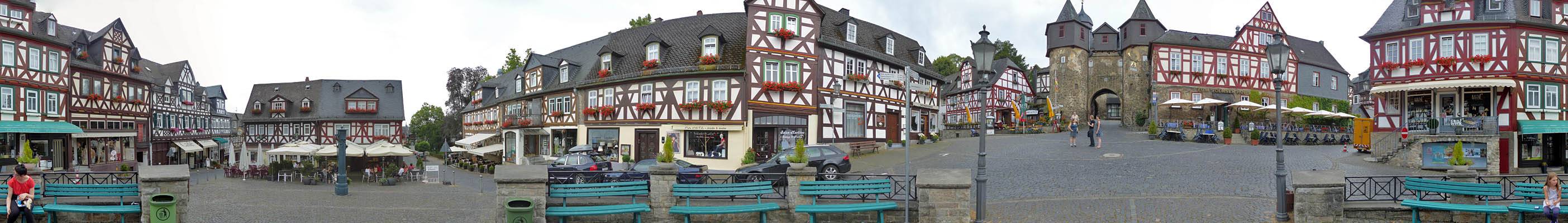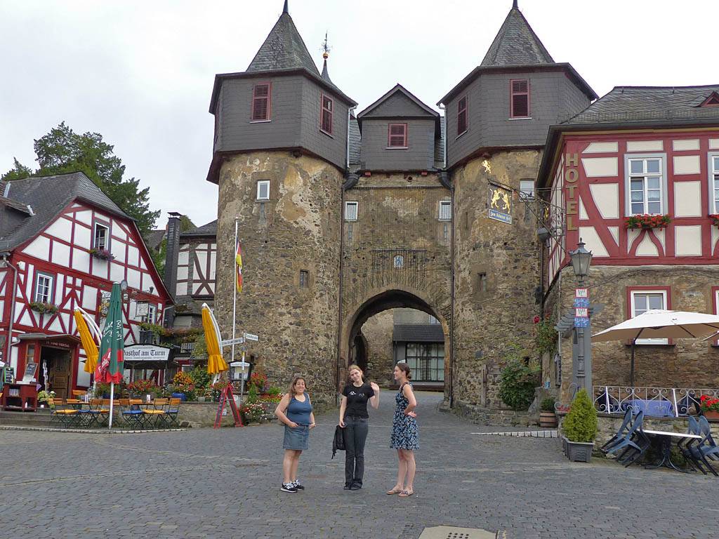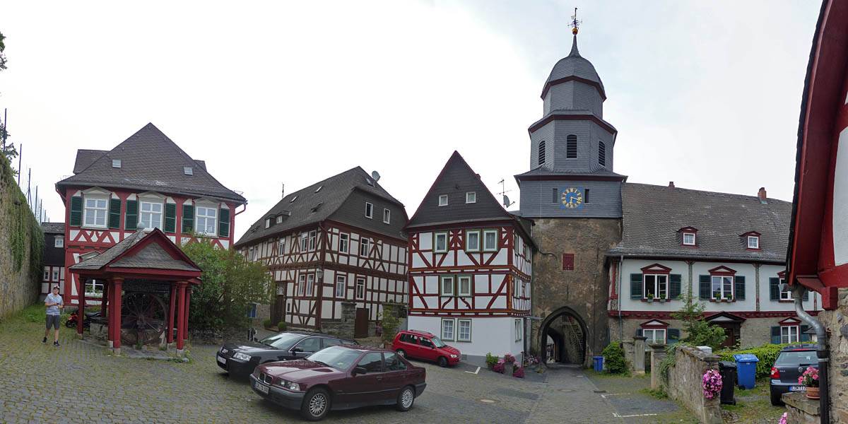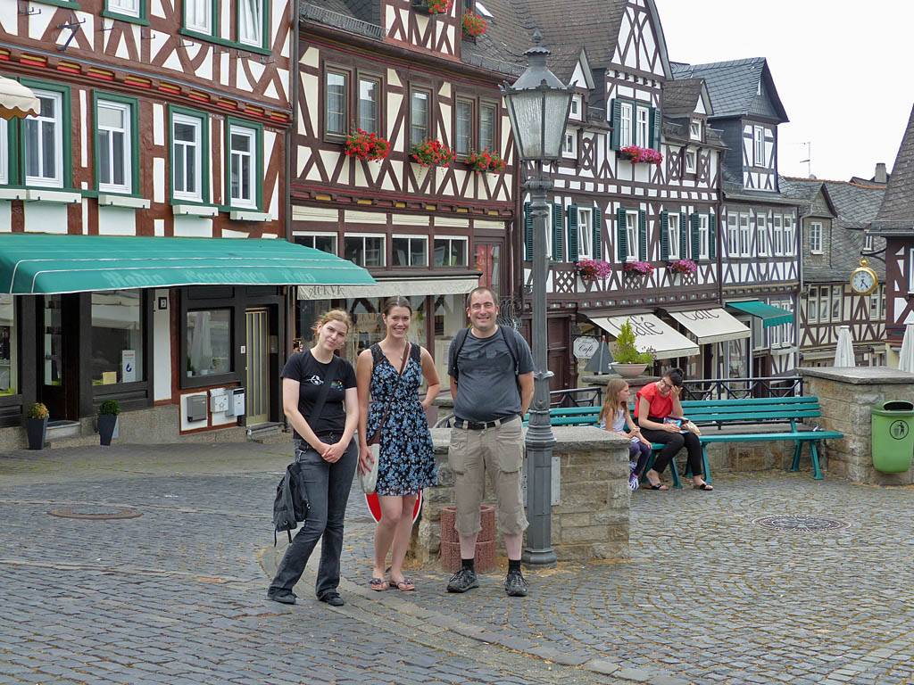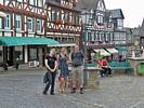 The view of the market square from the tunnel which we walked down from the castle. | 360 degree panorama of Braunfels market place. The castle is to the West of the square. | The Eastern entrance into the castle with Renée, Dagmar and Silvia in front. | Dagmar, Silvia and Mike at Braunfels market place. |