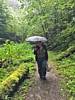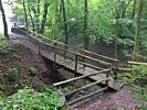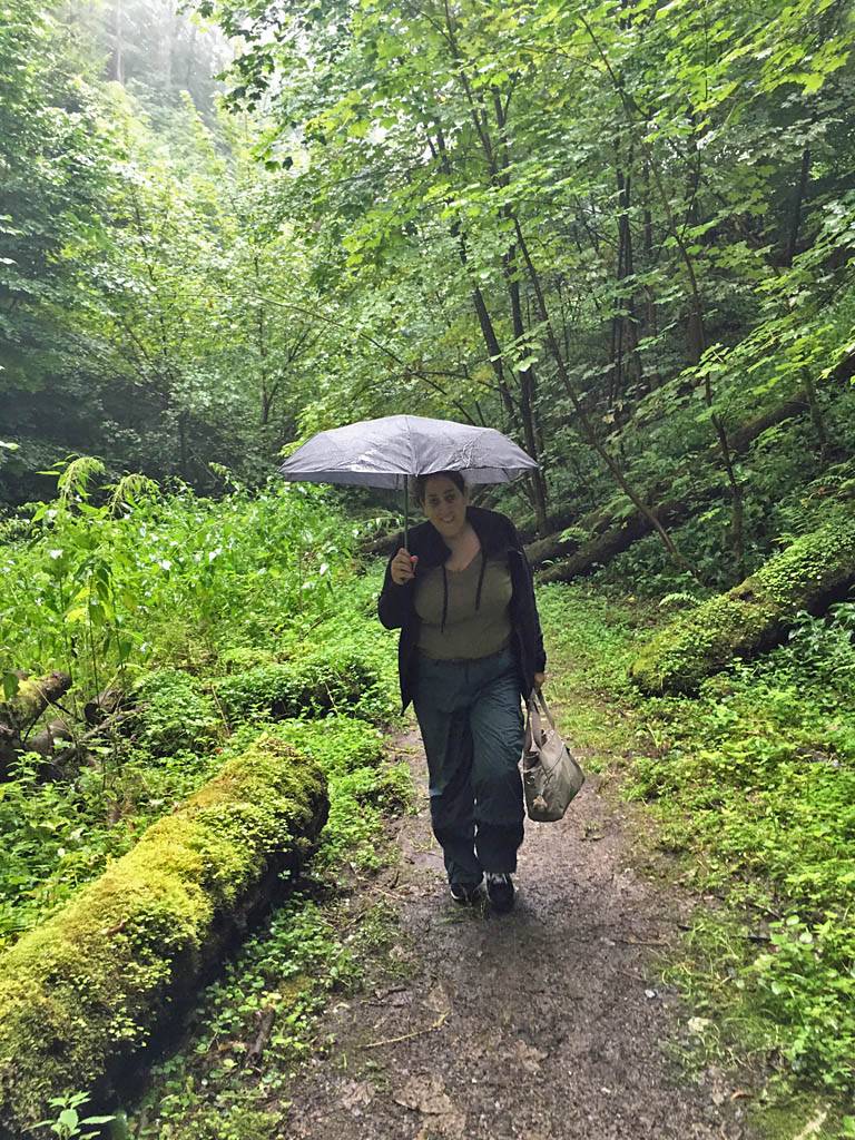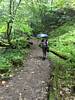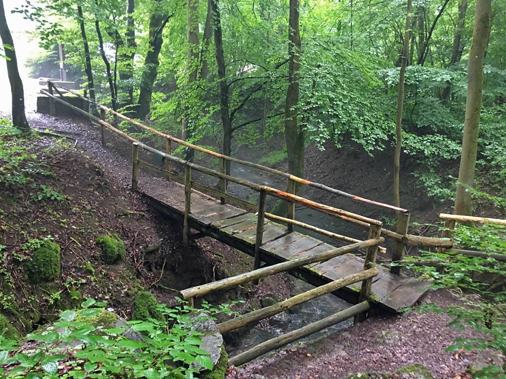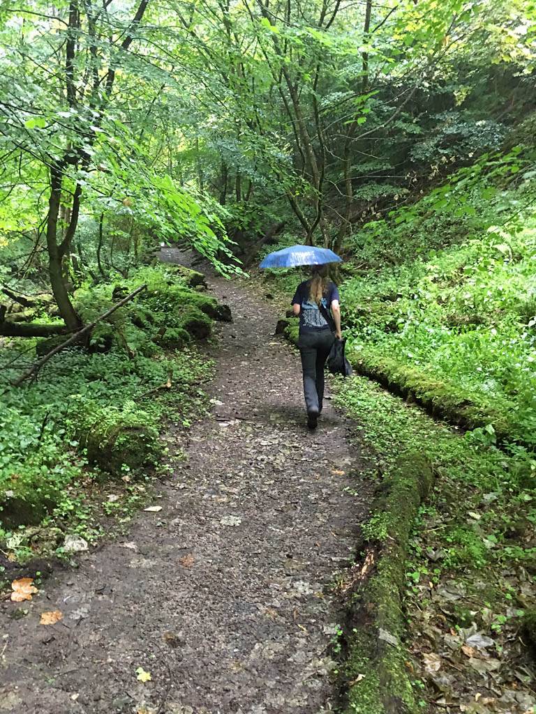The path through the woods from Erdbach to the cave. | A funky bridge over a stream. | Walking up through the woods under umbrellas. | Arriving at the cave. |