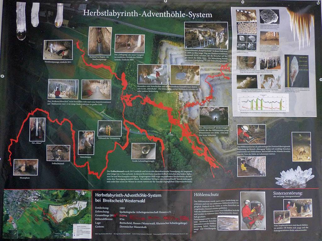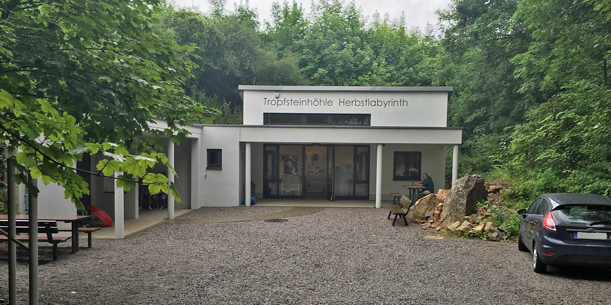 I woke up too early at 6:15AM. A fly was annoying me. I'm sure I woke Dagmar up too. Oops. But she went quiet again until 8:45AM. By the time I went down at 9AM Dagmar had vanished. Renée got up at 9:15AM and I had breakfast and tea. Dagmar soon returned from her parents' house with printouts. We were ready to go by 10:40AM when we set off for Herbstlabyrinth cave. It was cloudy and misty but drying out. Certainly it was a murky day with low cloud lying on the hills. After a drive along an Autobahn for a while we followed a nice road to a small village where we parked up at 11:15AM.