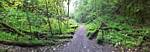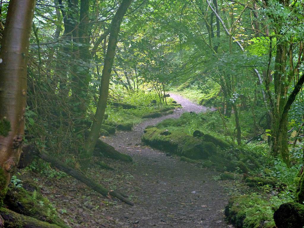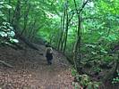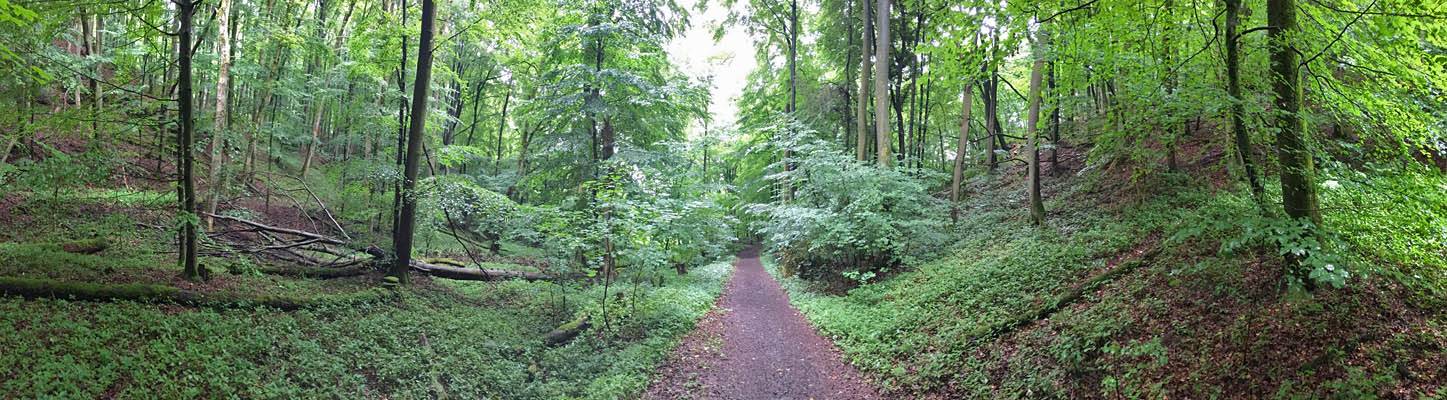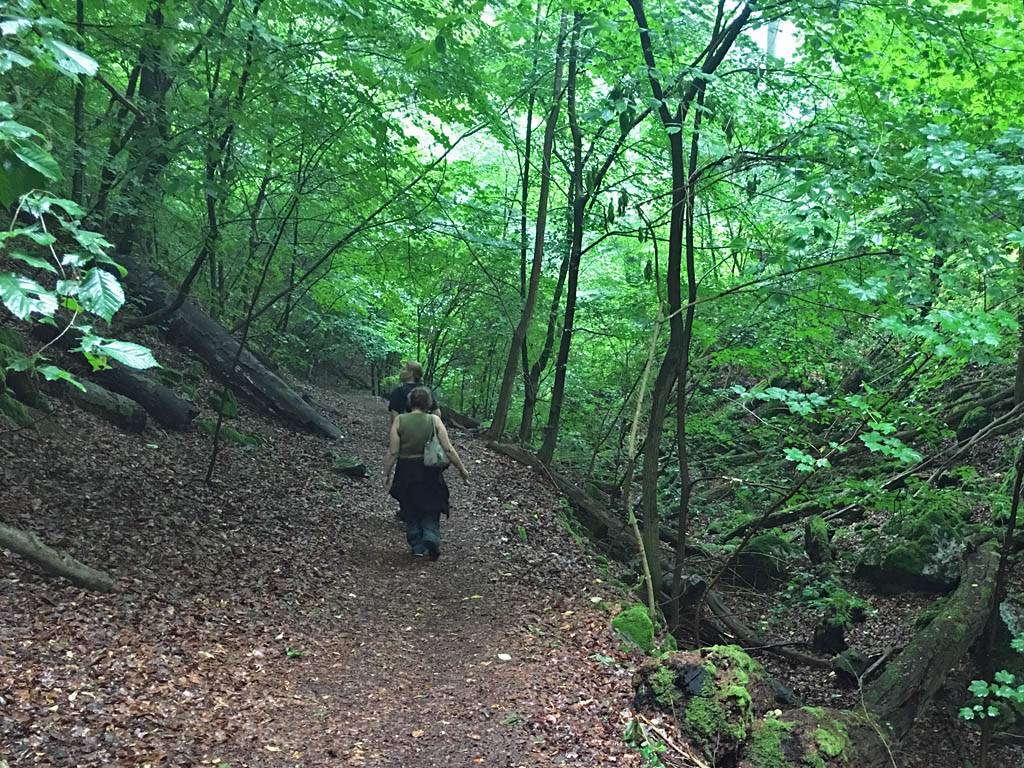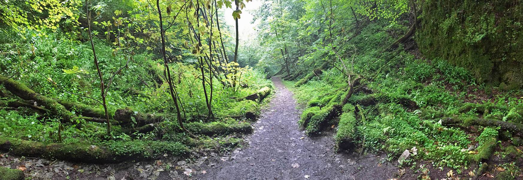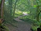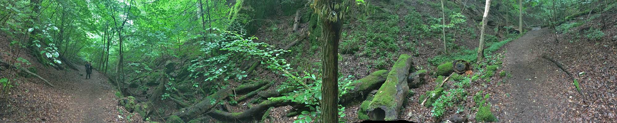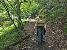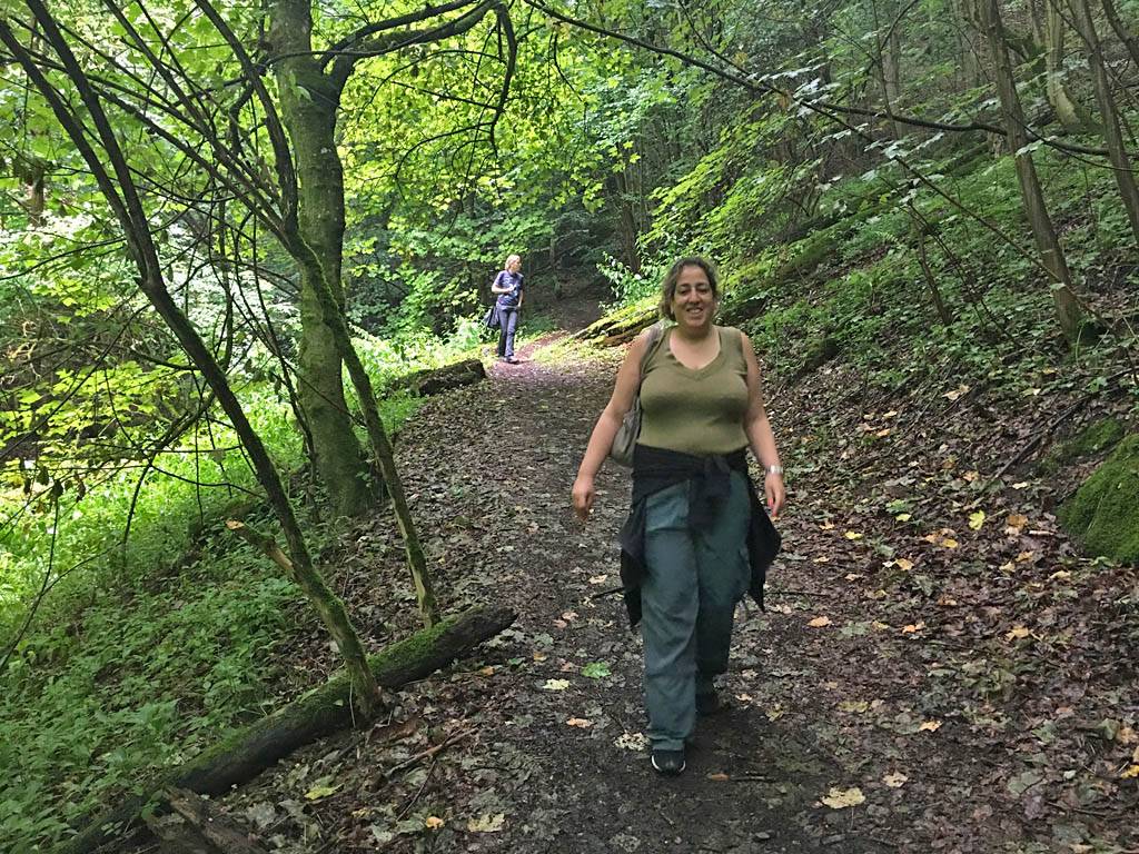 The misted up lens added an atmospheric haze to the shot. | Walking down the woodland path in better weather. | 180 degree panorama from downhill to uphill. | Dagmar and Renée enjoying the downhill walk. | A pretty path. |