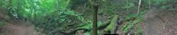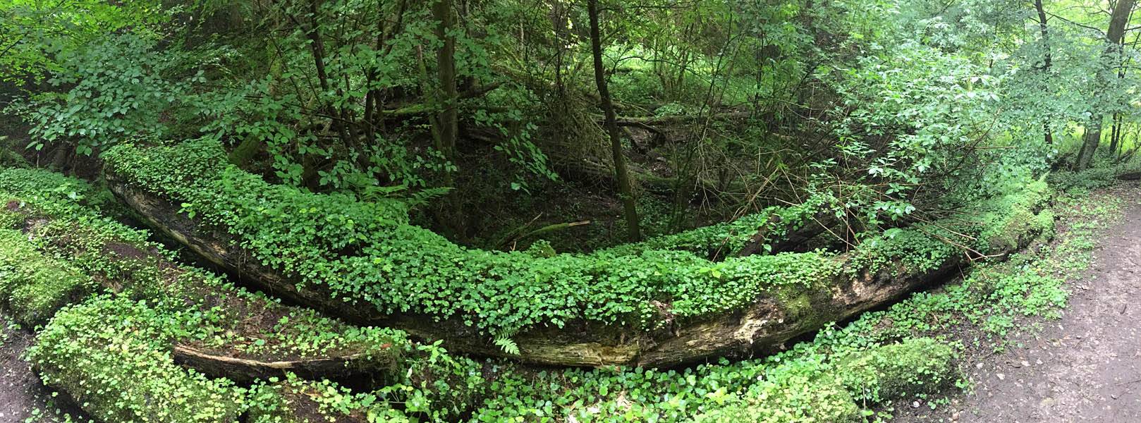 Views of the biggest plant covered log as my main camera almost finishes demisting and the iPhone panorama creates a scenic bend. | One more iPhone panorama before we exit the wood. | Lens fully demisted, I am able to capture a pictoresque view of the stream at the bottom of the wood near the wooden bridge. |