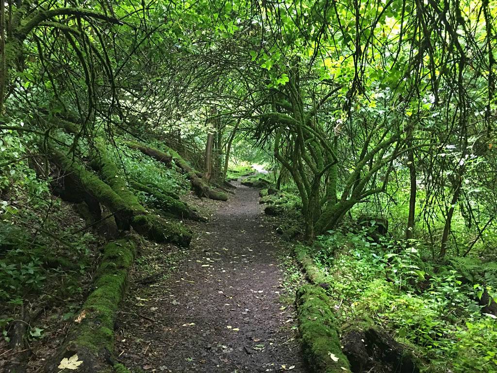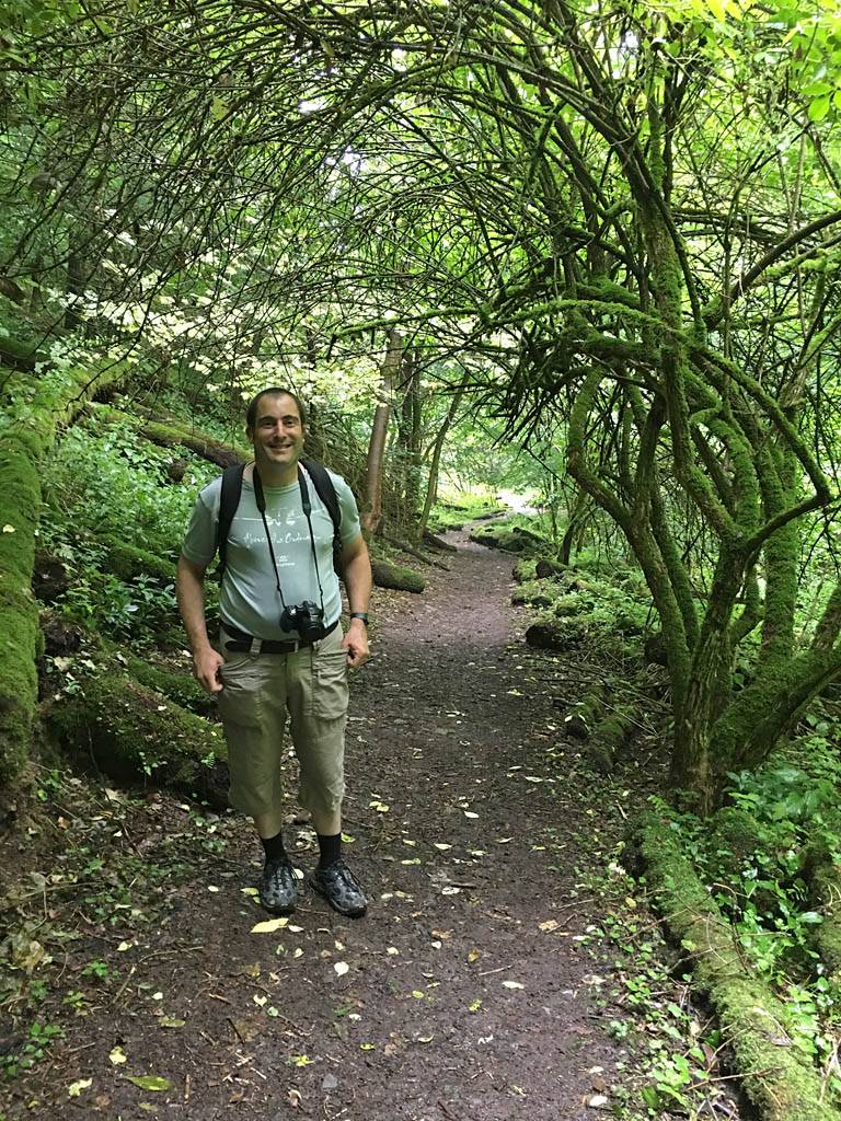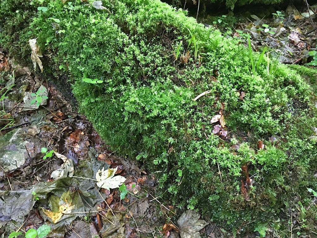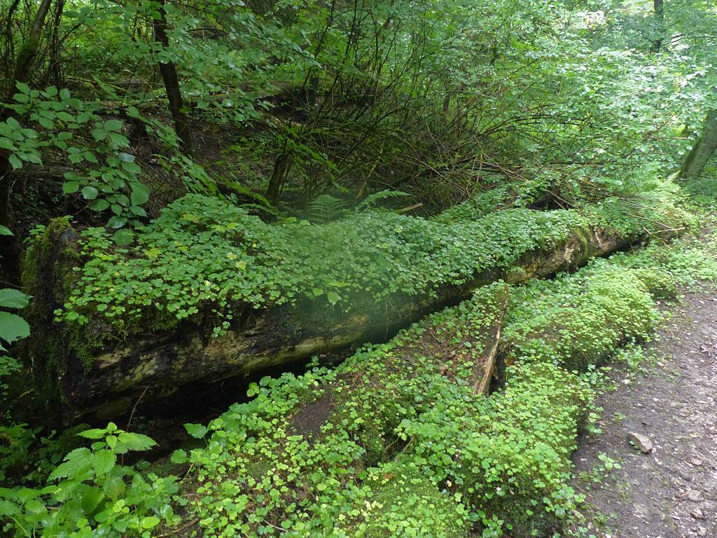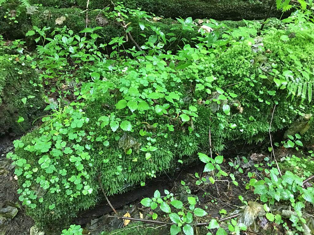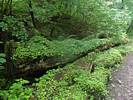This looks like a fairytale. | Mike, Renée and Dagmar on the fairytale path. | The logs here formed a whole ecosystem of their own. | Panorama of the plant covered log section of the path. |