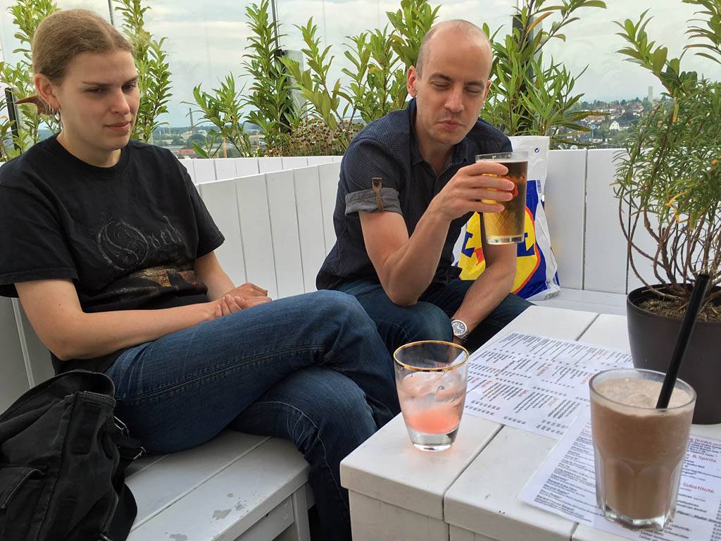 It was a 10 minute walk to the Dach Café entrance where there was a queue for one small lift to take us to the roof terrace. We soon got up there though. It was really nice up top in the sky bar. I took some pictures and we ordered drinks. Mathis had a cider beer, Renée had a Lychee Martini and I had a chocolate milkshake. Dagmar skipped as she was stuffed. Then after plenty of chit chat we decided at 8:45PM to pay up and then left for another bar by the station.