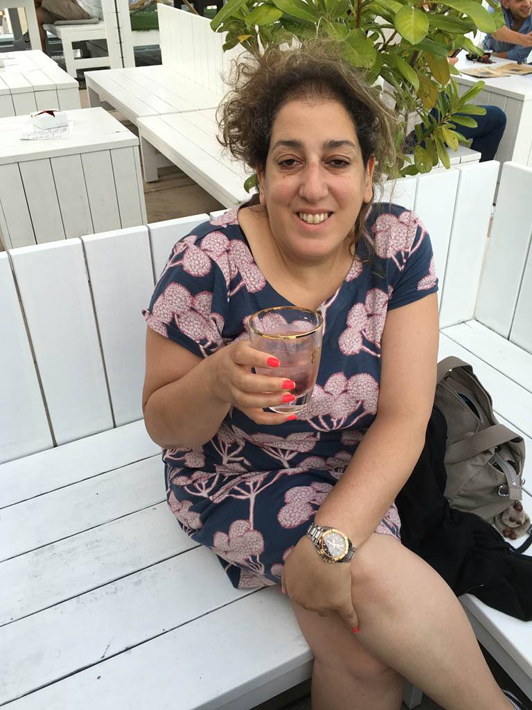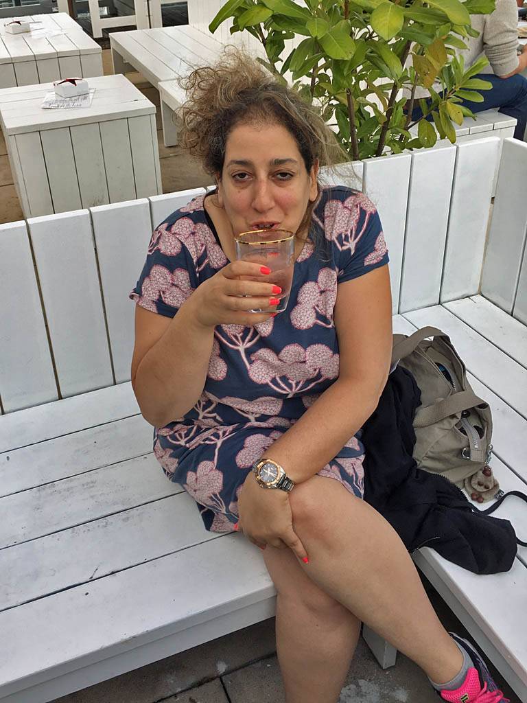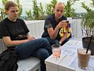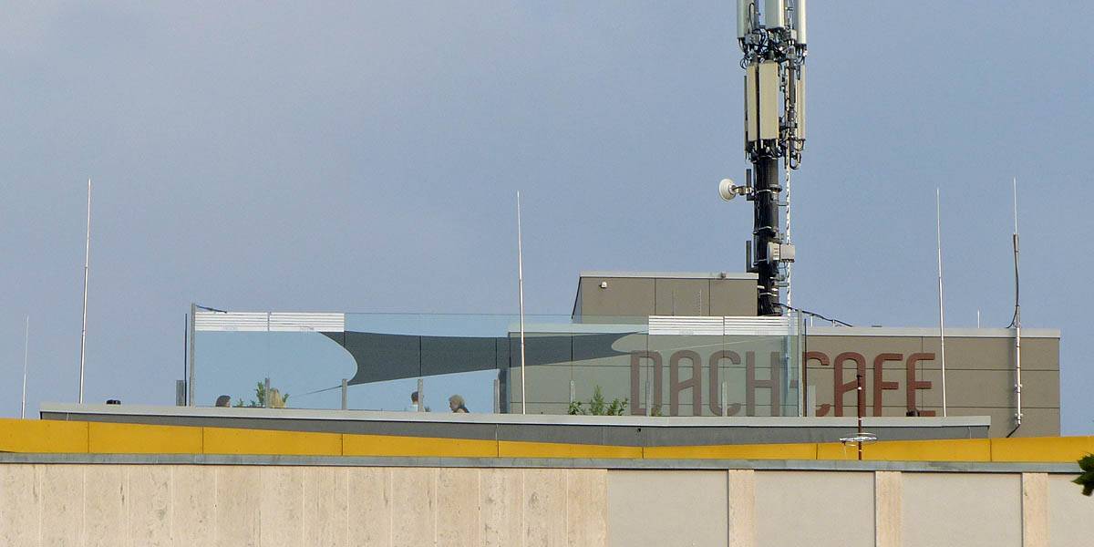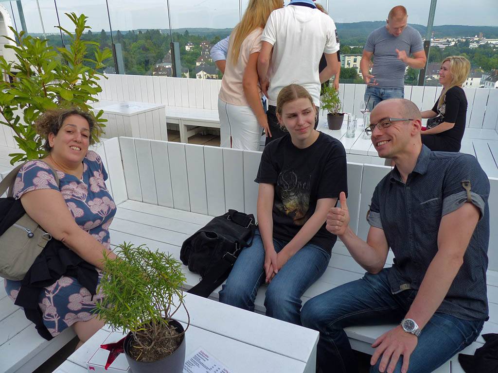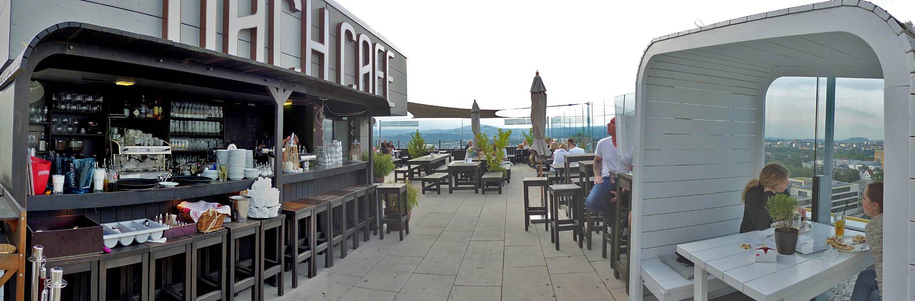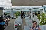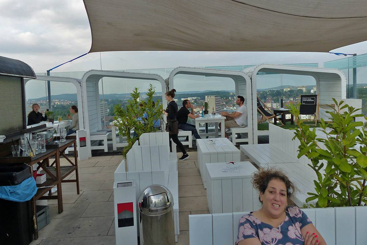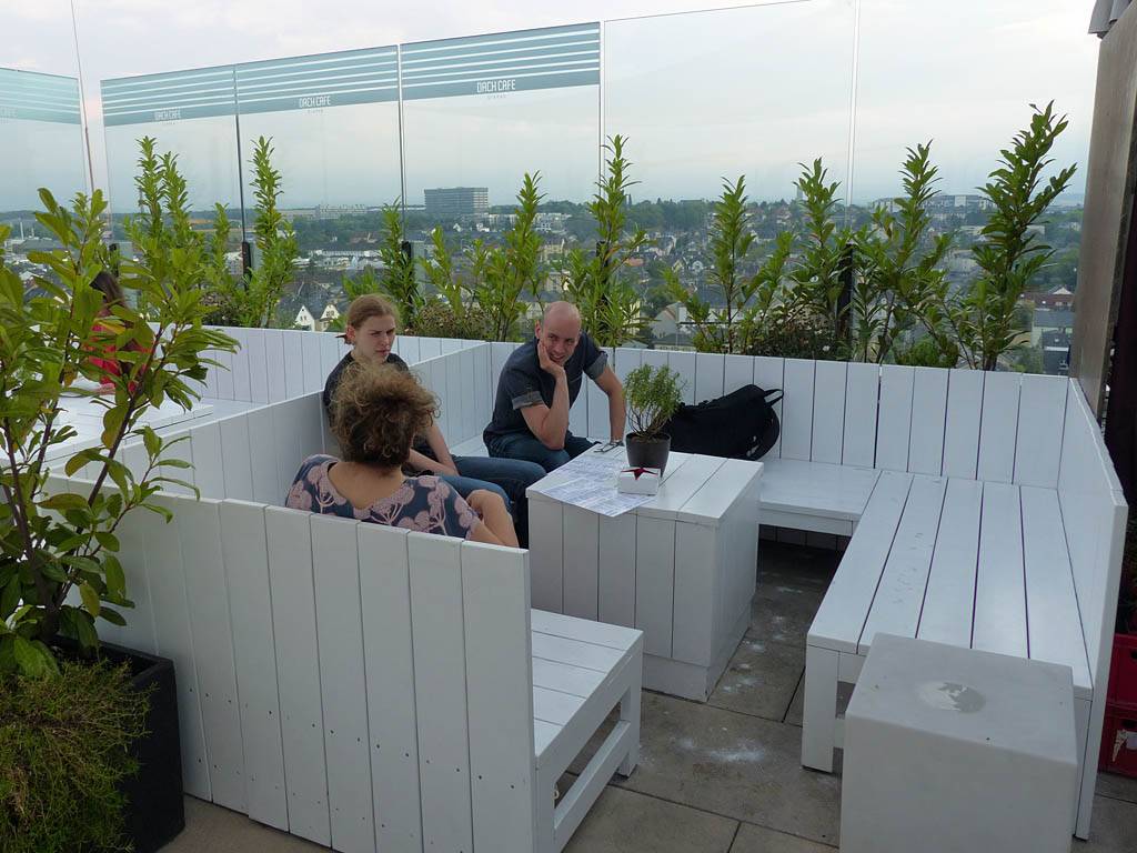 Approaching the Dach Café. | Renée, Dagmar and Mathis settling down at the sky bar. | Looking around the sky bar. |