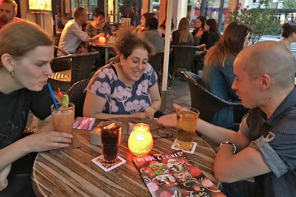 We arrived at 'Mr Jones' at 9:15PM. It was right next to the station so it wouldn't take us long to catch the last train home at 10:21PM. It was hot and stuffy inside but we found a much nicer table outside. Dagmar had a Pretty Woman mocktail (Pineapple, grapefruit, lime, almond and sugar syrup). Renée cheekily had an Orgasm (Sambuca and Baileys shot), while I had a diet coke and it was another cider for Mathis. We had plenty more chat, especially as Mathis and Renée became more jolly as the alcohol sunk in. We were running out of time as we had to catch the last train home so we paid up at 10PM, said goodbye to Mathis and then went to the station to catch the 22:21 train home.