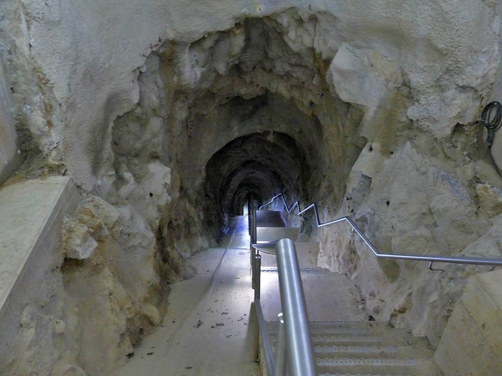 Waiting for the start of the tour while resting after the damp uphill slog. | A panorama of the entrance. The big door on the left is the way into the cave. | A map of the cave system. | The tourist friendly shaft leading us down into the show cave. The drop in temperature was quite remarkable. | The entrance through which the first explorers discovered the cave system. |