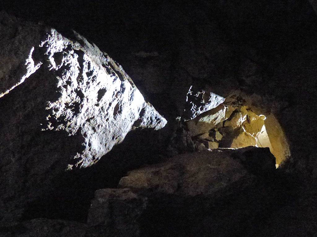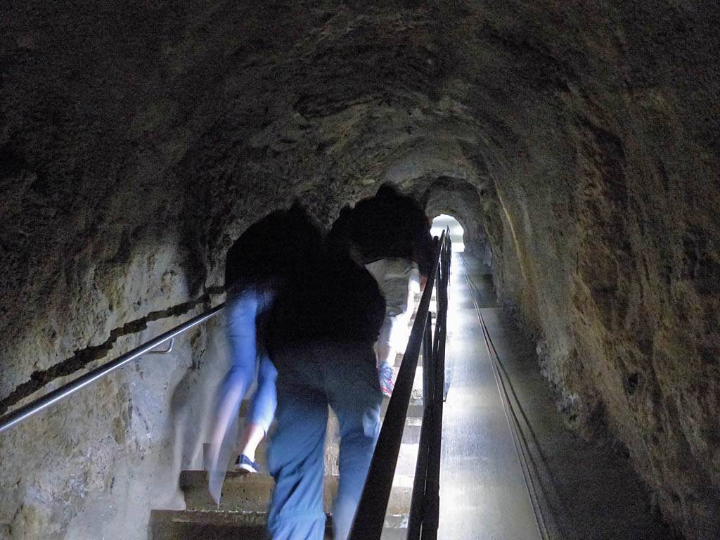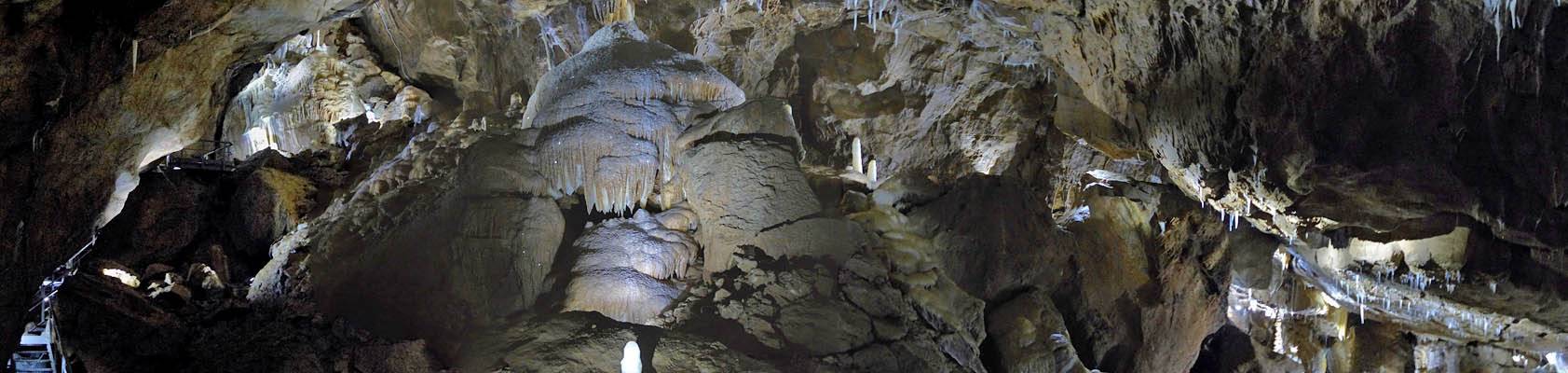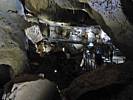 Back near the entrance, this panorama consolidated the view incorporating many of the above pictures. | The guide showing us samples of stalagtite sections highlighting with a torch their structure. | One last pretty panorama. | Returning back to the surface as the tour ends. |