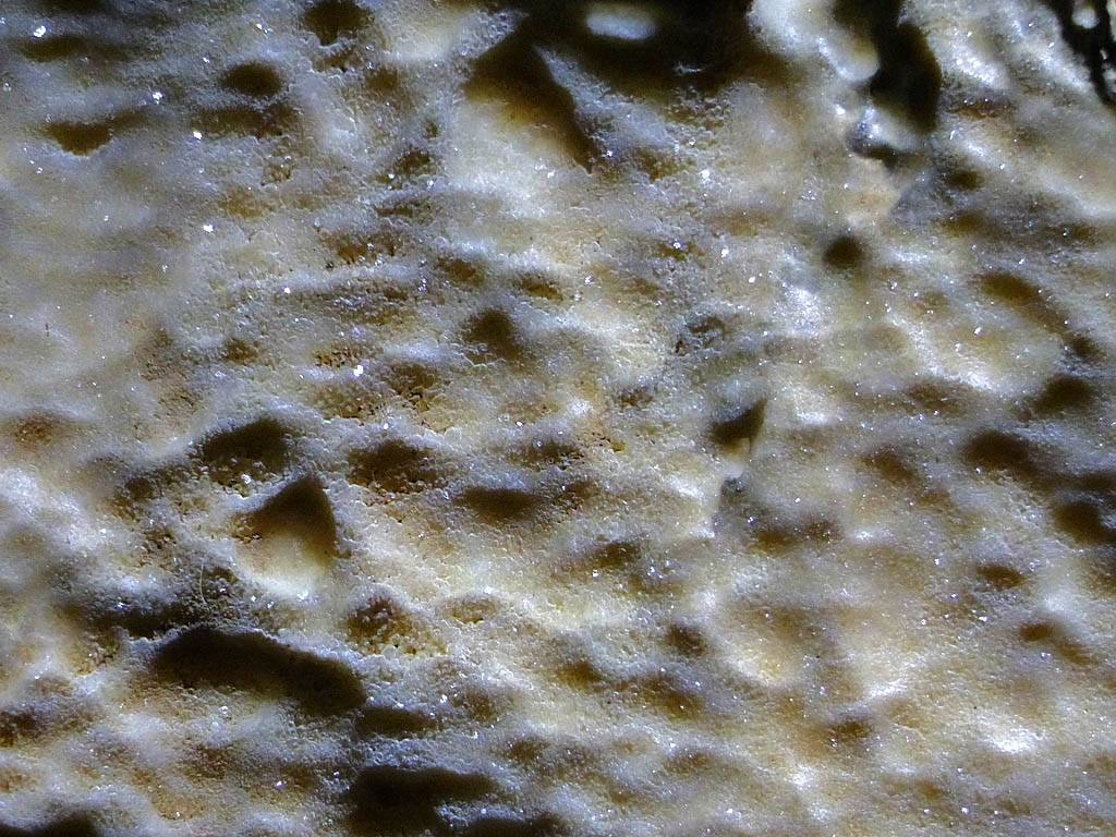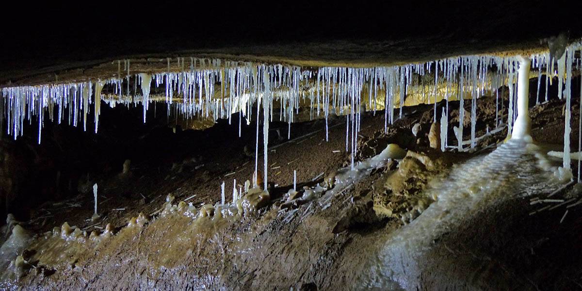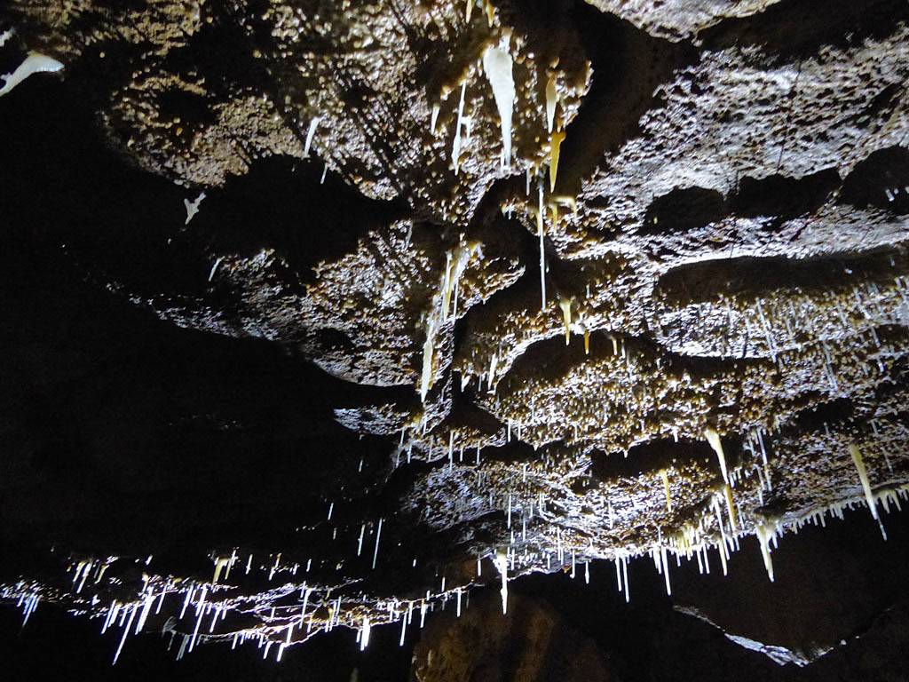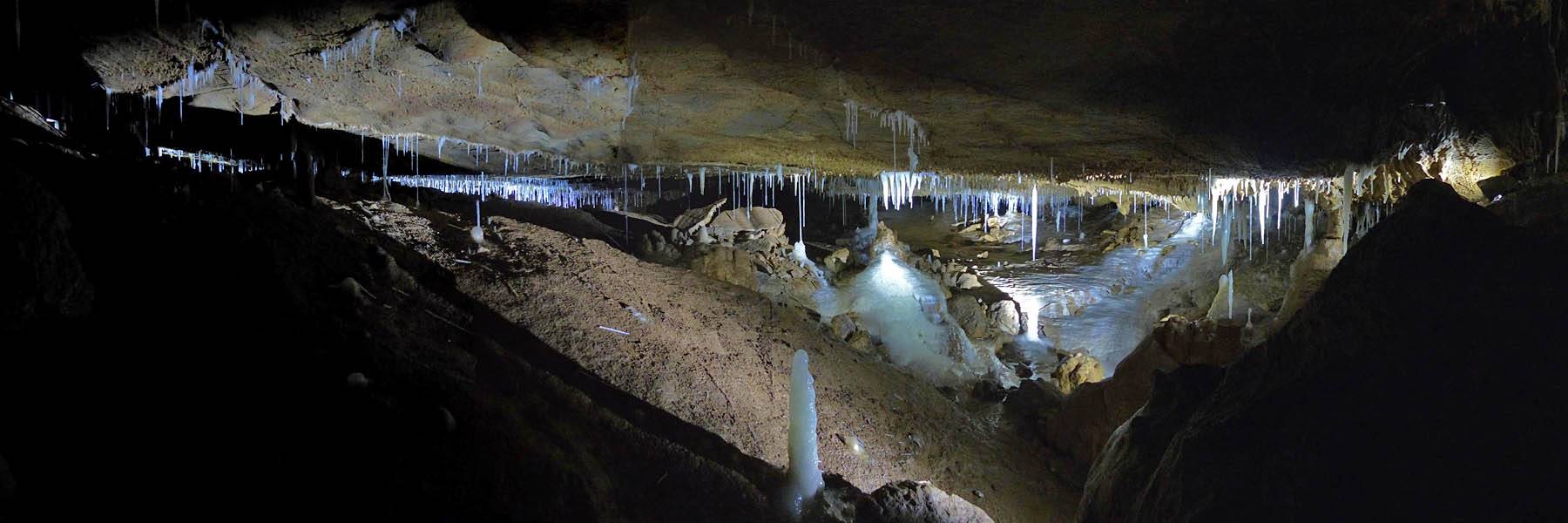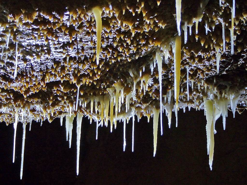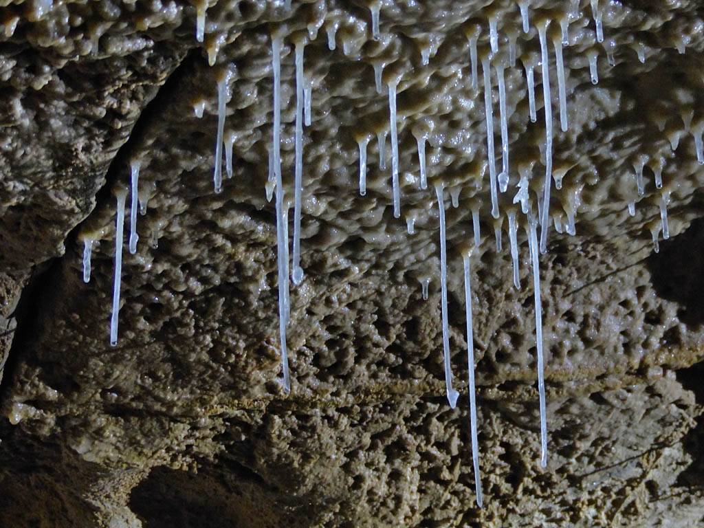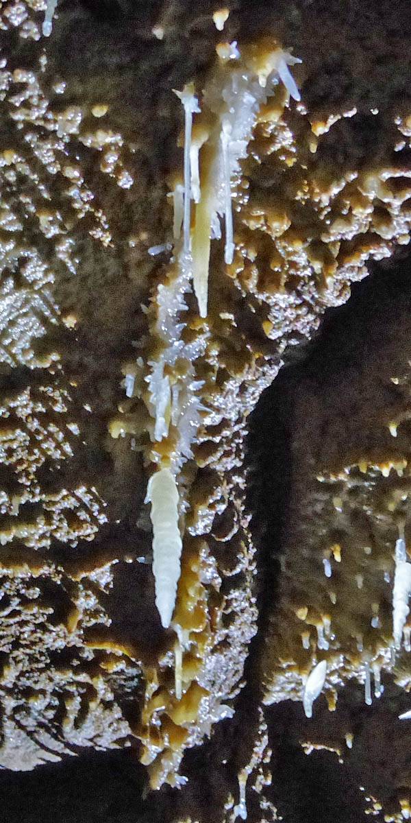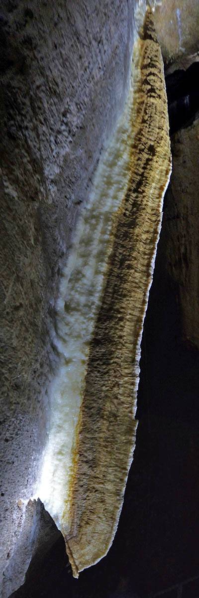 There were stalactites everywhere. The thin ones look like drinking straws and are even hollow, hence the name 'maccaroni'. (They will become stalagtites once the tube blocks up with debris.) | A panorama of the wall near the entrance. |