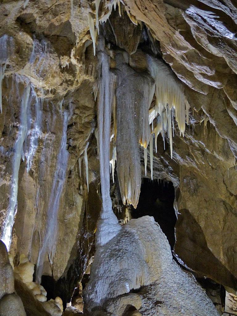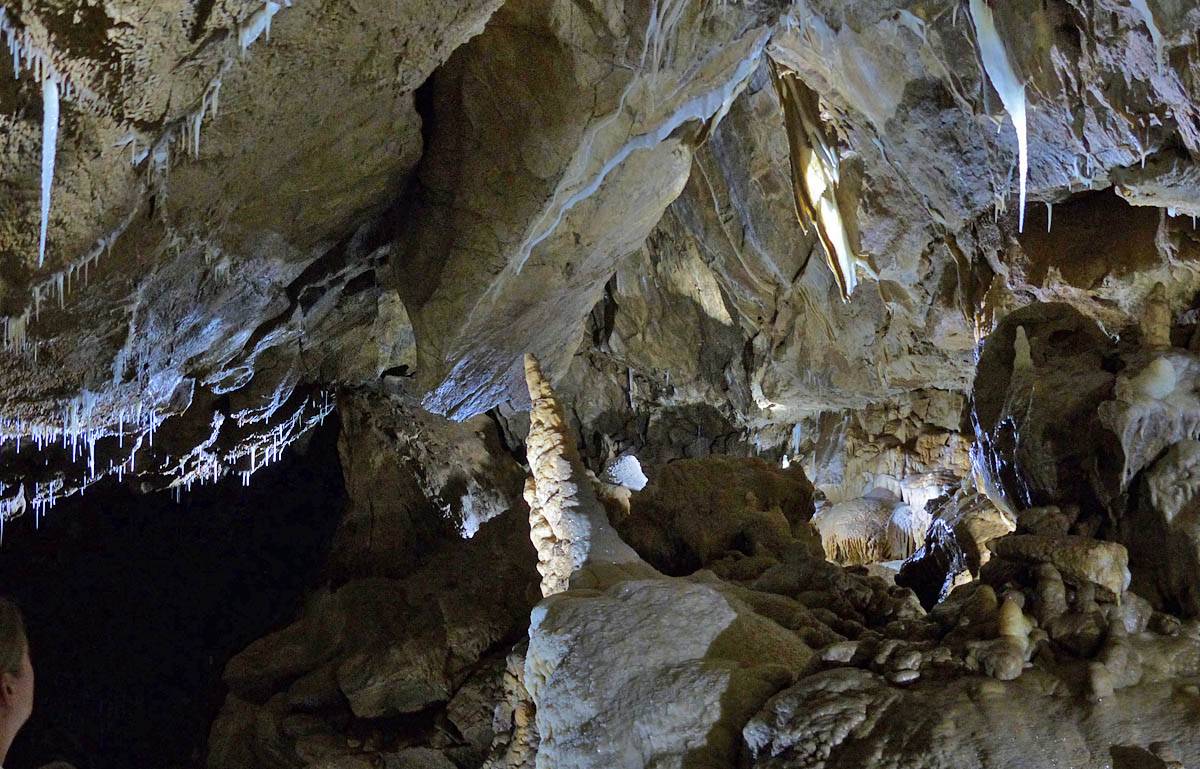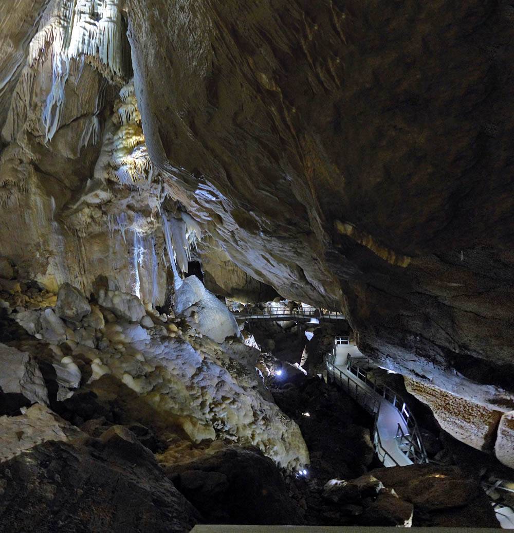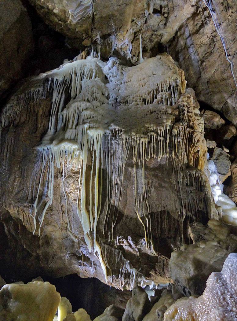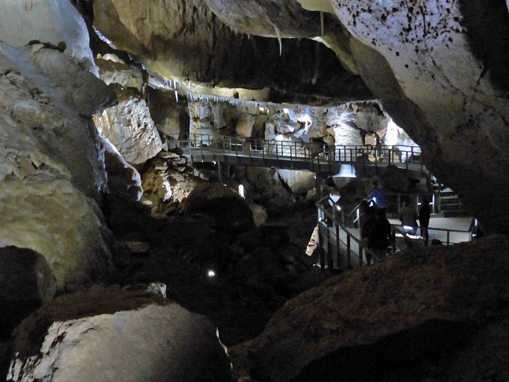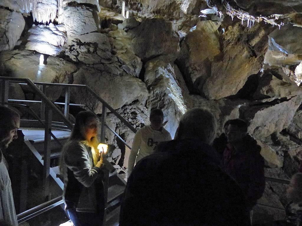 We had to leave our bags in the office in a container but that was ok with me. The previous group emerged just after 12PM gasping for breath and Renée cringed! That was quite amusing. Soon after our group was gathered for a briefing. Then around 12:05PM we headed in a large door and down a steep staircase that took us down a tourist friendly access shaft. Then we went through another door into a spectacular cavern with stalactites and stalagmites, and big and intricate calcite drip formations. The guide said it is 9C down here although I didn't feel cold. The set display started with darkness before revealing sections of cave with lights as we walked along walkways. It started with the hole through which the explorers came and discovered the cavern. The finale was a massive organ like rock face encased in calcite. Once back to the entrance of the cavern we were shown samples of stalagmites to hold as well as bones and fossils found in the cave. This included bones of a cave bear and the remains of a weasel that fell into the cave never to be seen again. This large cavern was only a tiny fraction of the whole system of caves which run for kilometers. Soon it was time to head back up the way we came to emerge at 1:05PM.