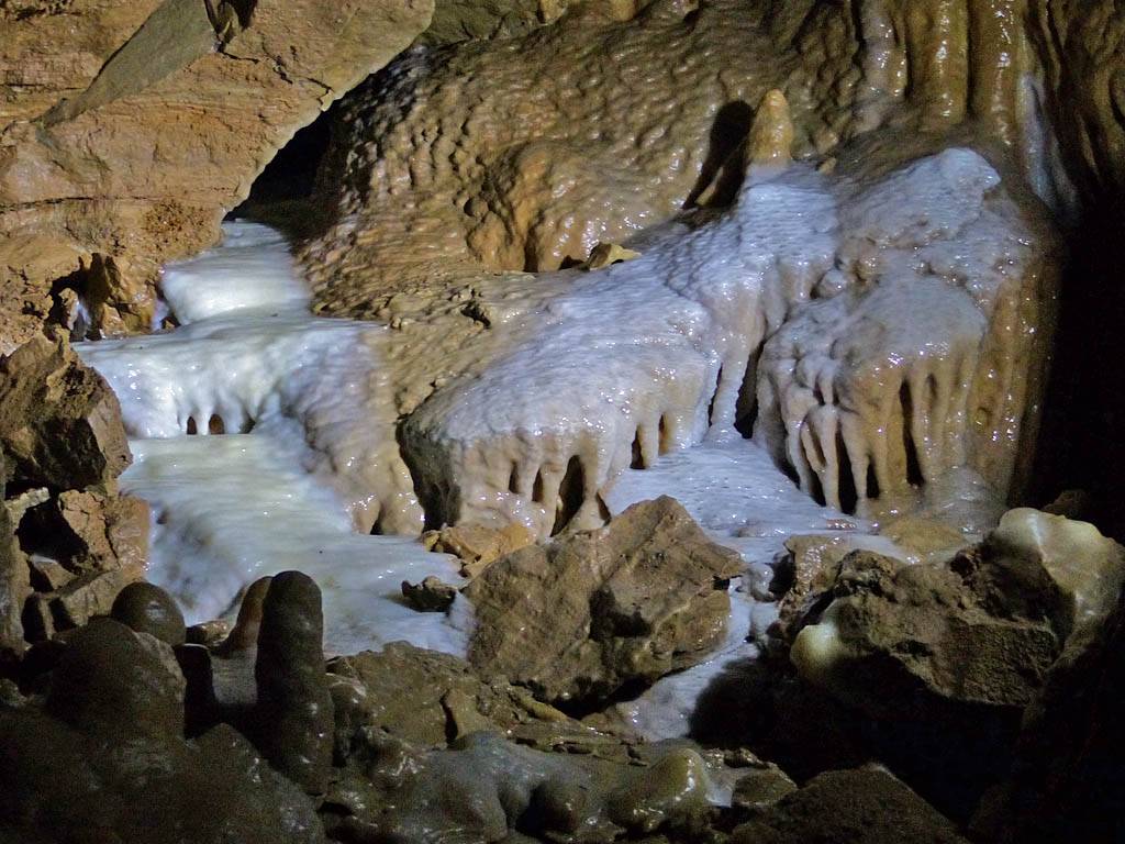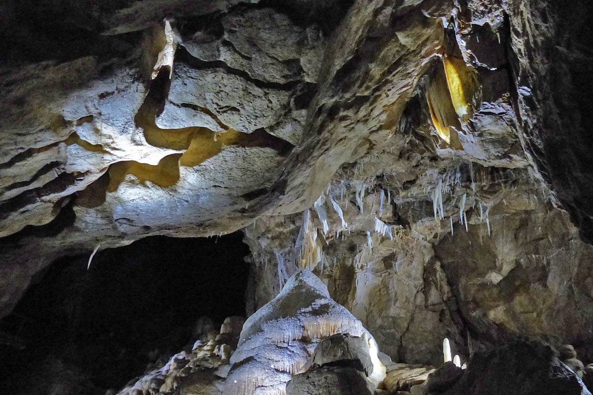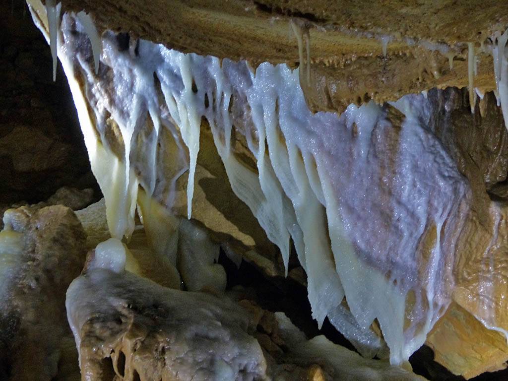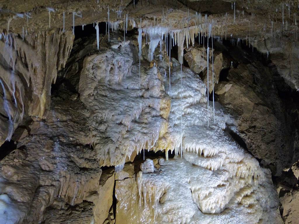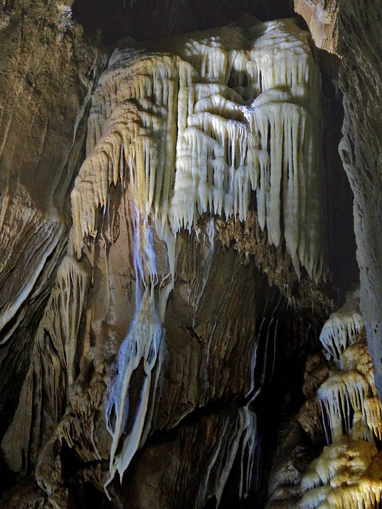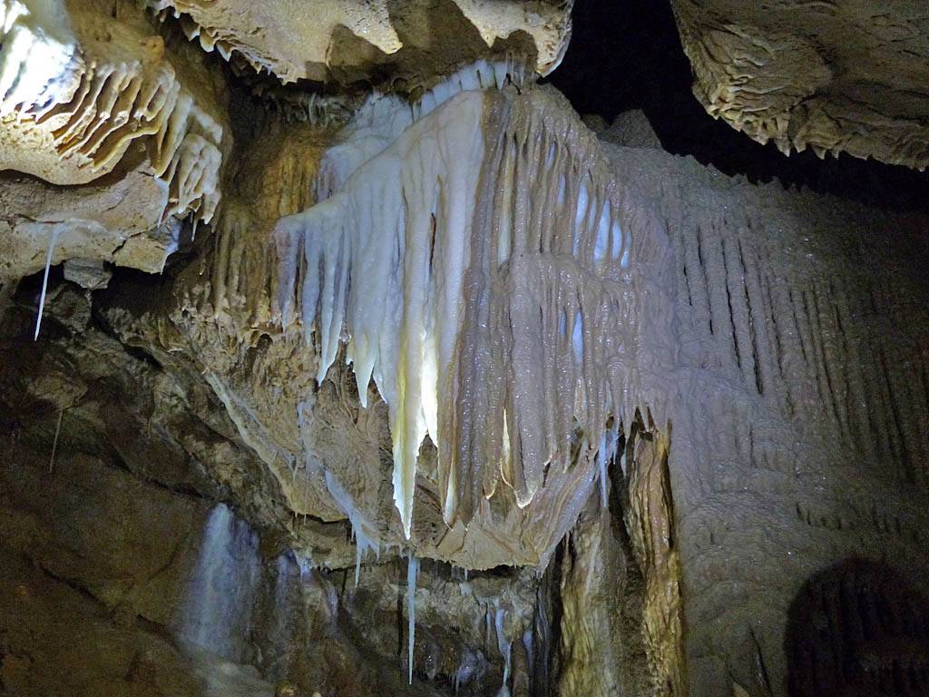 We had to leave our bags in the office in a container but that was ok with me. The previous group emerged just after 12PM gasping for breath and Renée cringed! That was quite amusing. Soon after our group was gathered for a briefing. Then around 12:05PM we headed in a large door and down a steep staircase that took us down a tourist friendly access shaft. Then we went through another door into a spectacular cavern with stalactites and stalagmites, and big and intricate calcite drip formations. The guide said it is 9C down here although I didn't feel cold. The set display started with darkness before revealing sections of cave with lights as we walked along walkways. It started with the hole through which the explorers came and discovered the cavern. The finale was a massive organ like rock face encased in calcite. Once back to the entrance of the cavern we were shown samples of stalagmites to hold as well as bones and fossils found in the cave. This included bones of a cave bear and the remains of a weasel that fell into the cave never to be seen again. This large cavern was only a tiny fraction of the whole system of caves which run for kilometers. Soon it was time to head back up the way we came to emerge at 1:05PM.