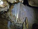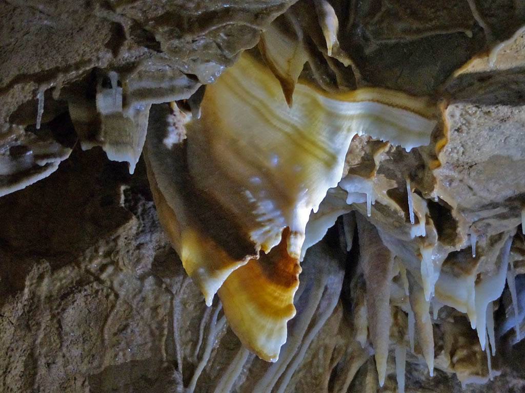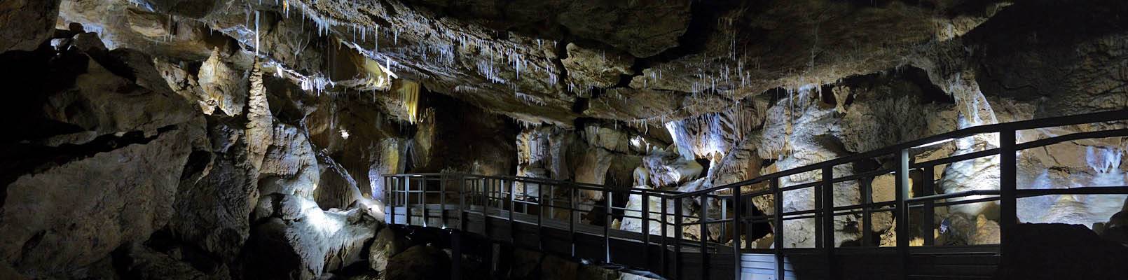 Another pretty and varied stalagtite and stalagmite formation. | Now all the lights are on I was able to capture this matrix panorama looking right across the show cave from the finale area. | Above me is this amazing natural banner. | Another cave view as I descend from the finale area. |
